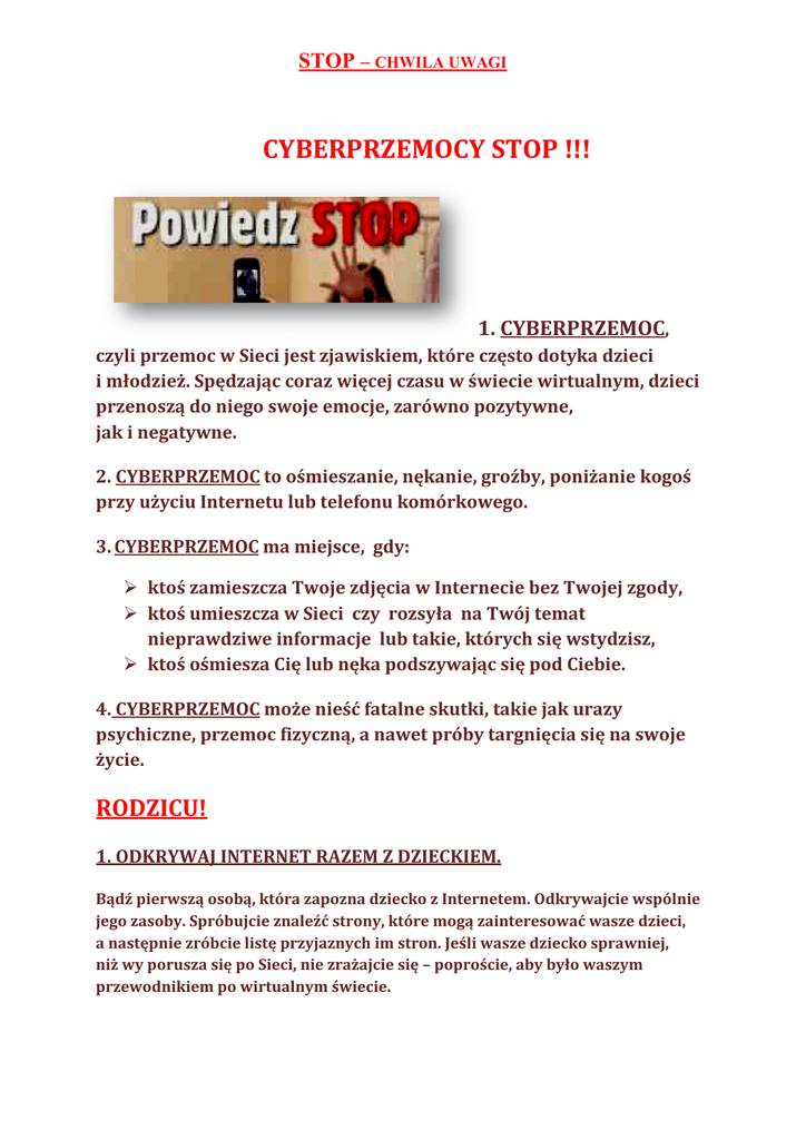 STOP – CHWILA UWAGI CYBERPRZEMOCY STOP !!! 1. CYBERPRZEMOC, czyli przemoc w Sieci jest zjawiskiem, które często dotyka dzieci i młodzież. Spędzając coraz więcej czasu w świecie wirtualnym, dzieci przenoszą do niego swoje emocje, zarówno pozytywne, jak i negatywne. 2. CYBERPRZEMOC to ośmieszanie, nękanie, groźby, poniżanie kogoś przy użyciu Internetu lub telefonu komórkowego. 3. CYBERPRZEMOC ma miejsce, miejsce gdy: ktoś zamieszcza Twoje zdjęcia w Internecie bez Twojej zgody, ktoś umieszcza w Sieci ieci czy rozsyła na Twój temat nieprawdziwe informacje lub takie, których się wstydzisz, ktoś ośmiesza Cię lub nęka podszywając się pod Ciebie. 4. CYBERPRZEMOC może nieść fatalne skutki, takie jak urazy ur psychiczne, przemoc fizyczną, fizyczną, a nawet próby targnięcia się na swoje życie. RODZICU! 1. ODKRYWAJ INTERNET NTERNET RAZEM Z DZIECKIEM. DZIECKIEM Bądź pierwszą osobą, która zapozna dziecko z Internetem.. Odkrywajcie wspólnie jego zasoby. Spróbujcie znaleźć strony, które mogą zainteresować wasze dzieci, a następnie zróbcie listę przyjaznych im stron. Jeśli wasze dziecko sprawniej, niż wy porusza się po Sieci, ieci, nie zrażajcie się – poproście, aby by było waszym przewodnikiem po wirtualnym świecie. 2. NAUCZ DZIECKO PODSTAWOWYCH ZASAD BEZPIECZEŃSTWA W INTERNECIE. Uczul dziecko na niebezpieczeństwa związane z nawiązywaniem nowych znajomości w Internecie. Podkreśl, że nie można ufać osobom poznanym w sieci, ani też wierzyć we wszystko, co o sobie mówią. Ostrzeż dziecko przed ludźmi, którzy mogą chcieć zrobić im krzywdę. Rozmawiaj z dzieckiem o zagrożeniach czyhających w Internecie i sposobach ich unikania. 3. ROZMAWIAJ Z DZIEĆMI O RYZYKU UMAWIANIA SIĘ NA SPOTKANIA Z OSOBAMI POZNANYMI W SIECI. Dorośli powinni zrozumieć, że dzięki Internetowi dzieci mogą nawiązywać przyjaźnie. Jednakże spotykanie się z nieznajomymi poznanymi w sieci może okazać się bardzo niebezpieczne. Dzieci muszą mieć świadomość, że mogą spotykać się z nieznajomymi wyłącznie po uzyskanej zgodzie rodziców i zawsze w towarzystwie dorosłych lub przyjaciół. 4. NAUCZ SWOJE DZIECKO OSTROŻNOŚCI PRZY PODAWANIU SWOICH PRYWATNYCH DANYCH. Dostęp do wielu stron internetowych przeznaczonych dla młodych ludzi wymaga podania prywatnych danych. Ważne jest, aby dziecko wiedziało, że podając takie informacje, zawsze musi zapytać o zgodę swoich rodziców. Powinno zdawać sobie sprawę z niebezpieczeństw, jakie może przynieść podanie swoich danych osobowych. Ustal z nim, żeby nigdy nie podawało przypadkowym osobom swojego imienia, nazwiska, adresu i numeru telefonu. 5. NAUCZ DZIECKO KRYTYCZNEGO PODEJŚCIA DO INFORMACJI PRZECZYTANYCH W SIECI. Wiele dzieci używa Internetu w celu rozwinięcia swoich zainteresowań i poszerzenia wiedzy potrzebnej w szkole. Wszyscy internauci powinni być jednak świadomi, że nie wszystkie znalezione w Sieci informacje są wiarygodne. Naucz dziecko, że trzeba weryfikować znalezione w Internecie treści, korzystając z innych dostępnych źródeł (encyklopedie, książki, słowniki). 6. BĄDŹ WYROZUMIAŁY DLA SWOJEGO DZIECKA. Często zdarza się, że dzieci przypadkowo znajdują się na stronach adresowanych do dorosłych. Bywa, że w obawie przed karą, boją się do tego przyznać. Ważne jest, żeby dziecko ci ufało i mówiło o tego typu sytuacjach; aby wiedziało, że zawsze kiedy poczuje się niezręcznie, coś je zawstydzi lub przestraszy, może się do ciebie zwrócić. 7. ZGŁASZAJ NIELEGALNE I SZKODLIWE TREŚCI. Wszyscy musimy wziąć odpowiedzialność za niewłaściwe czy nielegalne treści w Internecie. Nasze działania w tym względzie pomogą likwidować, np. zjawisko pornografii dziecięcej, szerzące się przy użyciu stron internetowych, chatów, e-maila, itp. Nielegalne treści można zgłaszać na Policję lub do współpracującego z nią punktu kontaktowego ds. zwalczania nielegalnych treści w Internecie – Hotline’u (www.dyzurnet.pl). Hotline kooperuje również z operatorami telekomunikacyjnymi i serwisami internetowymi w celu doprowadzenia do usunięcia nielegalnych materiałów z sieci. 8. ZAPOZNAJ DZIECKO Z NETYKIETĄ - KODEKSEM DOBREGO ZACHOWANIA W INTERNECIE. Przypominaj dzieciom o zasadach dobrego wychowania. W każdej dziedzinie naszego życia, podobnie więc w Internecie obowiązują takie reguły: powinno się być miłym, używać odpowiedniego słownictwa, itp. Twoje dzieci powinny je poznać (nie wolno czytać nie swoich e-maili, kopiować zastrzeżonych materiałów, itp.). 9. POZNAJ SPOSOBY KORZYSTANIA Z INTERNETU PRZEZ TWOJE DZIECKO. Przyjrzyj się, jak Twoje dziecko korzysta z Internetu, jakie strony lubi oglądać i jak zachowuje się w sieci. Staraj się poznać znajomych, z którymi dziecko koresponduje za pośrednictwem Internetu. Ustalcie zasady korzystania z Sieci oraz sposoby postępowania w razie nietypowych sytuacji. 10. PAMIĘTAJ, ŻE POZYTYWNE STRONY INTERNETU PRZEWAŻAJĄ NAD JEGO NEGATYWNYMI STRONAMI. Internet jest doskonałym źródłem wiedzy, jak również dostarczycielem rozrywki. Pozwól swojemu dziecku tylko i wyłącznie w świadomy i bezpieczny sposób w pełni korzystać z oferowanego przez Sieć bogactwa. Źródło: www.dzieckowsieci.pl Jeśli znalazłeś w Sieci lub otrzymałeś przez telefon informacje ośmieszające kogoś - zatrzymaj łańcuszek CYBERPRZEMOCY - nie przesyłaj tych informacji dalej – zgłoś to !!! Pomoc i wsparcie dla rodziców, których dzieci doświadczają zagrożeń online oraz profesjonalistów udzielana jest pod numerem 800 100 100 w Telefonie dla Rodziców i Nauczycieli w sprawie Bezpieczeństwa Dzieci. Pomoc w sytuacjach zagrożenia bezpieczeństwa online dla osób poniżej 18 roku życia dostępna jest w Telefonie Zaufania dla Dzieci i Młodzieży 116 111 oraz na stronie116111.pl. Linie są bezpłatne dla wszystkich telefonów stacjonarnych i komórkowych. Linie obsługiwane s