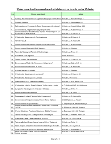 Wykaz organizacji pozarządowych działających na terenie gminy Wolsztyn L.p. Nazwa organizacji Adres 1. Fundacja Absolwentów Liceum Ogólnokształcącego w Wolsztynie Wolsztyn, ul. Poniatowskiego 7 2. Fundacja Janusza Wolsztyn, ul. Słowackiego 2/4 3. Ogólnospołeczna Fundacja dla Dzieci Bezdomnych „Betlejemka” Wolsztyn, ul. Kusocińskiego 5/69 4. Wolsztyn, ul. Kusocińskiego 6 5. Stowarzyszenie „Regionalna Inicjatywa Społeczna” Stowarzyszenie na Rzecz Rozwoju Szpitala Powiatowego im. Dr Roberta Kocha w Wolsztynie 6. Wolsztyńskie Stowarzyszenie Agroturystyczne Wolsztyn, ul. 5 Stycznia 6 7. ROTARY CLUB Wolsztyn, ul. R. Kocha 44 8. Stowarzyszenie Absolwentów Zespołu Szkół Zawodowych Wolsztyn, ul. Kusocińskiego 1 9. Stowarzyszenie Wolsztyński Blok Wyborczy Wolsztyn, ul. Słodowa 1 Wolsztyn, ul. 5 Stycznia 5 10. Forum dla Wolsztyna i Powiatu Wolsztyńskiego Wolsztyn, ul. Prusa 12 11. Wolsztyński Klub Żeglarski Niałek Wielki 60G 12. Stowarzyszenie „Razem Łatwiej” Wolsztyn, ul. 5 Stycznia 14 13. Stowarzyszenie Miłośników Parowozowni „Experience” Wolsztyn, ul. Gajewskich 4A 14. Stowarzyszenie Naukowe im. R. Kocha Wolsztyn, ul. R. Kocha 12 15. Kurkowe Bractwo Strzeleckie Wolsztyn, ul. Słodowa 1 16. Wolsztyńskie Stowarzyszenie „Amazonki” Wolsztyn, ul. 5 Stycznia 20 17. Wolsztyńskie Stowarzyszenie Lotnicze Wolsztyn, Powodowo 1 18. Towarzystwo Kultury Ziemi Wolsztyńskiej Wolsztyn, ul. dr R. Kocha 12A 19. Wielkopolska Lokalna Grupa Działania "Kraina Lasów i Jezior" ul. Pl. Kościuszki 4B, 64-100 Leszno 20. Europejskie Stowarzyszenie Innowacji i Cyfryzacji Wolsztyn, ul. Cicha 16 21. Stowarzyszenie Nasz Wolsztyn Wolsztyn, ul. R.Kocha 12 22. Towarzystwo Przyjaciół Wolsztyńskiej Parowozowni Wolsztyn, ul. R. Kocha 12a 23. Stowarzyszenie Przyjaciół Zespołu Pieśni i Tańca Kębłowo 64-223 Kębłowo, ul. Nowa 8 24. Stowarzyszenie "Przyjaciel Piątki" Stowarzyszenie Aktywnej Rehabilitacji Społecznej i Kulturalnej 25. "AKTIW" ul. Żegockiego 26, 64-200 Wolsztyn 26. Wodne Ochotnicze Pogotowie Ratunkowe Oddział Terenowy ul. Dworcowa 5, 64-200 Wolsztyn 27. Polskie Stowarzyszenie Diabetyków Koło w Wolsztynie Wolsztyn, ul. Roberta Kocha 34 28. Towarzystwo Walki z Kalectwem Koło Wolsztyn Wolsztyn, ul. 5 Stycznia 14 29. Rejonowy Związek Pszczelarzy w Lesznie Koło w Wolsztynie Wolsztyn, ul. Polna 19 30. Polski Związek Emerytów, Rencistów Inwalidów Rejon Wolsztyn Wolsztyn, ul. 5 stycznia 5 31. Polski Czerwony Krzyż Zarząd Rejonowy w Wolsztynie Katolickie Stowarzyszenie ,,Civitas Chrystiana” 32. Oddział terenowy Wolsztyn, ul. Poznańska 32 Wolsztyn, ul. Roberta Kocha 34 Strona 1 z 3 ul. 5 Stycznia 5, 64-200 Wolsztyn 33. Stowarzyszenie Miłośników Historii Wojskowości Drzonów 54, 66-008 Świdnica 34. Wielkopolskie Towarzystwo Techniki Militarnej Chorzemin 78b 35. Wolsztyńskie Stowarzyszenie Przyjaciół Harcerstwa "KRĄG" Wolsztyn, ul. Konopnickiej 1 36. Stowarzyszenie Miłośników Psów Bojowych Wolsztyn, ul. Poznańska 44 37. Stowarzyszenie „Loża Wpływowych” Wolsztyn, ul. Żeromskiego 15 38. Stowarzyszenie „Zdrowy Uśmiech Dziecka” Wolsztyn, ul. Drzymały 18 39. Stowarzyszenie Mieszkańców „Osiedle Leśne” w Chorzeminie 40. WMLKS "Nadodrze" Powodowo Wolsztyn, ul. Konopnickiej 16/12 Zespół Szkół Rolniczych i Technicznych Powodowo 1, 64-200 Wolsztyn 41. Klub Sportowy "Grom" Wolsztyn ul. Kusocińskiego 12, 64-200 Wolsztyn 42. Towarzystwo Sportowe "Old-Boy" Wolsztyn ul. Kusocińskiego 1, 64-200 Wolsztyn 43. Klub Piłki Ręcznej "Wolsztyniak" Wolsztyn ul. Wschowska 15, 64-200 Wolsztyn 44. Powiatowe Zrzeszenie Ludowe Zespoły Sportowe w Wolsztynie ul. 5 Stycznia 5, 64-200 Wolsztyn 45. Parafialny Klub Rekreacyjno-Sportowy "Józef" Wolsztyn ul. Komorowska 3, 64-200 Wolsztyn 46. „Jazda Wolsztyn” ul. 5 Stycznia 15a, 64-200 Wolsztyn 47. Ognisko Towarzystwa Krzewienia Kultury Fizycznej "Słoneczko" ul. Poniatowskiego 40/1, 64-200 Wolsztyn 48. Wolsztyński Klub Sportów Górskich SP Nr 1 w Wolsztynie, ul. Poniatowskiego 1 49. Klub Tańca Sportowego „LATINA” Jednostka Terenowa Mundurowego Klubu Motorowego 50. Rzeczpospolitej Polskiej, Region Wolsztyn ul. Dąbrowskiego 2, 64-200 Wolsztyn 51. Stowarzyszenie Turystyka Rekreacja Sport H2O Karpicko, Plac Wiejski 1 52. Klub Rugby "Lokomotywa" Wolsztyn Wolsztyn, ul. Konopnickiej 6/18 53. Stowarzyszenie Kultury Fizycznej ,,Bäm'' Komorowo 25A/6, 64-200 Wolsztyn 54. Stowarzyszenie Kultury Fizycznej ,,TRI EXPERTS WOLSZTYN'' ul. 5 Stycznia 54, 64-200 Wolsztyn 55. Stowarzyszenie Kultury Fizycznej ,,Wolsztyński Klub Biegowy'' ul. Poznańska 1, 64-200 Wolsztyn 56. Uczniowski Klub Sportowy „Gepard” Wolsztyn ZSS Nr 4, ul. 5 Stycznia 14, 64-200 Wolsztyn 57. Uczniowski Klub Sportowy „Leśnik Junior” Świętno Szkoła Podstawowa, ul. Szkolna 3, 64-224 Świętno 58. Uczniowski Klub Sportowy przy ZSRiT Powodowo ZSRiT Powodowo 1, 64-200 Wolsztyn 59. Uczniowski Klub Sportowy „Mustang” Obra Gimnazjum w Obrze, ul. Szkolna 19, 64-211 Obra 60. Uczniowski Klub Sportowy „Szach” Wolsztyn WDK, ul. 5 Stycznia 20, 64-200 Wolsztyn 61. Uczniowski Klub Sportowy „Junior" Kębłowo ul. Stradyńska 15 a, 64-223 Kębłowo 62. Ludowy Zespół Sportowy „Sokół” Wroniawy 64-233 Wroniawy 63. Ludowy Zespół Sportowy "Leśnik" Świętno ul. Mickiewicza 15, 64-211 Świętno 64. Wolsztyński Klub Skata "Ramsz" Wolsztyn Cech Rzemiosł Różnych, ul. Słodowa 1, Wolsztyn 65. Ludowy Zespół Sportowy "Dąb" Kębłowo ul. Osiedlowa 27, 64-223 Kębłowo 66. Ludowy Zespół Sportowy "Czantoria" Gościeszyn Gościeszyn 11/2, 64-200 Wolsztyn Strona 2 z 3 ul. Poniatowskiego 19, 64-200 Wolsztyn 67. Ludowy Zespół Sportowy "Znicz" Obra ul. Wolsztyńska, 64-211 Obra 68. Ludowy Klub Sportowy Nowy Solec Solec Nowy 19, 64-200 Wolsztyn 69. Uczniowski Międzyszkolny Klub Sportowy „Iskra” Wolsztyn ul. Poniatowskiego 7 , 64-200 Wolsztyn 70. Młodzieżowy Ludowy Klub Sportowy „ORKAN” Chorzemin 71. Uczniowski Miejsk