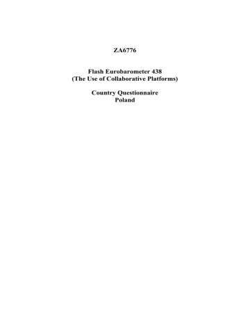 ZA6776 Flash Eurobarometer 438 (The Use of Collaborative Platforms) Country Questionnaire Poland Platforma współpracy to narzędzie internetowe, które umożliwia transakcje między osobami świadczącymi usługi i korzystającymi z nich. Takie platformy mogą być wykorzystywane w odniesieniu do szerokiego zakresu usług: od wynajmu lokali i wspólnych przejazdów samochodem po drobne prace domowe. Q1 Które z następujących stwierdzeń odzwierciedla Pana/i doświadczenia dotyczące tego rodzaju platform? (ODCZYTAJ ‐ TYLKO JEDNA ODPOWIEDŹ) Nigdy nie słyszałem/am o takich platformach Słyszałem/am o takich platformach, ale nigdy ich nie odwiedzałem/am (2001) 1 2 Byłem/am na jednej lub kilku takich platformach i raz zapłaciłem/am za usługę Korzystam z usług takich platform od czasu do czasu (raz na kilka miesięcy) 3 4 Regularnie korzystam z usług takich platform (co najmniej w każdym miesiącu) Inne (NIE ODCZYTUJ) Żadne (NIE ODCZYTUJ) Nie wiem/brak odpowiedzi (NIE ODCZYTUJ) 5 6 7 8 NEW EB1438PLXTRA 1/4 11/03/2016 FILTR: ZADAJ Q2, JEŻELI KODY 3, 4 LUB 5 W Q1 Q2 Czy kiedykolwiek świadczył/a Pan/i usługi na takich platformach? (ODCZYTAJ ‐ TYLKO JEDNA ODPOWIEDŹ) Nie, nigdy. Oferowałem/am usługę na jednej lub kilku z tych platform co najmniej raz (2002) 1 2 Oferuję usługi przez te platformy od czasu do czasu (raz na kilka miesięcy) Regularnie oferuję usługi przez te platformy (w każdym miesiącu) Inne (NIE ODCZYTUJ) Żadne (NIE ODCZYTUJ) Nie wiem/brak odpowiedzi (NIE ODCZYTUJ) 3 4 5 6 7 NEW EB1438PLXTRA 2/4 11/03/2016 FILTR: ZADAJ Q3 I Q4, JEŻELI KODY 2, 3, 4 LUB 5 W Q1 PROG: ZMIENIAJ LOSOWO KOLEJNOŚĆ KODÓW OD 1 DO 4 PROG: KODY 6 i 7 TO KODY WYKLUCZAJĄCE INNE ODPOWIEDZI Q3 Jakie są Pana/i zdaniem główne zalety tego rodzaju platform dla ich użytkowników w porównaniu z tradycyjnym handlem towarami i usługami? (ODCZYTAJ ‐ MAKSYMALNIE DWIE ODPOWIEDZI) Jest to tańsze lub darmowe Oferowane są nowe lub odmienne usługi Dostęp do usług jest zorganizowany w bardziej dogodny sposób Możliwość wymiany produktów lub usług zamiast płacenia pieniędzmi Inne (NIE ODCZYTUJ) Żadne (NIE ODCZYTUJ) Nie wiem/brak odpowiedzi (NIE ODCZYTUJ) (2003‐2009) 1, 2, 3, 4, 5, 6, 7, NEW EB1438PLXTRA 3/4 11/03/2016 PROG: ZMIENIAJ LOSOWO KOLEJNOŚĆ KODÓW OD 1 DO 5 PROG: KODY 7 i 8 TO KODY WYKLUCZAJĄCE INNE ODPOWIEDZI Q4 Jakie są Pana/i zdaniem główne problemy osób korzystających z usług oferowanych na tych platformach w porównaniu z tradycyjnym handlem towarami i usługami? (ODCZYTAJ ‐ MAKSYMALNIE DWIE ODPOWIEDZI) Nie wiadomo, kto jest odpowiedzialny, gdy pojawi się problem Rozczarowanie spowodowane tym, że usługi i towary nie spełniają oczekiwań Brak wystarczających informacji na temat świadczonej usługi Brak zaufania do dostawcy lub sprzedawcy Brak zaufania do transakcji internetowych ogółem Inne (NIE ODCZYTUJ) Żadne (NIE ODCZYTUJ) Nie wiem/brak odpowiedzi (NIE ODCZYTUJ) (2010‐2017) 1, 2, 3, 4, 5, 6, 7, 8, NEW EB1438PLXTRA 4/4 11/03/2016