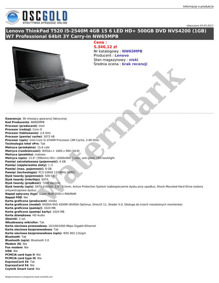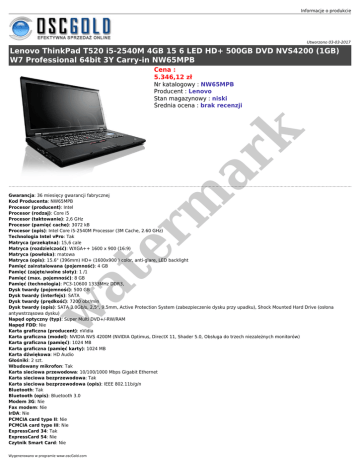 Informacje o produkcie Utworzono 03-03-2017 Lenovo ThinkPad T520 i5-2540M 4GB 15 6 LED HD+ 500GB DVD NVS4200 (1GB) W7 Professional 64bit 3Y Carry-in NW65MPB Cena : 5.346,12 zł er m ar k Nr katalogowy : NW65MPB Producent : Lenovo Stan magazynowy : niski Średnia ocena : brak recenzji w at Gwarancja: 36 miesięcy gwarancji fabrycznej Kod Producenta: NW65MPB Procesor (producent): Intel Procesor (rodzaj): Core i5 Procesor (taktowanie): 2,6 GHz Procesor (pamięć cache): 3072 kB Procesor (opis): Intel Core i5-2540M Processor (3M Cache, 2.60 GHz) Technologia Intel vPro: Tak Matryca (przekątna): 15,6 cale Matryca (rozdzielczość): WXGA++ 1600 x 900 (16:9) Matryca (powłoka): matowa Matryca (opis): 15.6" (396mm) HD+ (1600x900 ) color, anti-glare, LED backlight Pamięć zainstalowana (pojemność): 4 GB Pamięć (zajęte/wolne sloty): 1 /1 Pamięć (max. pojemność): 8 GB Pamięć (technologia): PC3-10600 1333MHz DDR3, Dysk twardy (pojemność): 500 GB Dysk twardy (interfejs): SATA Dysk twardy (prędkość): 7200 obr/min Dysk twardy (opis): SATA 3.0Gb/s, 2,5", 9,5mm, Active Protection System (zabezpieczenie dysku przy upadku), Shock Mounted Hard Drive (osłona antywstrząsowa dysku) Napęd optyczny (typ): Super Multi DVD+/-RW/RAM Napęd FDD: Nie Karta graficzna (producent): nVidia Karta graficzna (model): NVIDIA NVS 4200M (NVIDIA Optimus, DirectX 11, Shader 5.0, Obsługa do trzech niezależnych monitorów) Karta graficzna (pamięć): 1024 MB Karta graficzna (pamięć karty): 1024 MB Karta dźwiękowa: HD Audio Głośniki: 2 szt. Wbudowany mikrofon: Tak Karta sieciowa przewodowa: 10/100/1000 Mbps Gigabit Ethernet Karta sieciowa bezprzewodowa: Tak Karta sieciowa bezprzewodowa (opis): IEEE 802.11b/g/n Bluetooth: Tak Bluetooth (opis): Bluetooth 3.0 Modem 3G: Nie Fax modem: Nie IrDA: Nie PCMCIA card type II: Nie PCMCIA card type III: Nie ExpressCard 34: Tak ExpressCard 54: Nie Czytnik Smart Card: Nie Wygenerowano w programie www.oscGold.com w at er m ar k E-SATA: Tak Czytnik linii papilarnych: Tak Platforma szyfrująca TPM: Tak Kensington Lock: Tak Display Port: Tak DVI-D: Nie HDMI: Nie VGA (RGB): Tak S-video/TV-out: Nie AV-in (Tuner TV): Nie Line-in: Nie Line-out: Tak Wejście mikrofonu: Tak S/PDIF: Nie LPT (równoległy): Nie RS232 (szeregowy): Nie Moduł GPS: Nie Czytnik kart pamięci: Tak Czytnik kart pamięci (opis): 4-in-1 (MMC, SD, SDHC, SDXC) Panel klawiszy multimedialnych: Nie Złącze replikatora portów: Tak Fire-Wire (IEEE1394): Nie USB 2.0: 4 szt. System operacyjny: Windows 7 Professional 64 bit System operacyjny (wer. Językowa): polski Dodatkowe oprogramowanie: ThinkVantage System Update; ThinkVantage Power Manager; ThinkVantage Toolbox; Microsoft Office 2010 Starter; Adobe Reader; Rescue and Recovery; Access Connections; Fingerprint Software (fingerprint models); Password Manager (fingerprint models) , Windows Live Essentials; Corel WinDVD (DVD-RW); Corel Burn.Now Lenovo Edition(DVD-RW); Corel DVD MovieFactory Wbudowana kamera: Tak Wbudowana kamera (opis): Zintegrowana kamera internetowa HD720p Wbudowana kamera obrotowa: Nie Urządzenie wskazujące: Multitouch Touchpad UltraNav, TrackPoint Akumulator (technologia): Litowo-Jonowa, 6 komorowa 57WHr Akumulator (czas pracy): 7 h Wymiary (wysokość): 31-36 mm Wymiary (szerokość): 373 mm Wymiary (głębokość): 245 mm Waga: 2,57 kg Gwarancja: 36 mies Gwarancja międzynarodowa: Tak Gwarancja baterii: 12 mies Wyposażenie: zasilacz sieciowy 65-watt AC, Karta gwarancyjna, Opcjonalne wyposażenie: stacja dokująca ThinkPad Mini Dock Series 3 (45N6678), bateria ThinkPad Battery 55++ (9-cell) (57Y4186), Modem WWAN (0A36186) Opis: Opcja 3G (WWAN), Oświetlana klawiatura odporna na zalanie, Obudowa z włókna węglowego i magnezu Serwis producenta: http://www.lenovo.com/service... Podświetlana klawiatura: Nie Modem 3G (opis): Opcja zamontowania 3G (WWAN)