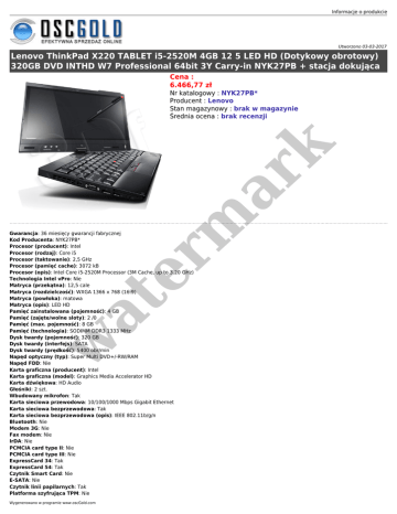 Informacje o produkcie Utworzono 03-03-2017 Lenovo ThinkPad X220 TABLET i5-2520M 4GB 12 5 LED HD (Dotykowy obrotowy) 320GB DVD INTHD W7 Professional 64bit 3Y Carry-in NYK27PB + stacja dokująca Cena : 6.466,77 zł er m ar k Nr katalogowy : NYK27PB* Producent : Lenovo Stan magazynowy : brak w magazynie Średnia ocena : brak recenzji w at Gwarancja: 36 miesięcy gwarancji fabrycznej Kod Producenta: NYK27PB* Procesor (producent): Intel Procesor (rodzaj): Core i5 Procesor (taktowanie): 2,5 GHz Procesor (pamięć cache): 3072 kB Procesor (opis): Intel Core i5-2520M Processor (3M Cache, up to 3.20 GHz) Technologia Intel vPro: Nie Matryca (przekątna): 12,5 cale Matryca (rozdzielczość): WXGA 1366 x 768 (16:9) Matryca (powłoka): matowa Matryca (opis): LED HD Pamięć zainstalowana (pojemność): 4 GB Pamięć (zajęte/wolne sloty): 2 /0 Pamięć (max. pojemność): 8 GB Pamięć (technologia): SODIMM DDR3 1333 MHz Dysk twardy (pojemność): 320 GB Dysk twardy (interfejs): SATA Dysk twardy (prędkość): 5400 obr/min Napęd optyczny (typ): Super Multi DVD+/-RW/RAM Napęd FDD: Nie Karta graficzna (producent): Intel Karta graficzna (model): Graphics Media Accelerator HD Karta dźwiękowa: HD Audio Głośniki: 2 szt. Wbudowany mikrofon: Tak Karta sieciowa przewodowa: 10/100/1000 Mbps Gigabit Ethernet Karta sieciowa bezprzewodowa: Tak Karta sieciowa bezprzewodowa (opis): IEEE 802.11b/g/n Bluetooth: Nie Modem 3G: Nie Fax modem: Nie IrDA: Nie PCMCIA card type II: Nie PCMCIA card type III: Nie ExpressCard 34: Tak ExpressCard 54: Tak Czytnik Smart Card: Nie E-SATA: Nie Czytnik linii papilarnych: Tak Platforma szyfrująca TPM: Nie Wygenerowano w programie www.oscGold.com w at er m ar k Kensington Lock: Tak Display Port: Tak DVI-D: Nie HDMI: Nie VGA (RGB): Tak S-video/TV-out: Nie AV-in (Tuner TV): Nie Line-in: Nie Line-out: Tak Wejście mikrofonu: Tak S/PDIF: Nie LPT (równoległy): Nie RS232 (szeregowy): Nie Moduł GPS: Nie Czytnik kart pamięci: Tak Czytnik kart pamięci (opis): MMC, SD, SDHC, SDXC Panel klawiszy multimedialnych: Nie Złącze replikatora portów: Tak Fire-Wire (IEEE1394): Nie USB 2.0: 3 szt. System operacyjny: Windows 7 Professional 64 bit System operacyjny (wer. Językowa): polski Wbudowana kamera: Nie Wbudowana kamera obrotowa: Nie Urządzenie wskazujące: Touchpad, Trackpoint Akumulator (technologia): Litowo-Jonowa, 6 komorowa Wymiary (wysokość): 27-31 mm Wymiary (szerokość): 305 mm Wymiary (głębokość): 229 mm Waga: 1,8 kg Gwarancja: 36 mies Gwarancja międzynarodowa: Tak Gwarancja baterii: 12 mies Wyposażenie: zasilacz sieciowy, stacja dokująca ThinkPad Mini Dock Series 3 , ThinkPad DVD Burner Ultrabay Slim 9.5mm Drive II - SATA , Opcjonalne wyposażenie: bateria ThinkPad Battery 44++ (9 cell) (0A36307), Modem WWAN (0A36319) Podświetlana klawiatura: Nie Modem 3G (opis): Opcja zamontowania 3G (WWAN) Wbudowana kamera (opis): Zintegrowana kamera internetowa HD720p Opis: WWAN Opcja, 2x2 WLAN, Oświetlana klawiatura odporna na zalanie, Obudowa z magnezu