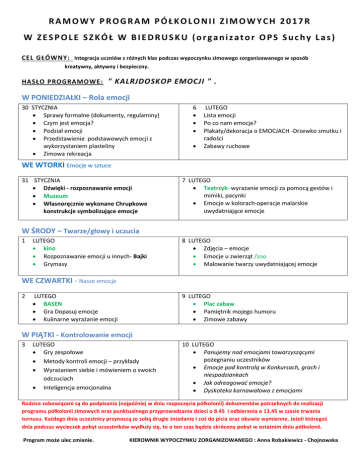 RAMOWY PROGRAM PÓŁKOLONII ZIMOWYCH 2017R W ZESPOLE SZKÓŁ W BIEDRUSKU (organizator OPS Suchy Las) CEL GŁÓWNY: Integracja uczniów z różnych klas podczas wypoczynku zimowego zorganizowanego w sposób kreatywny, aktywny i bezpieczny. HASŁO PROGRAMOWE: " KALRJDOSKOP EMOCJI " . W PONIEDZIAŁKI – Rola emocji 30 STYCZNIA Sprawy formalne (dokumenty, regulaminy) Czym jest emocja? Podział emocji Przedstawienie podstawowych emocji z wykorzystaniem plasteliny Zimowa rekreacja 6 LUTEGO Lista emocji Po co nam emocje? Plakaty/dekoracja o EMOCJACH -Drzewko smutku i radości Zabawy ruchowe WE WTORKI Emocje w sztuce 31 STYCZNIA Dźwięki - rozpoznawanie emocji Muzeum Własnoręcznie wykonane Chrupkowe konstrukcje symbolizujące emocje 7 LUTEGO Teatrzyk- wyrażanie emocji za pomocą gestów i mimiki, pacynki Emocje w kolorach-operacje malarskie uwydatniające emocje W ŚRODY – Twarze/głowy i uczucia 1 LUTEGO kino Rozpoznawanie emocji u innych- Bajki Grymasy 8 LUTEGO Zdjęcia – emocje Emocje u zwierząt /zoo Malowanie twarzy uwydatniającej emocje WE CZWARTKI - Nasze emocje 2 LUTEGO BASEN Gra Dopasuj emocje Kulinarne wyrażanie emocji 9 LUTEGO Plac zabaw Pamiętnik mojego humoru Zimowe zabawy W PIĄTKI - Kontrolowanie emocji 3 LUTEGO Gry zespołowe Metody kontroli emocji – przykłady Wyrażaniem siebie i mówieniem o swoich odczuciach Inteligencja emocjonalna 10 LUTEGO Panujemy nad emocjami towarzyszącymi pożegnaniu uczestników Emocje pod kontrolą w Konkursach, grach i niespodziankach Jak odreagować emocje? Dyskoteka karnawałowa z emocjami Rodzice zobowiązani są do podpisania (najpóźniej w dniu rozpoczęcia półkolonii) dokumentów potrzebnych do realizacji programu półkolonii zimowych oraz punktualnego przyprowadzania dzieci o 8.45 i odbierania o 13.45 w czasie trwania turnusu. Każdego dnia uczestnicy przynoszą ze sobą drugie śniadanie i coś do picia oraz obuwie wymienne. Jeżeli któregoś dnia podczas wycieczek pobyt uczestników wydłuży się, to o ten czas będzie skrócony pobyt w ostatnim dniu półkolonii. Program może ulec zmianie. KIEROWNIK WYPOCZYNKU ZORGANIZOWANEGO : Anna Robakiewicz - Chojnowska