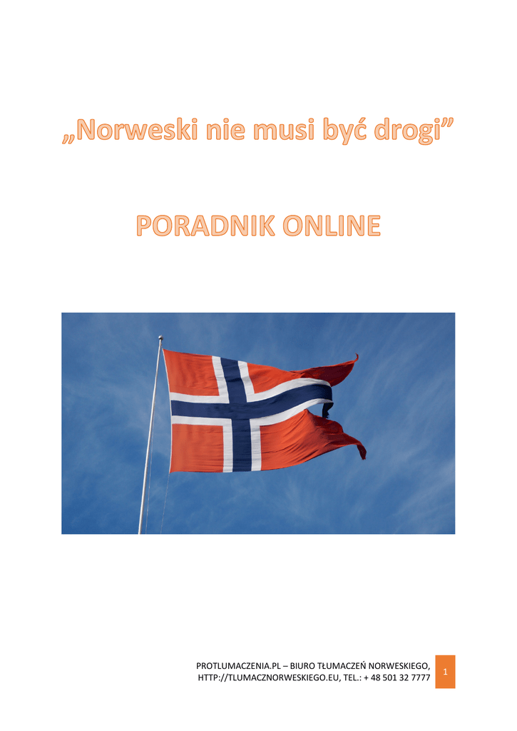 PROTLUMACZENIA.PL – BIURO TŁUMACZEŃ NORWESKIEGO, HTTP://TLUMACZNORWESKIEGO.EU, TEL.: + 48 501 32 7777 1 „Norweski nie musi być drogi” to nasz nowy poradnik, mający na celu zapewnienie Państwu wskazówek służących uzyskaniu dobrych cen na przekłady polsko norweskie oraz norwesko polskie. Wśród pobudek determinujących powstanie tego ebooka prym wiodły doświadczenia naszych klientów. Jako biuro tłumaczeń norweskiego staramy się bowiem, dostarczać Państwu wysokiej jakości przekłady w rozsądnych cenach. Dla przypomnienia nasza firma została utworzona w 2012 roku w Grudziądzu. Z lokalnego biura szybko przekształciliśmy się w firmę realizującą przekłady za pośrednictwem Internetu. Zaufanie, jakie wzbudziliśmy wśród naszych klientów zaowocowało utworzeniem kolejnych oddziałów na ternie Bydgoszczy oraz Świecia. W ślad za naszymi doświadczeniami możemy śmiało stwierdzić, że największy wpływ na cenę translacji wywierają: „Norweski nie musi być drogi” – poradnik online • Prawidłowo wybrane zakresy translacji – wiele maili, zwłaszcza korporacyjnych posiada w stopce slogan: „pomyśl dwa razy, zanim wydrukujesz”. Hasło ma na celu oszczędności nie tylko finansowe, ale również środowiskowe. Podobnie powinno być z translacjami. Warto upewnić się, co do zakresu tłumaczenia. Dobrym sposobem, jest poproszenie Strony oczekującej przekładu o spisanie dokumentów PROTLUMACZENIA.PL – BIURO TŁUMACZEŃ NORWESKIEGO, HTTP://TLUMACZNORWESKIEGO.EU, TEL.: + 48 501 32 7777 2 niezbędnych do załatwienia określonej sprawy. Trzeba pamiętać o tym, że strona tłumaczenia przysięgłego to raptem 1125 znaków ze spacjami. Nawet mała partia tekstu, może więc poczynić określone koszty. • Nie zlecanie tłumaczeń na „łapu capu” – mając do przygotowania tłumaczenia z języka norweskiego, decyzję o wyborze wykonawcy nie warto podejmować na ostatnią chwilę. Gro biur tłumaczeń dolicza sobie określoną prowizję za pośpiech. Protlumaczenia.pl, co prawda nie stosują tego rodzaju praktyk, ale bywają sytuacje, że jesteśmy w sytuacji „bez wyjścia”. Mowa tutaj zwłaszcza o przekładach specjalistycznych zlecanych „na wczoraj”. • Śledzenie aktualnych promocji – tłumaczenia polsko norweskiego oraz norwesko polskie podlegają zasadom gry rynkowej. Jej naturalnym elementem są akcje, mające na celu przyciągnięcie nowych klientów. Jeśli więc Państwa przekłady mogą zaczekać, warto śledzić aktualne promocje biur tłumaczeń. Również nasza firma nie pozostaje tutaj bierna. W ciągu roku wielokrotnie przeceniamy nasze usługi, przy zachowaniu najwyższych parametrów jakościowych. Więcej o naszym biurze tłumaczeń norweskiego, można przeczytać pod adresem: http://tlumacznorweskiego.eu/ PROTLUMACZENIA.PL – BIURO TŁUMACZEŃ NORWESKIEGO, HTTP://TLUMACZNORWESKIEGO.EU, TEL.: + 48 501 32 7777 3