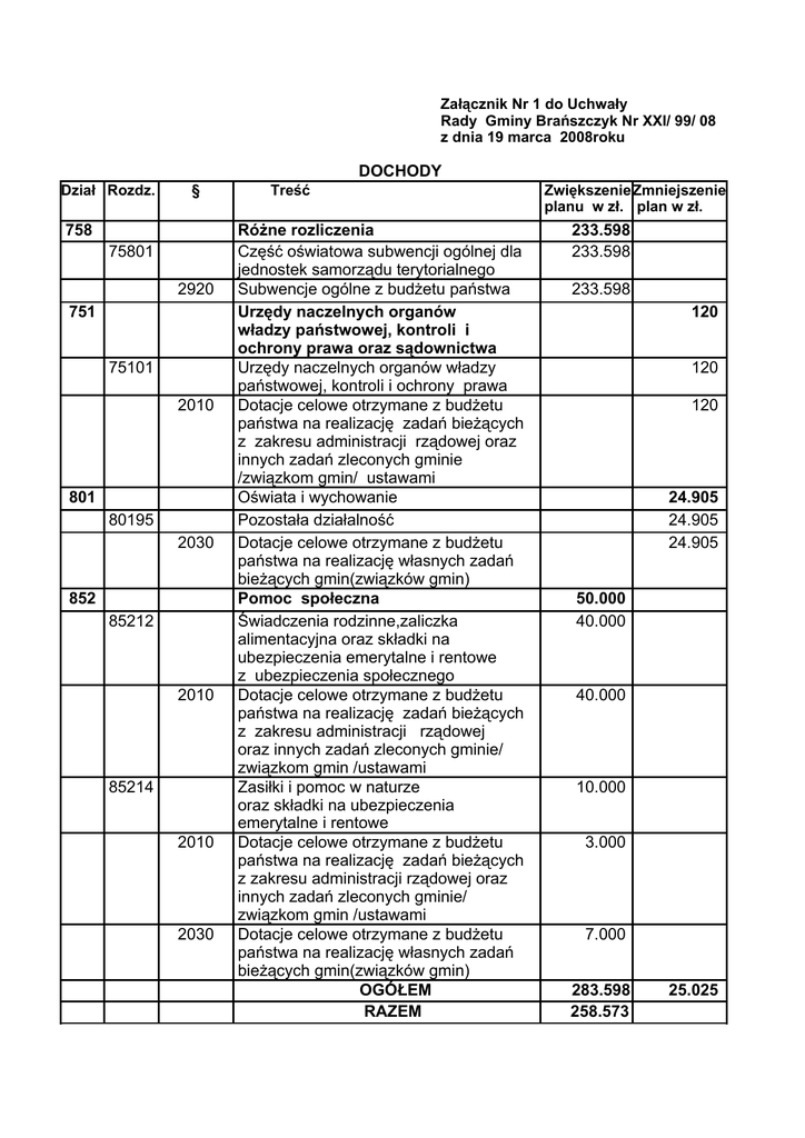Załącznik Nr 1 do Uchwały Rady Gminy Brańszczyk Nr XXI/ 99/ 08 z dnia 19 marca 2008roku DOCHODY Dział Rozdz. § 758 75801 2920 751 75101 2010 801 80195 2030 852 85212 2010 85214 2010 2030 Treść Różne rozliczenia Część oświatowa subwencji ogólnej dla jednostek samorządu terytorialnego Subwencje ogólne z budżetu państwa Urzędy naczelnych organów władzy państwowej, kontroli i ochrony prawa oraz sądownictwa Urzędy naczelnych organów władzy państwowej, kontroli i ochrony prawa Dotacje celowe otrzymane z budżetu państwa na realizację zadań bieżących z zakresu administracji rządowej oraz innych zadań zleconych gminie /związkom gmin/ ustawami Oświata i wychowanie Pozostała działalność Dotacje celowe otrzymane z budżetu państwa na realizację własnych zadań bieżących gmin(związków gmin) Pomoc społeczna Świadczenia rodzinne,zaliczka alimentacyjna oraz składki na ubezpieczenia emerytalne i rentowe z ubezpieczenia społecznego Dotacje celowe otrzymane z budżetu państwa na realizację zadań bieżących z zakresu administracji rządowej oraz innych zadań zleconych gminie/ związkom gmin /ustawami Zasiłki i pomoc w naturze oraz składki na ubezpieczenia emerytalne i rentowe Dotacje celowe otrzymane z budżetu państwa na realizację zadań bieżących z zakresu administracji rządowej oraz innych zadań zleconych gminie/ związkom gmin /ustawami Dotacje celowe otrzymane z budżetu państwa na realizację własnych zadań bieżących gmin(związków gmin) OGÓŁEM RAZEM Zwiększenie Zmniejszenie planu w zł. plan w zł. 233.598 233.598 233.598 120 120 120 24.905 24.905 24.905 50.000 40.000 40.000 10.000 3.000 7.000 283.598 258.573 25.025 Uzasadnienie: Dział 758 Różne rozliczenia Rozdział 75801Część oświatowa subwencji ogólnej dla jednostek samorządu terytorialnego zwiększa się plan dochodów o kwotę 233.598zł. Na podstawie pisma Ministra Finansów ST3/4820/1/08 Dział 751Urzędy naczelnych organów władzy państwowej, kontroli i ochrony prawa oraz sądownictwa 75101 zmniejsza się plan dochodów o kwotę 120zł. na podstawie pisma Krajowego Biura Wyborczego Delegatura w Ostrołęce DOS3101-1-18/08 z dnia 25 lutego 2008 roku. Dział 801 Oświata i wychowanie Rozdz.80195 zmniejsza się plan dochodów o kwotę 24.905zł.na podstawie pisma Mazowieckiego Urzędu Wojewódzkiego w Warszawie Wydział Finansów i Budżetu FIN I/301/3011/13/08 z dnia 21 lutego 2008 roku. Dział 852 Pomoc Społeczna Rozdz.85212 Świadczenia rodzinne,zaliczka alimentacyjna oraz składki na ubezpieczenia emerytalne i rentowe z ubezpieczenia społecznego zwiększa się plan dochodów o kwotę 40.000zł. Rozdz.85214 Zasiłki i pomoc w naturze oraz składki na ubezpieczenia emerytalne i rentowe zwiększa się plan dochodów o kwotę 10.000zł w/w zmiany w dziale 852 Pomoc społeczna zostały dokonane na podstawie pisma Mazowieckiego Urzędu Wojewódzkiego w Warszawie Wydział Finansów i Budżetu FIN I/301/3011/13/08 z dnia 21 lutego 2008 roku.