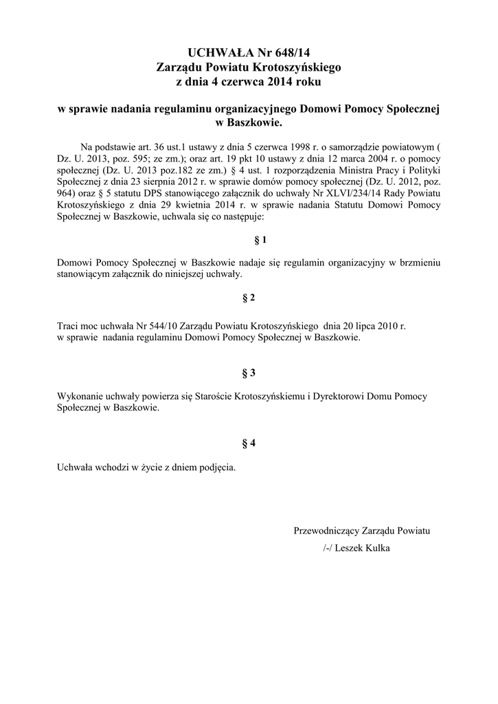 UCHWAŁA Nr 648/14 Zarządu Powiatu Krotoszyńskiego z dnia 4 czerwca 2014 roku w sprawie nadania regulaminu organizacyjnego Domowi Pomocy Społecznej w Baszkowie. Na podstawie art. 36 ust.1 ustawy z dnia 5 czerwca 1998 r. o samorządzie powiatowym ( Dz. U. 2013, poz. 595; ze zm.); oraz art. 19 pkt 10 ustawy z dnia 12 marca 2004 r. o pomocy społecznej (Dz. U. 2013 poz.182 ze zm.) § 4 ust. 1 rozporządzenia Ministra Pracy i Polityki Społecznej z dnia 23 sierpnia 2012 r. w sprawie domów pomocy społecznej (Dz. U. 2012, poz. 964) oraz § 5 statutu DPS stanowiącego załącznik do uchwały Nr XLVI/234/14 Rady Powiatu Krotoszyńskiego z dnia 29 kwietnia 2014 r. w sprawie nadania Statutu Domowi Pomocy Społecznej w Baszkowie, uchwala się co następuje: §1 Domowi Pomocy Społecznej w Baszkowie nadaje się regulamin organizacyjny w brzmieniu stanowiącym załącznik do niniejszej uchwały. §2 Traci moc uchwała Nr 544/10 Zarządu Powiatu Krotoszyńskiego dnia 20 lipca 2010 r. w sprawie nadania regulaminu Domowi Pomocy Społecznej w Baszkowie. §3 Wykonanie uchwały powierza się Staroście Krotoszyńskiemu i Dyrektorowi Domu Pomocy Społecznej w Baszkowie. §4 Uchwała wchodzi w życie z dniem podjęcia. Przewodniczący Zarządu Powiatu /-/ Leszek Kulka Załącznik do uchwały Nr 648/14 Zarządu Powiatu Krotoszyńskiego z dnia 4 czerwca 2014 r. REGULAMIN ORGANIZACYJNY DOMU POMOCY SPOŁECZNEJ W BASZKOWIE ROZDZIAŁ I POSTANOWIENIA OGÓLNE §1 Dom Pomocy Społecznej w Baszkowie zwany dalej „Domem” działa na podstawie: a) Ustawy z dnia 12 marca 2004 r. o pomocy społecznej (tekst jednolity Dz. U. 2013, poz. 182 ze zm.) b) Ustawy z dnia 19 sierpnia 1994 r. o ochronie zdrowia psychicznego ( Dz. U. z 2011 r. Nr 231, poz. 1375) c) Ustawy z dnia 5 czerwca 1998 r. o samorządzie powiatowym (tekst jednolity Dz. U. 2013, poz. 595 z późn. zm.) d) Ustawy z dnia 27 sierpnia 2009 r. o finansach publicznych (Dz. U.2013, poz. 885) e) Rozporządzenia Rady Ministrów z dnia 2 września 1997 r. w sprawie służby bezpieczeństwa i higieny pracy. (Dz. U. z 1997 r. Nr 109, poz. 704, ze zm.). f) Rozporządzenia Ministra Polityki Społecznej z dnia 23 sierpnia 2012 r. w sprawie domów pomocy społecznej (Dz. U. 2012, poz. 964) g) Rozporządzenia Ministra Polityki Społecznej z dnia 14 stycznia 2014 r. w sprawie zajęć rehabilitacji społecznej w domach pomocy społecznej dla osób z zaburzeniami psychicznymi (Dz. U. 2014, poz.250) h) Statutu nadanego uchwałą Rady Powiatu Krotoszyńskiego Nr XLVI/234/14 z dnia 29 kwietnia 2014 r. ROZDZIAŁ II NAZWA, SIEDZIBA I TYP DOMU §2 Regulamin organizacyjny określa zasady działania Domu Pomocy Społecznej w Baszkowie. §3 1. Ustala się, że nazwa domu brzmi „Dom Pomocy Społecznej w Baszkowie”. W dalszej części regulaminu Dom Pomocy Społecznej w Baszkowie zwany będzie „Domem”. 2. Siedzibą Domu jest Baszków 112, 63-760 Zduny. 2 3. Dom przeznaczony jest dla osób dorosłych, obojga płci, przewlekle somatycznie i przewlekle psychicznie chorych. 4. Liczba miejsc w Domu określona jest decyzją Wojewody Wielkopolskiego. ROZDZIAŁ III ZASADY FUNKCJONOWANIA DOMU §4 1. Dom funkcjonuje w sposób zapewniający właściwy zakres usług , zgodny ze standardami, w oparciu o indywidualne potrzeby mieszkańca Domu. 2. Do Domu przyjmowane są osoby na podstawie decyzji o umieszczeniu wydanej przez Powiatowe Centrum Pomocy Rodzinie w Krotoszynie. 3. Przy przyjęciu osoby pracownik socjalny Domu przeprowadza rozmowę z osobą przyjmowaną, rodziną lub opiekunem prawnym w celu ustalenia jej aktualnej sytuacji i wstępnych warunków pobytu. Ustalenia te stanowią podstawę planu działań zmierzających do lepszej adaptacji mieszkańca w placówce. 4. Osobie, o której mowa w ust. 1 pracownik socjalny udziela informacji o zakresie świadczonych usług, zasadach pobytu i sposobie funkcjonowania Domu. 5. Rodzaj i zakres usług z których mieszkaniec korzysta wynika z indywidualnego planu wsparcia mieszkańca, opracowanego z jego udziałem, jeżeli udział ten jest możliwy ze względu na stan zdrowia i gotowość uczestnictwa w nim mieszkańca. 6. Działania wynikające z indywidualnego planu wsparcia mieszkańca koordynuje pracownik Domu, zwany „pracownikiem pierwszego kontaktu”, wskazany przez mieszkańca Domu, jeżeli wybór ten jest możliwy ze względu na jego stan zdrowia i organizację pracy Domu. Pracownicy pierwszego kontaktu działają w ramach zespołów terapeutyczno – opiekuńczych. 7. W początkowym okresie pobytu w Domu mieszkaniec otoczony jest szczególną opieką celem adaptacji w nowym środowisku. 8. Dom zapewnia możliwość złożenia do depozytu przedmiotów wartościowych, a na wniosek mieszkańca lub jego przedstawiciela ustawowego zapewnia mu pomoc w gospodarowaniu środkami pieniężnymi. 9. Mieszkańcy uczestniczą w zajęciach zgodnie z planem opracowanym przez zespoły terapeutyczno – opiekuńcze. 10. Dom umożliwia utrzymanie kontaktów osobistych bądź korespondencyjnych z rodzinami mieszkańców, a w przypadku osób ubezwłasnowolnionych, z ich opiekunami prawnymi. Konsultuje się z nimi w ważniejszych sprawach dotyczących podopiecznego np. skierowania na leczenie, przeniesienia do innego Domu, itp. informuje rodzinę o stanie zdrowia mieszkańca, przypadkach samowolnego oddalenia się i śmierci. §5 1. Pobyt mieszkańców w Domu jest odpłatny. Wysokość odpłatności oraz zasady jej naliczania określają odrębne przepisy. 2. W przypadku wydania przez Zespół Terapeutyczno – Opiekuńczy opinii o zdolności mieszkańca do powrotu i funkcjonowania w środowisku, Dyrektor zwraca się do jednostki kierującej o podjęcie działań mających na celu usamodzielnienie mieszkańca. 3 ROZDZIAŁ IV SZCZEGÓŁOWA STRUKTURA DOMU §6 Dyrektorowi podlegają: 1. Zespół terapeutyczno – opiekuńczy w budynku „Pałac”, dla osób dorosłych przewlekle psychicznie chorych. 2. Zespół terapeutyczno – opiekuńczy w budynku „
