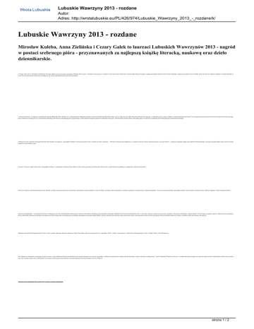Lubuskie Wawrzyny 2013 - rozdane Autor: Adres: http://wrotalubuskie.eu/PL/426/974/Lubuskie_Wawrzyny_2013_-_rozdane/k/ Lubuskie Wawrzyny 2013 - rozdane Mirosław Kuleba, Anna Zielińska i Cezary Galek to laureaci Lubuskich Wawrzynów 2013 - nagród w postaci srebrnego pióra - przyznawanych za najlepszą książkę literacką, naukową oraz dzieło dziennikarskie. 27 lutego 2014 roku w Sali Dębowej Biblioteki Norwida odbyła się uroczysta gala wręczenia Lubuskich Wawrzynów z udziałem zacnych gości w osobach: wojewody Jerzego Ostroucha, wicemarszałka Macieja Szykuły, zastępcy prezydenta Zielonej Góry Wiolety Haręźlak, zastępcy prezydenta Gorzowa Wlkp. Aliny Nowak oraz radnych miejskich z Jolantą Danielak na czele. Na sali obecni byli również jurorzy konkursu, jak również przedstawiciele środowisk literackich. - Wawrzyn Literacki - tą imprezę wymyśliła była dyrektor Biblioteki Maria Wasik wraz z zielonogórskim oddziałem Związku Literatów Polskich dwadzieścia lat temu, czyli w 1994 roku. Do 2005 roku przyznawano dwie nagrody - w dziedzinie prozy i poezji. Jednak z czasem podział przestał istnieć. Teraz nagroda jest przyznawana dla autorów książek literackich (poezja, proza, dramat) wywodzących się z województwa lubuskiego lub obecnie zamieszkujących na jego terenie, a także autorów książek wydanych w lubuskich oficynach - mówił dyrektor Andrzej Buck, prowadząc galę w towarzystwie dyrektora gorzowskiej książnicy Edwarda Jaworskiego. Jubileuszowy laur otrzymał zielonogórzanin Mirosław Kuleba za książkę pt. „Enographia Thalloris" poświęconą historii wina i winiaku na Ziemi Lubuskiej. – Jeśli ktoś do dzisiaj miał wątpliwości, że Zielona Góra jest winem i miodem słynąca to ma tego dowód – z radością oznajmiła zastępca prezydenta Wioleta Haręźlak, wręczając nagrodę mamie autora, który nie mógł osobiście wziąć udziału w gali. Licząca 1150 stron, bogato ilustrowana „Enographia Thalloris” wydana przez Fundację Gloria Monte Verde, której prezesem jest Przemysław Karwowski, została uznana za publikację o najlepszych walorach edytorskich. Wawrzyn Naukowy, któremu partnerują cztery lubuskie uczelnie został przyznany po raz dziewiąty. Otrzymała go Anna Zielińska z Gorzowa Wlkp. za książkę „Mowa pogranicza: studium o językach i tożsamościach w regionie lubuskim". Na uroczystość przyjechała z gromadką wnuków, które okazały się pomocne przy odbiorze nagrody i wielu wiązanek kwiatów. Wawrzyn Dziennikarski - wyróżnienie dla twórców najlepszych utworów dziennikarskich dotyczących obszaru województwa lubuskiego był pomysłem Lubuskiego Oddziału Stowarzyszenia Dziennikarzy RP i w tym roku został po raz pierwszy przyznany oficjalnie. Otrzymał go dziennikarz „Radia Zachód” Cezary Galek za audycje radiowe: Opowieść prowincjonalna; Wiersz dla Emilki; Historia dwóch Marii; Przodem do przodu. Dyplom dla wyróżniającego się młodego dziennikarza otrzymała Agata Źrałko za teksty: Jesteśmy jak Ameryka, tylko żużel mamy lepszy; Jak pokochać święta i nie dać się depresji; Pierwsza kobieta żużlowiec; Tango w spichlerzu; Być jak markowy Woodstock. Spotkanie uświetnił Zielonogórski Salon Poezji w mini wydaniu. Śpiewała aktorka Lubuskiego Teatru Anna Haba, odtwórczyni głównej roli w spektaklu „Piaff”, a teksty czytali aktorzy i właściciele zielonogórskiego Teatru „Trójkąt” Beata i Artur Belingowie. Nie zabrakło też momentów wzruszających, jak życzenia z okazji jubileuszu 80-lecia urodzin dla literata Janusza Koniusza czy chwila wspomnień o niedawno zmarłej poetce, dobrym duszku literackim, a także człowieku z piękną duszą - Annie Tokarskiej. Dzięki życzliwości, w uznaniu dla talentu obojga oraz wsparciu finansowemu Urzędu Miasta Zielona Góra jesienią tego roku zostaną wydane dwa tomiki poezji. Tymczasem, podczas gali Janusz Koniusz otrzymał Nagrodę Literacką Związku Literatów Polskich. Nominowani do Lubuskich Wawrzynów 2013 zostali wyróżnieni dyplomami: strona 1 / 2 Lubuskie Wawrzyny 2013 - rozdane Autor: Adres: http://wrotalubuskie.eu/PL/426/974/Lubuskie_Wawrzyny_2013_-_rozdane/k/ Lubuski Wawrzyn Literacki - Jerzy Fryckowski, Chwile siwienia, Wydawnictwo Tawa, Chełm 2013. - Maria Sidorska-Ryczkowska, Klucze do rzeki, Wydawnictwo Innowacyjne „Novae Res", Gdynia 2013. - Czesław Sobkowiak, Rzeka powrotna: zapiski i małe prozy, nakład własny, Wrocław 2013. - Małgorzata Stachowiak-Schreyner, Jestem, która Jesteś, „Organon", Zielona Góra 2013. - Zdzisław Morawski (pośmiertnie), Rzecz o dorzeczności: wiersze 1959-1992 w wyborze i układzie Ireneusza Krzysztofa Szmidta, Związek Literatów Polskich Oddział w Gorzowie Wlkp., Wydawnictwo Sonar Literacki, Gorzów Wlkp. 2013. Lubuski Wawrzyn Naukowy - Zbigniew Czarnuch, Posmakuj Witnicy: opowieści o sztuce warzenia piwa w ogóle, a piw lubuskich w szczególności, Browar „Witnica", Witnica 2013. - Tadeusz Marcinkowski, Skarby pamięci, Regionalne Centrum Animacji Kultury w Zielonej Górze, Zielona Góra 2013. - Radosław Skrycki, Prace kartograficzne w dolinach Odry, Warty i Noteci w okresie fryderycjańskim, Wydawnictwo Naukowe Wydziału Humanistycznego US „Minerwa", Szczecin 2013. - Miron Urbaniak, Kolej Skwierzyna - Stare Bielice: kolejowy modernizm w Polsce, Fundacja Wspierania Inicjatyw Kulturalnych i Wydawniczych: Księży Młyn, Łódź 2013. Lubuski Wawrzyn Dziennikarski - Jacek Katos Katarzyński za zgłoszone utwory dziennikarskie: Firefly Film Studio; Wawrzyn.., Impro.., Opera...; X lat Lata Muz Wszelakich; Najciekawsi goście 2013 r." - Leszek Kalinowski za zgłoszone utwory dziennikarskie: Zakochany w Aniele [wydanie internetowe - Zakochany w Annie German]; By się nie zgubić. W życiu; Powiedz, jak mnie kochasz; Skok przez życie [wydanie internetowe - Jestem najstarszą modelką świata!"]; Ocalmy od zapomnienia Polską Wełnę. - Wojciech Kuska 