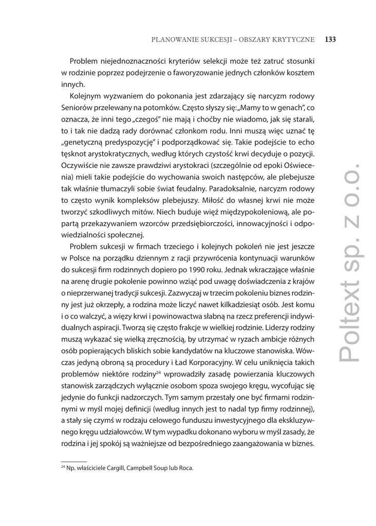Problem niejednoznaczności kryteriów selekcji może też zatruć stosunki w rodzinie poprzez podejrzenie o faworyzowanie jednych członków kosztem innych. Kolejnym wyzwaniem do pokonania jest zdarzający się narcyzm rodowy Seniorów przelewany na potomków. Często słyszy się: „Mamy to w genach”, co oznacza, że inni tego „czegoś” nie mają i choćby nie wiadomo, jak się starali, to i tak nie dadzą rady dorównać członkom rodu. Inni muszą więc uznać tę „genetyczną predyspozycję” i podporządkować się. Takie podejście to echo tęsknot arystokratycznych, według których czystość krwi decyduje o pozycji. Oczywiście nie zawsze prawdziwi arystokraci (szczególnie od epoki Oświecenia) mieli takie podejście do wychowania swoich następców, ale plebejusze tak właśnie tłumaczyli sobie świat feudalny. Paradoksalnie, narcyzm rodowy to często wynik kompleksów plebejuszy. Miłość do własnej krwi nie może tworzyć szkodliwych mitów. Niech buduje więź międzypokoleniową, ale popartą przekazywaniem wzorców przedsiębiorczości, innowacyjności i odpowiedzialności społecznej. Problem sukcesji w firmach trzeciego i kolejnych pokoleń nie jest jeszcze w Polsce na porządku dziennym z racji przywrócenia kontynuacji warunków do sukcesji firm rodzinnych dopiero po 1990 roku. Jednak wkraczające właśnie na arenę drugie pokolenie powinno wziąć pod uwagę doświadczenia z krajów o nieprzerwanej tradycji sukcesji. Zazwyczaj w trzecim pokoleniu biznes rodzinny jest już okrzepły, a rodzina może liczyć nawet kilkadziesiąt osób. Jest komu i o co walczyć, a więzy krwi i powinowactwa słabną na rzecz preferencji indywidualnych aspiracji. Tworzą się często frakcje w wielkiej rodzinie. Liderzy rodziny muszą wykazać się wielką zręcznością, by utrzymać w ryzach ambicje różnych osób popierających bliskich sobie kandydatów na kluczowe stanowiska. Wówczas jedyną obroną są procedury i Ład Korporacyjny. W celu uniknięcia takich problemów niektóre rodziny24 wprowadziły zasadę powierzania kluczowych stanowisk zarządczych wyłącznie osobom spoza swojego kręgu, wycofując się jedynie do funkcji nadzorczych. Tym samym przestały one być firmami rodzinnymi w myśl mojej definicji (według innych jest to nadal typ firmy rodzinnej), a stały się czymś w rodzaju celowego funduszu inwestycyjnego dla ekskluzywnego kręgu udziałowców. W tym wypadku dokonano wyboru w myśl zasady, że rodzina i jej spokój są ważniejsze od bezpośredniego zaangażowania w biznes. 24 Np. właściciele Cargill, Campbell Soup lub Roca. 133 Poltext sp. z o.o. PLANOWANIE SUKCESJI – OBSZARY KRYTYCZNE