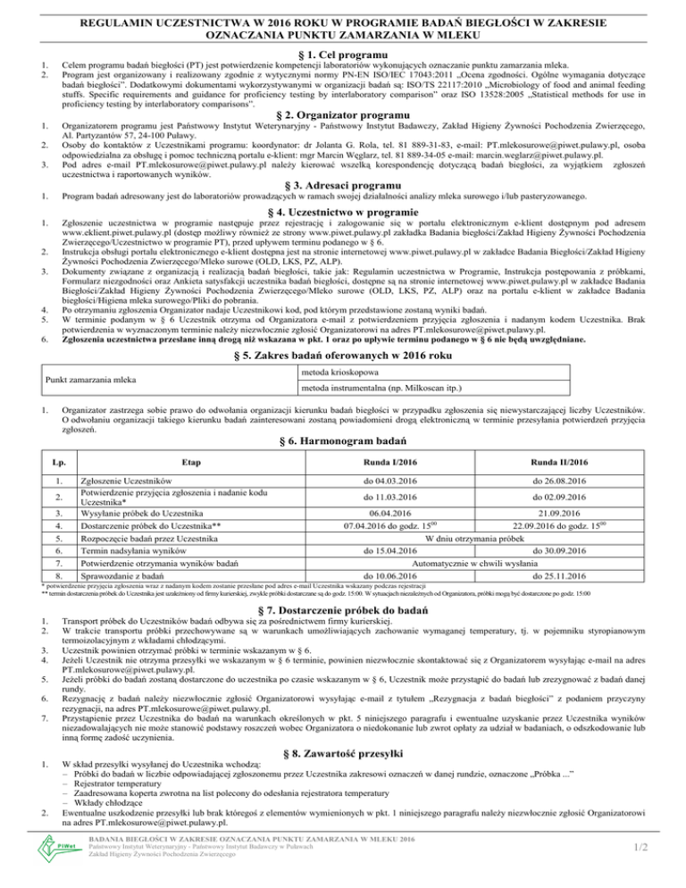 REGULAMIN UCZESTNICTWA W 2016 ROKU W PROGRAMIE BADAŃ BIEGŁOŚCI W ZAKRESIE OZNACZANIA PUNKTU ZAMARZANIA W MLEKU § 1. Cel programu 1. 2. Celem programu badań biegłości (PT) jest potwierdzenie kompetencji laboratoriów wykonujących oznaczanie punktu zamarzania mleka. Program jest organizowany i realizowany zgodnie z wytycznymi normy PN-EN ISO/IEC 17043:2011 „Ocena zgodności. Ogólne wymagania dotyczące badań biegłości”. Dodatkowymi dokumentami wykorzystywanymi w organizacji badań są: ISO/TS 22117:2010 „Microbiology of food and animal feeding stuffs. Specific requirements and guidance for proficiency testing by interlaboratory comparison” oraz ISO 13528:2005 „Statistical methods for use in proficiency testing by interlaboratory comparisons”. 1. Organizatorem programu jest Państwowy Instytut Weterynaryjny - Państwowy Instytut Badawczy, Zakład Higieny Żywności Pochodzenia Zwierzęcego, Al. Partyzantów 57, 24-100 Puławy. Osoby do kontaktów z Uczestnikami programu: koordynator: dr Jolanta G. Rola, tel. 81 889-31-83, e-mail: [email protected], osoba odpowiedzialna za obsługę i pomoc techniczną portalu e-klient: mgr Marcin Węglarz, tel. 81 889-34-05 e-mail: [email protected]. Pod adres e-mail [email protected] należy kierować wszelką korespondencję dotyczącą badań biegłości, za wyjątkiem zgłoszeń uczestnictwa i raportowanych wyników. § 2. Organizator programu 2. 3. § 3. Adresaci programu 1. Program badań adresowany jest do laboratoriów prowadzących w ramach swojej działalności analizy mleka surowego i/lub pasteryzowanego. 1. Zgłoszenie uczestnictwa w programie następuje przez rejestrację i zalogowanie się w portalu elektronicznym e-klient dostępnym pod adresem www.eklient.piwet.pulawy.pl (dostęp możliwy również ze strony www.piwet.pulawy.pl zakładka Badania biegłości/Zakład Higieny Żywności Pochodzenia Zwierzęcego/Uczestnictwo w programie PT), przed upływem terminu podanego w § 6. Instrukcja obsługi portalu elektronicznego e-klient dostępna jest na stronie internetowej www.piwet.pulawy.pl w zakładce Badania Biegłości/Zakład Higieny Żywności Pochodzenia Zwierzęcego/Mleko surowe (OLD, LKS, PZ, ALP). Dokumenty związane z organizacją i realizacją badań biegłości, takie jak: Regulamin uczestnictwa w Programie, Instrukcja postępowania z próbkami, Formularz niezgodności oraz Ankieta satysfakcji uczestnika badań biegłości, dostępne są na stronie internetowej www.piwet.pulawy.pl w zakładce Badania Biegłości/Zakład Higieny Żywności Pochodzenia Zwierzęcego/Mleko surowe (OLD, LKS, PZ, ALP) oraz na portalu e-klient w zakładce Badania biegłości/Higiena mleka surowego/Pliki do pobrania. Po otrzymaniu zgłoszenia Organizator nadaje Uczestnikowi kod, pod którym przedstawione zostaną wyniki badań. W terminie podanym w § 6 Uczestnik otrzyma od Organizatora e-mail z potwierdzeniem przyjęcia zgłoszenia i nadanym kodem Uczestnika. Brak potwierdzenia w wyznaczonym terminie należy niezwłocznie zgłosić Organizatorowi na adres [email protected]. Zgłoszenia uczestnictwa przesłane inną drogą niż wskazana w pkt. 1 oraz po upływie terminu podanego w § 6 nie będą uwzględniane. § 4. Uczestnictwo w programie 2. 3. 4. 5. 6. § 5. Zakres badań oferowanych w 2016 roku metoda krioskopowa Punkt zamarzania mleka metoda instrumentalna (np. Milkoscan itp.) 1. Organizator zastrzega sobie prawo do odwołania organizacji kierunku badań biegłości w przypadku zgłoszenia się niewystarczającej liczby Uczestników. O odwołaniu organizacji takiego kierunku badań zainteresowani zostaną powiadomieni drogą elektroniczną w terminie przesyłania potwierdzeń przyjęcia zgłoszeń. § 6. Harmonogram badań Lp. 1. 2. 3. 4. 5. 6. 7. 8. Etap Zgłoszenie Uczestników Potwierdzenie przyjęcia zgłoszenia i nadanie kodu Uczestnika* Wysyłanie próbek do Uczestnika Dostarczenie próbek do Uczestnika** Rozpoczęcie badań przez Uczestnika Termin nadsyłania wyników Potwierdzenie otrzymania wyników badań Sprawozdanie z badań Runda I/2016 Runda II/2016 do 04.03.2016 do 26.08.2016 do 11.03.2016 do 02.09.2016 06.04.2016 21.09.2016 07.04.2016 do godz. 1500 22.09.2016 do godz. 1500 W dniu otrzymania próbek do 15.04.2016 do 30.09.2016 Automatycznie w chwili wysłania do 10.06.2016 do 25.11.2016 * potwierdzenie przyjęcia zgłoszenia wraz z nadanym kodem zostanie przesłane pod adres e-mail Uczestnika wskazany podczas rejestracji ** termin dostarczenia próbek do Uczestnika jest uzależniony od firmy kurierskiej, zwykle próbki dostarczane są do godz. 15:00. W sytuacjach niezależnych od Organizatora, próbki mogą być dostarczone po godz. 15:00 § 7. Dostarczenie próbek do badań 1. 2. 3. 4. 5. 6. 7. Transport próbek do Uczestników badań odbywa się za pośrednictwem firmy kurierskiej. W trakcie transportu próbki przechowywane są w warunkach umożliwiających zachowanie wymaganej temperatury, tj. w pojemniku styropianowym termoizolacyjnym z wkładami chłodzącymi. Uczestnik powinien otrzymać próbki w terminie wskazanym w § 6. Jeżeli Uczestnik nie otrzyma przesyłki we wskazanym w § 6 terminie, powinien niezwłocznie skontaktować się z Organizatorem wysyłając e-mail na adres [email protected]. Jeżeli próbki do badań zostaną dostarczone do uczestnika po czasie wskazanym w § 6, Uczestnik może przystąpić do badań lub zrezygnować z badań danej rundy. Rezygnację z badań należy niezwłocznie zgłosić Organizatorowi wysyłając e-mail z tytułem „Rezygnacja z badań biegłości” z podaniem przyczyny rezygnacji, na adres [email protected]. Przystąpienie przez Uczestnika do badań na warunkach określonych w pkt. 5 niniejszego paragrafu i ewentualne uzyskanie przez Uczestnika wyników niezadowalających nie może stanowić podstawy roszczeń wobec Organizatora o niedokonanie lub zwrot opłaty za udział w badaniach, o odszkodowanie lub inną formę zadość uczynienia. § 8. Zawartość przesy