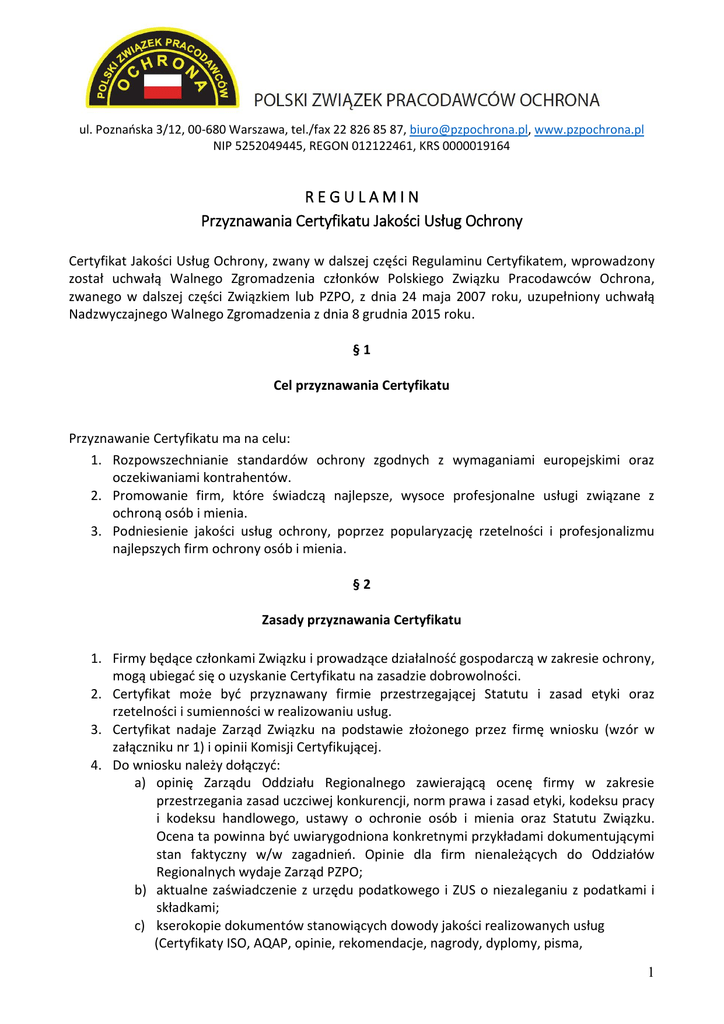ul. Poznańska 3/12, 00-680 Warszawa, tel./fax 22 826 85 87, [email protected], www.pzpochrona.pl NIP 5252049445, REGON 012122461, KRS 0000019164 REGULAMIN Przyznawania Certyfikatu Jakości Usług Ochrony Certyfikat Jakości Usług Ochrony, zwany w dalszej części Regulaminu Certyfikatem, wprowadzony został uchwałą Walnego Zgromadzenia członków Polskiego Związku Pracodawców Ochrona, zwanego w dalszej części Związkiem lub PZPO, z dnia 24 maja 2007 roku, uzupełniony uchwałą Nadzwyczajnego Walnego Zgromadzenia z dnia 8 grudnia 2015 roku. §1 Cel przyznawania Certyfikatu Przyznawanie Certyfikatu ma na celu: 1. Rozpowszechnianie standardów ochrony zgodnych z wymaganiami europejskimi oraz oczekiwaniami kontrahentów. 2. Promowanie firm, które świadczą najlepsze, wysoce profesjonalne usługi związane z ochroną osób i mienia. 3. Podniesienie jakości usług ochrony, poprzez popularyzację rzetelności i profesjonalizmu najlepszych firm ochrony osób i mienia. §2 Zasady przyznawania Certyfikatu 1. Firmy będące członkami Związku i prowadzące działalność gospodarczą w zakresie ochrony, mogą ubiegać się o uzyskanie Certyfikatu na zasadzie dobrowolności. 2. Certyfikat może być przyznawany firmie przestrzegającej Statutu i zasad etyki oraz rzetelności i sumienności w realizowaniu usług. 3. Certyfikat nadaje Zarząd Związku na podstawie złożonego przez firmę wniosku (wzór w załączniku nr 1) i opinii Komisji Certyfikującej. 4. Do wniosku należy dołączyć: a) opinię Zarządu Oddziału Regionalnego zawierającą ocenę firmy w zakresie przestrzegania zasad uczciwej konkurencji, norm prawa i zasad etyki, kodeksu pracy i kodeksu handlowego, ustawy o ochronie osób i mienia oraz Statutu Związku. Ocena ta powinna być uwiarygodniona konkretnymi przykładami dokumentującymi stan faktyczny w/w zagadnień. Opinie dla firm nienależących do Oddziałów Regionalnych wydaje Zarząd PZPO; b) aktualne zaświadczenie z urzędu podatkowego i ZUS o niezaleganiu z podatkami i składkami; c) kserokopie dokumentów stanowiących dowody jakości realizowanych usług (Certyfikaty ISO, AQAP, opinie, rekomendacje, nagrody, dyplomy, pisma, 1 d) e) f) g) h) i) j) artykuły prasowe itp.); oświadczenie, że ubiegający się w ciągu trzech lat nie był wykluczony z zamówień publicznych na podstawie art. 24 ust.1 Ustawy Prawo Zamówień Publicznych; oświadczenie wnioskodawcy o niekaralności zatrudnionych pracowników wg wymagań ustawy o ochronie osób i mienia; formularz samooceny kandydata według wzoru (załącznik nr 2 do Regulaminu); Kserokopie polisy OC, AC, NW; potwierdzenie opłaty na pokrycie kosztów certyfikacji; sprawozdanie z ilości oraz uzyskanych wyników kontroli przeprowadzonych przez uprawnione organy państwowe, jak Policja, Państwowa Inspekcja Pracy, Urząd Kontroli Skarbowej, Zakład Ubezpieczeń Społecznych i innych w roku bieżącym i poprzedzającym złożenie wniosku; zaświadczenie o niezaleganiu w płatnościach składek członkowskich na rzecz Związku, podpisane przez przedstawiciela biura księgowego Związku. 5. Po złożeniu wniosku wraz z kompletem dokumentów, Komisja Certyfikująca na najbliższym posiedzeniu dokona jego oceny i podejmie decyzję o nadaniu lub nie nadaniu Certyfikatu. 6. Certyfikat podpisują: Prezes Zarządu PZPO oraz Przewodniczący Komisji Certyfikującej. 7. Od decyzji Zarządu PZPO dotyczącej nie przyznania Certyfikatu lub cofnięcia prawa do posługiwania się nim, wyróżniony może odwołać się do Walnego Zgromadzenia. §3 Skład Komisji Certyfikującej oraz ogólne zasady jej pracy 1. Komisja Certyfikująca, zwana w dalszej części Komisją, powoływana jest w składzie 5 osób na okres trwania kadencji Zarządu Związku. 2. Przewodniczący Komisji jest wybierany na pierwszym posiedzeniu po powołaniu Komisji, a w jej skład z urzędu wchodzą: a) Wiceprezes Zarządu PZPO; b) Przewodniczący Komisji Etyki; c) Dyrektor Biura PZPO; d) Członek Zarządu PZPO; e) Członek Zarządu PZPO. 3. Komisja może korzystać z doradztwa i opinii osób uznanych za ekspertów w zakresie ochrony i przepisów prawa. 4. Członek Komisji będący jednocześnie przedstawicielem firmy ubiegającej się o Certyfikat jest wyłączany z prac Komisji rozpatrującej wniosek. Zarząd Związku na jego miejsce wyznacza innego członka. 5. Komisja dokonuje oceny wniosku w głosowaniu tajnym. 6. Wniosek otrzymuje ocenę pozytywną, jeżeli za przyznaniem Certyfikatu głosowała większość członków Komisji – nie mniej niż trzech. 7. Z prac Komisji sporządzany jest protokół, który musi zawierać informację o przebiegu prac Komisji oraz wynik głosowania. 8. Komisja pracuje w oparciu o Regulamin pracy uchwalony przez siebie i zatwierdzony przez Zarząd PZPO. 2 §4 Ogólne kryteria oceny wniosku Komisja Certyfikująca dokonuje oceny wniosku na postawie kompletności i aktualności wymaganych w Regulaminie dokumentów, które potwierdzają jakość i rzetelność świadczonych usług. §5 Wzór Certyfikatu i opłaty 1. Wzór Certyfikatu w zakresie treści i formy graficznej stanowi załącznik nr 3 do Regulaminu. 2. Walne Zgromadzenie PZPO określa wysokość opłaty za wydanie Certyfikatu, która obowiązuje do odwołania. §6 Okres obowiązywania Certyfikatu 1. Certyfikat wydawany jest na okres dwóch lat. Po upływie tego okresu wyróżniony ma prawo ubiegać się ponownie o przyznanie Certyfikatu według zasad ujętych w § 2 pkt 5 Regulaminu. 2. Na wniosek Komisji Certyfikującej, decyzją Zarządu podjętą w glosowaniu tajnym, wyróżniony może utracić prawo do posługiwania się Certyfikatem, jeżeli kryteria i zasady jego przyznania nie zostały dotrzymane, lub firma utraciła członkostwo Związku. §7 Uprawnienia związane z uzyskaniem Certyfikatu 1. Firma wyróżniona Certyfikatem zostaje wpisana do Księgi Wyróżnień prowadzonej przez PZPO. 2. Wpisy do Księgi będą publikowane na stronach internetowych Związku,