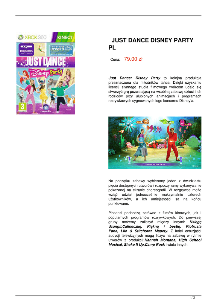 JUST DANCE DISNEY PARTY PL Cena: 79.00 zł Just Dance: Disney Party to kolejna produkcja przeznaczona dla miłośników tańca. Dzięki uzyskaniu licencji słynnego studia filmowego twórcom udało się stworzyć grę pozwalającą na wspólną zabawę dzieci i ich rodziców przy ulubionych animacjach i programach rozrywkowych sygnowanych logo koncernu Disney’a. Na początku zabawy wybieramy jeden z dwudziestu pięciu dostępnych utworów i rozpoczynamy wykonywanie pokazanej na ekranie choreografii. W rozgrywce może wziąć udział jednocześnie maksymalnie czterech użytkowników, a ich umiejętności są na końcu punktowane. Piosenki pochodzą zarówno z filmów kinowych, jak i popularnych programów rozrywkowych. Do pierwszej grupy możemy zaliczyć między innymi: Księgę dżungli,Calineczkę, Piękną i bestię, Piotrusia Pana, Lilo & Stitchoraz Mapety. Z kolei entuzjaści audycji telewizyjnych mogą liczyć na zabawę w rytmie utworów z produkcji:Hannah Montana, High School Musical, Shake It Up,Camp Rock i wielu innych. 1/2 Wersja stworzona z myślą o konsoli Xbox 360 obsługuje urządzenie Kinect, dzięki czemu nie musimy trzymać w ręce żadnego kontrolera. Ekskluzywnie udostępniono także tryb tworzenia własnych choreografii. Pozostałe opcje dostępne niezależnie od platformy sprzętowej obejmują między innymi przygotowywanie i zapisywanie własnych list utworów. Zobacz wideo: Szczegóły wersja językowa POLSKA 2/2 Powered by TCPDF (www.tcpdf.org)