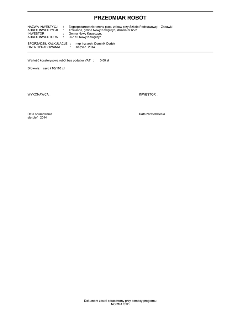 PRZEDMIAR ROBÓT NAZWA INWESTYCJI ADRES INWESTYCJI INWESTOR ADRES INWESTORA : : : : Zagospodarowanie terenu placu zabaw przy Szkole Podstawowej - Zabawki Trzcianna, gmina Nowy Kawęczyn, działka nr 65/2 Gmina Nowy Kawęczyn, 96-115 Nowy Kawęczyn SPORZĄDZIŁ KALKULACJE : DATA OPRACOWANIA : mgr inż arch. Dominik Dudek sierpień 2014 Wartość kosztorysowa robót bez podatku VAT : 0.00 zł Słownie: zero i 00/100 zł WYKONAWCA : INWESTOR : Data opracowania sierpień 2014 Data zatwierdzenia Dokument został opracowany przy pomocy programu NORMA STD Lp. Podstawa wyceny Opis Jedn. miary Ilość Cena zł 1 2 3 4 5 6 1 1 d.1 analiza indywidualna Zabawki Dostawa i montaż: szt duży zestaw zabawowy skład zestawu: 3 wieże, 2 zjeżdżalnie, pomost wysoki, przeplotnia pająk, pomost z belką, pomost wiszący z drewna, pomost linowy, wejście łukowe, ścianka wspinaczkowa, wejście rurowe, wymiary zestawu: 8,45m x 5,45m; strefa bezpieczeństwa: 11,45m x 8,75m; wysokość swobodnego upadku: 1, 95m; powierzchnia strefy bezpieczeństwa: 75,10m2. Konstrukcja z belek drewnianych okrągłych, barierki i daszki z płyt HPL lub HDPE, ślizgi z blachy nierdzewnej, pomost z drewna. 2 Dostawa i montaż: karuzela szt d.1 analiza indywi- strefa bezpieczeństwa: 5,55 x 5,55m; powierzchnia strefy bezpieczeństwa: 24,20m2. dualna 3 d.1 analiza indywidualna 4 d.1 analiza indywidualna 5 d.1 analiza indywidualna 6 d.1 analiza indywidualna 7 d.1 analiza indywidualna 8 d.1 analiza indywidualna Konstrukcja i ramiona z rur stalowych malowanych proszkowo, siedziska ze sklejki wodoodpornej. Dostawa i montaż: piaskownica mała wymiary: 1,60 x 1,60m; wymiary strefy bezpieczeństwa: 4,65 x 4,65m; powierzchnia strefy bezpieczeństwa: 19,70m2. Konstrukcja z belek okrągłych, siedziska z desek. Dostawa i montaż: huśtawka wahadłowa wymiary: 3,50 x 2,40 x 2,35m; strefa bezpieczeństwa: 3,30 x 8,00m; wysokość swobodnego upadku: 1,35m; powierzchnia strefy bezp.: 26,5m2. Konstrukcja z rur stalowych malowanych proszkowo, dwa rodzaje siedzisk. Dostawa i montaż: sprężynowiec konik wymiary: 0,85 x 0,25 x 0,90m; strefa bezpieczeństwa: 3,00m; wysokość swobodnego upadku: 0,55m; powierzchnia strefy bezpieczeństwa: 7,10m2. Korpus wykonany z płyty HDPE, sprężyna stalowa malowana proszkowo Dostawa i montaż: sprężynowiec motor wymiary: 0,85 x 0,25 x 0,75m; strefa bezpieczeństwa: 3,00m; wysokość swobodnego upadku: 0,55m; powierzchnia strefy bezpieczeństwa: 7,10m2. Korpus wykonany z płyty HDPE, sprężyna stalowa malowana proszkowo. Dostawa i montaż: sprężynowiec samolocik wymiary: 0,95 x 0,25 x 0,80m; strefa bezpieczeństwa: 3,00m; wysokość swobodnego upadku: 0,55m; powierzchnia strefy bezpieczeństwa: 7,10m2. Korpus wykonany z płyty HDPE, sprężyna stalowa malowana proszkowo. Dostawa i montaż: sprężynowiec fafiki wymiary: 1,65 x 0,90 x 0,90m; strefa bezpieczeństwa: 5,00 x 3,00m; wysokość swobodnego upadku: 0,50m; powierzchnia strefy bezpieczeństwa: 13,10m2. Korpus wykonany z płyty HDPE, sprężyna stalowa malowana proszkowo. Dostawa i montaż: tablica informacyjna (regulamin placu) 9 d.1 analiza indywidualna Wartość kosztorysowa robót bez podatku VAT 1 0.00 0.00 1 0.00 0.00 szt 1 0.00 0.00 szt 1 0.00 0.00 szt 1 0.00 0.00 szt 1 0.00 0.00 szt 1 0.00 0.00 szt 1 0.00 0.00 szt 1 0.00 0.00 0.00 Słownie: zero i 00/100 zł -2- Norma STD Wersja 4.40 Nr seryjny: 12732 Użytkownik: PRO-INSTAL Wartość zł (5 x 6) 7