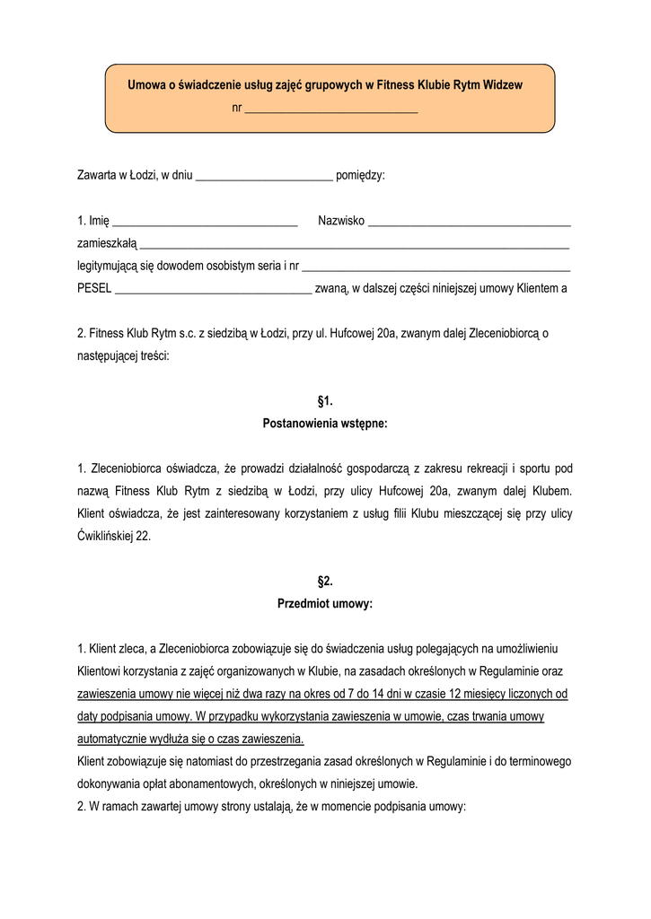 Umowa o świadczenie usług zajęć grupowych w Fitness Klubie Rytm Widzew nr _____________________________ Zawarta w Łodzi, w dniu _______________________ pomiędzy: 1. Imię _______________________________ Nazwisko __________________________________ zamieszkałą ________________________________________________________________________ legitymującą się dowodem osobistym seria i nr _____________________________________________ PESEL _________________________________ zwaną, w dalszej części niniejszej umowy Klientem a 2. Fitness Klub Rytm s.c. z siedzibą w Łodzi, przy ul. Hufcowej 20a, zwanym dalej Zleceniobiorcą o następującej treści: §1. Postanowienia wstępne: 1. Zleceniobiorca oświadcza, że prowadzi działalność gospodarczą z zakresu rekreacji i sportu pod nazwą Fitness Klub Rytm z siedzibą w Łodzi, przy ulicy Hufcowej 20a, zwanym dalej Klubem. Klient oświadcza, że jest zainteresowany korzystaniem z usług filii Klubu mieszczącej się przy ulicy Ćwiklińskiej 22. §2. Przedmiot umowy: 1. Klient zleca, a Zleceniobiorca zobowiązuje się do świadczenia usług polegających na umożliwieniu Klientowi korzystania z zajęć organizowanych w Klubie, na zasadach określonych w Regulaminie oraz zawieszenia umowy nie więcej niż dwa razy na okres od 7 do 14 dni w czasie 12 miesięcy liczonych od daty podpisania umowy. W przypadku wykorzystania zawieszenia w umowie, czas trwania umowy automatycznie wydłuża się o czas zawieszenia. Klient zobowiązuje się natomiast do przestrzegania zasad określonych w Regulaminie i do terminowego dokonywania opłat abonamentowych, określonych w niniejszej umowie. 2. W ramach zawartej umowy strony ustalają, że w momencie podpisania umowy: a. Zleceniobiorca udziela Klientowi bonifikaty od cen regularnych w wysokości 20% na wybraną usługę przez okres 12 pełnych miesięcy. b. Klient dokonuje pierwszej opłaty abonamentowej; c. w przypadku nieposiadania przez Klienta karty klubowej, Klient dokonuje jednorazowej opłaty w wysokości 20,00 zł.; d. Klient składa oświadczenie o zapoznaniu się i akceptacji Regulaminu wedle wzoru stanowiącego załącznik do Umowy. 3. W trakcie obowiązywania umowy Klient automatycznie przepisywany na miesiąc kolejny na zapisane zajęcia w miesiącu poprzedzającym, jednak w przypadku zmian harmonogramu Klient zobowiązany jest zapisać się na zajęcia zgodnie z zasadami określonymi w Regulaminie Klubu. §3. Wynagrodzenie Zleceniobiorcy: 1.Tytułem wynagrodzenia za świadczenie przez Zleceniobiorcę usług opisanych w niniejszej umowie, Klient zobowiązuje się do wnoszenia z góry na kolejny miesiąc opłaty abonamentowej w kwocie _________________________ miesięcznie w terminie do 25 dnia każdego miesiąca przez okres wymieniony w §4 p. 1. 2. Aby wysokość opłaty abonamentowej uległa zmianie konieczne jest podpisanie aneksu do umowy mówiącego o nowej kwocie zobowiązania w terminie do 25 dnia miesiąca. Nowa wysokość opłaty abonamentowej będzie obowiązywać od 1 dnia miesiąca następnego. 3. Klient, który nie uiścił opłaty abonamentowej za bieżący okres rozliczeniowy, traci natychmiast prawo do korzystania z zajęć prowadzenia w Klubie. 4. Warunkiem przywrócenia Klientowi prawa do korzystania z zajęć prowadzonych w Klubie jest zapłata wszystkich zaległych oraz najbliższej wymaganej opłaty abonamentowej. W przypadku nie dokonania zapłaty opłaty abonamentowej zgodnie z umową pracownik Klubu może odmówić uczestnictwa w zajęciach lub nakazać ich opuszczenie. 5. W przypadku braku zapłaty w terminie określonym w p. 1. niniejszego paragrafu, Zleceniobiorca po uprzednim pisemnym wezwaniu do zapłaty w terminie 7 dni, może zlecić windykację ww. należności firmie windykacyjnej oraz dokonać wpisu do dłużnika do ogólnopolskiej bazy danych Rejestru Dłużników ERIF Biura Informacji Gospodarczej S.A. 6. Opłaty mogą zostać dokonane kartą płatniczą lub gotówką na terenie Klubu. Istniej również możliwość dokonania przelewu na rachunek Klubu o nr 69 1140 2017 0000 4002 1304 6491, przy czym data zaksięgowania przelewu na koncie Zleceniobiorcy nie może być późniejsza niż to określono w p. 1. niniejszego paragrafu. §4. Czas zawarcia umowy, zawieszenie, wypowiedzenie: 1. Umowa zostaje zawarta bezterminowo od dnia ___________________________________________ Zleceniobiorca może rozwiązać umowę w trybie natychmiastowym w razie naruszenia postanowień mniejszej umowy przez Klienta w szczególności w przypadku: a. nie dokonania przez Klienta terminowej opłaty określonej w cenniku; b. rażącego naruszenia przez klienta obowiązków opisanych w Regulaminie. 2. Klient ma prawo do zawieszenia umowy nie więcej niż dwa razy na okres od 7 do 14 dni w czasie 12 miesięcy liczonych od daty podpisania umowy, co odpowiednio wydłuża okres jej obowiązywania. Aby zawiesić karnet klient zobowiązuje się do złożenia na recepcji klubu bądź wysłania drogą mailową odpowiedniego formularza do 25 dnia miesiąca. Formularz dostępny w recepcji klubu. Niewykorzystane zawieszenie karnetu nie przechodzi na kolejne 12 miesięcy. W miesiącu, w którym klient dokonuje zawieszenia umowy opłata miesięczna pomniejszona zostaje o czas zawieszenia. 3. Klient ma prawo do wypowiedzenia umowy w formie pisemnej (oświadczenie woli wysłane listem poleconym lub doręczone osobiście do Klubu) z dwumiesięcznym okresem wypowiedzenia, rozpoczynającym się w dniu końca miesięcznego cyklu rozliczeniowego. 4. W przypadku rozwiązania umowy na zasadach określonych w §4 pp. 1-2, Klient zobowiązuje się do zapłaty na rzecz równowartości łączenie sumy bonifikaty, o której mowa w §2 p.2 pp. a niniejszej umowy. 5. Po upływie pełnych 12 miesięcy Klient ma prawo do wypowiedzenia umowy na zasadach określonych w §4 p.2 bez konieczności zapłaty równowartości łącznej sumy bonifikaty, o której mowa w §2 p.2 pp. a niniejszej umowy. 6. W przypadku braku za