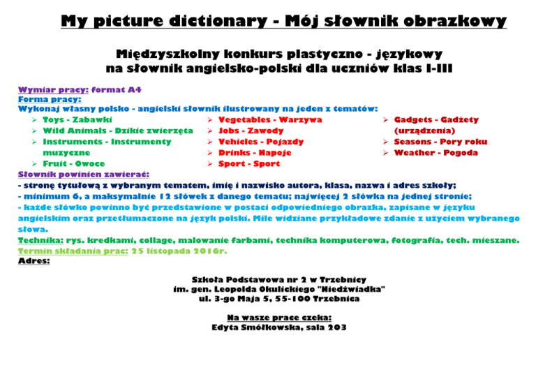 My picture dictionary - Mój słownik obrazkowy Międzyszkolny konkurs plastyczno - językowy na słownik angielsko-polski dla uczniów klas I-III Wymiar pracy: format A4 Forma pracy: Wykonaj własny polsko - angielski słownik ilustrowany na jeden z tematów:  Toys - Zabawki  Vegetables - Warzywa  Gadgets - Gadżety  Wild Animals - Dzikie zwierzęta  Jobs - Zawody (urządzenia)  Instruments - Instrumenty  Vehicles - Pojazdy  Seasons - Pory roku muzyczne  Drinks - Napoje  Weather - Pogoda  Fruit - Owoce  Sport - Sport Słownik powinien zawierać: - stronę tytułową z wybranym tematem, imię i nazwisko autora, klasa, nazwa i adres szkoły; - minimum 6, a maksymalnie 12 słówek z danego tematu; najwięcej 2 słówka na jednej stronie; - każde słówko powinno być przedstawione w postaci odpowiedniego obrazka, zapisane w języku angielskim oraz przetłumaczone na język polski. Mile widziane przykładowe zdanie z użyciem wybranego słowa. Technika: rys. kredkami, collage, malowanie farbami, technika komputerowa, fotografia, tech. mieszane. Termin składania prac: 25 listopada 2016r. Adres: Szkoła Podstawowa nr 2 w Trzebnicy im. gen. Leopolda Okulickiego "Niedźwiadka" ul. 3-go Maja 5, 55-100 Trzebnica Na wasze prace czeka: Edyta Smółkowska, sala 203