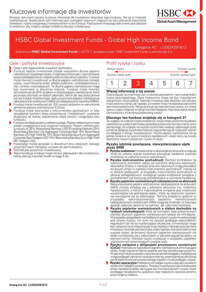 䊴 Kluczowe informacje dla inwestorów Niniejszy dokument zawiera kluczowe informacje dla inwestorów dotyczące tego funduszu. Nie są to materiały marketingowe. Dostarczenie tych informacji jest wymogiem prawnym mającym na celu ułatwienie zrozumienia charakteru i ryzyka związanego z inwestowaniem w ten fundusz. Przeczytanie niniejszego dokumentu jest zalecane inwestorowi, aby mógł on podjąć świadomą decyzję inwestycyjną. HSBC Global Investment Funds - Global High Income Bond Kategoria AC LU0524291613 Subfundusz HSBC Global Investment Funds („UCITS”), zarządzany przez HSBC Investment Funds (Luxembourg) S.A. Cele i polityka inwestycyjna 䊳 䊳 䊳 䊳 䊳 䊳 䊳 䊳 Profil ryzyka i zysku Celem jest zapewnienie wysokich dochodów. Fundusz będzie inwestował przede wszystkim dłużne papiery wartościowewysokiegoryzyka,owiększejrentowności,wyemitowane przez przedsiębiorstwa i władze publiczne dowolnych państw. Fundusz może również inwestować w dłużne papiery wartościowe niskiego ryzyka, wyemitowane przez władze publiczne i przedsiębiorstwa z Azji i rynków wschodzących. Te dłużne papiery wartościowe mogą być wyceniane w dowolnej walucie. Fundusz może również zainwestować do 20% środków w dłużne papiery wartościowe, które przynoszą dochody ze stałych płatności, takich jak raty pożyczkowe lub raty kredytu hipotecznego. (sekurytyzowane papiery wartościowe zabezpieczone na aktywach (ABS) lub zabezpieczone hipoteką (MBS)). Fundusz może inwestować do 10% swoich aktywów w warunkowe zamienne papiery wartościowe (CoCos). Fundusz może skorzystać z instrumentów pochodnych w celu zarządzania ryzykiem stopy procentowej i kredytowym, uzyskania ekspozycji na waluty, poprawienia stopy zwrotu i osiągnięcia celu funduszu. Fundusz nie śledzi poziomu referencyjnego. Poziom referencyjny może zostać uwzględniony przy wyborze inwestycji. Poziom referencyjny funduszu to 35% Bloomberg Barclays USD Emerging Markets 20% Bloomberg Barclays US Aggregate Corporate Baa 15% Bloomberg Barclays US High Yield Ba 15% Bloomberg Barclays Euro Aggregate Corporate Baa Hedged USD 15% Bloomberg Barclays Euro High Yield BB Hedged USD. Inwestycję można sprzedać w dowolnym dniu roboczym, kierując przed terminem transakcji wniosek do administratora. Dochód jest ponownie inwestowany. Rekomendacja: fundusz może nie być odpowiedni dla inwestorów, którzy planują wycofać środki w ciągu 5 lat. Niższe ryzyko Zwykle niższe zyski 1 2 Zwykle wyższe zyski 3 4 5 6 7 Więcej informacji o tej ocenie Ocena bazuje na zmienności cen w okresie pięcioletnim i jest wskaźnikiem ryzyka bezwzględnego. Dane historyczne mogą nie być miarodajnym wskaźnikiem na przyszłość. Wartość inwestycji oraz dochód z nich płynący może zarówno rosnąć, jak i spadać, a inwestor może nie odzyskać pierwotnie zainwestowanej kwoty. Nie gwarantuje się niezmienności oceny, a w miarę upływu czasu mogą się zmieniać również kategorie. Najniższa ocena nie jest równoważna z inwestycją pozbawioną ryzyka. Dlaczego ten fundusz znajduje się w kategorii 3? Ze względu na większe ryzyko kredytowe i ryzyko stopy procentowej papiery wartościowe o stałym dochodzie są bardziej ryzykowne niż instrumenty rynku pieniężnego. Ze względu na wyższe ryzyko braku realizacji zobowiązań przez emitenta obligacje wysokodochodowe mają tendencję do większych wahań niż obligacje o ratingu inwestycyjnym. Dłużne papiery wartościowe nie są jednak narażone na ryzyko inwestycji kapitałowych i dzięki temu są zwykle obarczone niższym poziomem ryzyka niż akcje. Ryzyko istotnie powiązane, niewystarczająco ujęte przez SRRI 䊳 䊳 䊳 䊳 䊳 䊳 Kategoria AC LU0524291613 Wyższe ryzyko 1z2 Ryzyko walutowe Inwestowaniewaktywadenominowanewwalucie innej niż własna waluta inwestora powoduje narażenie wartości inwestycji na wahania kursów walutowych. Ryzyko instrumentów pochodnych Wartość kontraktów na instrumenty pochodne zależy od wyników aktywów bazowych. Niewielkie zmiany w wartości aktywów bazowych mogą prowadzić do dużych zmian w wartości instrumentów pochodnych. Inaczej niż w obrocie giełdowym, w przypadku instrumentów pochodnych w obrocie pozagiełdowym występuje ryzyko kredytowe związane z kontrahentem lub instytucją pośredniczącą w wymianie handlowej. Ryzyko papierów wartościowych zabezpieczone na aktywach Sekurytyzowane papiery wartościowe zabezpieczone na aktywach (ABS) zwykle składają się z pakietów aktywów (np. kredytów hipotecznych), z którymi indywidualnie związana jest możliwość wcześniejszej lub późniejszej spłaty i które są obarczone ryzykiem nie wywiązania się ze zobowiązań. Terminy przepływu gotówki w przypadku sekurytyzowanych papierów wartościowych zabezpieczonych na aktywach (ABS) mogą się zmieniać i w znaczący sposób wpływać zarówno na wartość, jak i płynność kontraktu. Ryzyko papierów wartościowych o stałym dochodzie na rynkach wschodzących Wraz ze wzrostem stóp procentowych wartosc dluznych papierów wartosciowych bedzie sie zmniejszac. Wprzypadkugospodarekwschodzacychpoziomryzykainwestycyjnego jest zwykle wyzszy. Ich rynki nie zawsze podlegaja odpowiednim regulacjom lub nie sa wystarczajaco skuteczne, a inwestycje moga byc narazone na zmniejszona plynnosc (bedaca miara latwosci zamiany inwestycji na srodki pieniezne bez utraty kapitalu i/lub dochodów) oraz wyzsze ryzyko, ze emitenci dluznych papierów wartosciowych nie beda wywiazywac sie z zobowiazan w zakresie regularnej splaty, co stanowi norme. Wieksze ryzyko wystepuje w przypadku papierów wartosciowych przynoszacych wyzsze zyski. Ryzyko związane z obligacjami przymusowo zamiennymi (CoCo) Hybrydowe kapitałowe papiery wartościowe amortyzujące straty, kiedy kapitał emitenta spadnie poniżej określonego poziomu. Wpewnychokolicznościachwarunkowezamiennepapierywartościowe mogą podlegać zamianie na akcje emitenta, 