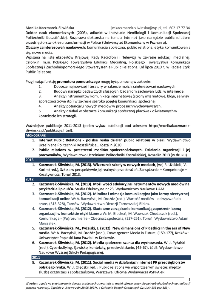 Monika Kaczmarek-Śliwińska |[email protected], tel. 602 17 77 34 Doktor nauk ekonomicznych (2005), adiunkt w Instytucie Neofilologii i Komunikacji Społecznej Politechniki Koszalińskiej. Rozprawa doktorska na temat: Internet jako narzędzie public relations przedsiębiorstw okresu transformacji w Polsce (Uniwersytet Ekonomiczny w Poznaniu). Obszary zainteresowań naukowych: komunikacja społeczna, public relations, etyka komunikowania się, nowe media. Wpisana na listę ekspertów Krajowej Rady Radiofonii i Telewizji w zakresie edukacji medialnej. Członkini m.in. Polskiego Towarzystwa Edukacji Medialnej, Polskiego Towarzystwa Komunikacji Społecznej i Zachodniopomorskiego Stowarzyszenia Public Relations. Od lipca 2010 r. w Radzie Etyki Public Relations. Przyjmując funkcję promotora pomocniczego mogę być pomocną w zakresie: 1. Doborze najnowszej literatury w zakresie moich zainteresowań naukowych. 2. Budowy narzędzi badawczych służących badaniom zachowań ludzi w internecie. 3. Analizy instrumentów komunikacji internetowej (strony internetowe, blogi, serwisy społecznościowe itp.) w zakresie szeroko pojętej komunikacji społecznej. 4. Analizy potencjału nowych mediów w procesach wychowawczych. 5. Analizy działań w obszarze komunikacji społecznej placówek oświatowych w kontekście ich strategii. Ważniejsze publikacje 2011-2013 (pełen wykaz publikacji pod adresem http://monikakaczmareksliwinska.pl/publikacje.html): MONOGRAFIE 1. Internet Public Relations - polskie realia działań public relations w Sieci, Wydawnictwo Uczelniane Politechniki Koszalińskiej, Koszalin 2010. 2. Public relations w przestrzeni mediów społecznościowych. Działania organizacji i jej pracowników, Wydawnictwo Uczelniane Politechniki Koszalińskiej, Koszalin 2013 (w druku). 2013 1. Kaczmarek-Śliwińska, M. (2013). Wizerunek szkoły w nowych mediach, [w:] R. Uździcki, V. Korim (red.), Szkoła w perspektywie jej realnych przeobrażeń. Zarządzanie – Kompetencje – Kreatywność, Toruń 2013. 2012 2. Kaczmarek-Śliwińska, M. (2013). Możliwości edukacyjne instrumentów nowych mediów na przykładzie lip dub’a. Studia Edukacyjne nr 23, Wydawnictwo Naukowe UAM. 3. Kaczmarek-Śliwińska, M. (2012). Mimikra i mimezja komunikacyjna jako formy nieetycznej komunikacji online W: A. Baczyński, M. Drożdż (red.), Wartość mediów - od wyzwań do szans, (313-328), Tarnów: Wydawnictwo Diecezji Tarnowskiej Biblos. 4. Kaczmarek-Śliwińska, M. (2012). Skuteczne zarządzanie komunikacją zapośredniczoną organizacji w kontekście etyki biznesu W: M. Biedroń, M. Wawrzak-Chodaczek (red.), Komunikacja - (Po)rozumienie - Obecność społeczna, (237-251), Toruń: Wydawnictwo Adam Marszałek. 5. Kaczmarek-Śliwińska, M., Pyżalski, J. (2012). New dimensions of PR ethics In the era of New media. W: A. Baczyński, M. Drożdż (red.), Convergence: Media in Future, (159-177), Kraków: Uniwersytet Papieski Jana Pawła II w Krakowie. 6. Kaczmarek-Śliwińska, M. (2012). Media społeczne: szansa dla wychowania. W: J. Pyżalski (red.), Cyberbullying. Zjawisko, konteksty, przeciwdziałanie, (45-67), Łódź: Wydawnictwo Naukowe Wyższej Szkoły Pedagogicznej. 2011 8. Kaczmarek-Śliwińska, M. (2011). Social media w działaniach Internet PR przedsiębiorstw polskiego rynku. W: J. Olędzki (red.), Public relations we współczesnym świecie: między służbą organizacji i społeczeństwu, Warszawa: Oficyna Wydawnicza ASPRA-JR. 1 Wyrażam zgodę na przetwarzanie danych osobowych zawartych w mojej ofercie pracy dla potrzeb niezbędnych do realizacji procesu rekrutacji. Zgodnie z Ustawą z dn.29.08.1997r. o Ochronie Danych Osobowych Dz.U.Nr 133 poz.883) . 9. Kaczmarek-Śliwińska, M. (2011). Komunikacja polityczna w cyberprzestrzeni jako nowy sposób uzyskiwania poparcia społecznego. W: A. Zorska (red.), Chaos czy twórcza destrukcja? Ku nowym modelom w gospodarce i polityce, Warszawa: Oficyna Wydawnicza. Szkoła Główna Handlowa, s. 229-246. 10. Kaczmarek-Śliwińska, M. , Pyżalski, J. (2011). Konwergencja mediów jako mechanizm wiktymizacji dziennikarzy w obszarze agresji elektronicznej. W: W. Machura, J. Sobczak (red.), Media - czwarta władza? , t. III cz. 1, Opole: Wydawnictwo Naukowe SCRIPTIORIUM, s. 133-150. 11. Kaczmarek-Śliwińska, M. (2011). Social media w Polsce i za granicą. Różnice w korzystaniu dla budowania wizerunku i innych działań PR. W: G. Piechota (red.), Public relations. Konteksty międzykulturowe i międzynarodowe (69-98), Kraków: Krakowska Akademia im. Andrzeja Frycza Modrzewskiego. 12. Kaczmarek-Śliwińska, M. , Pyżalski, J. (2011). Media społeczne (social media) jako narzędzie realizacji agresji elektronicznej. W: K. Augustyniak, A. Piotrowski (red.), Edukacja dla bezpieczeństwa. Cywilizacyjne problemy bezpieczeństwa, Poznań: Wydawnictwo Wyższej Szkoły Bezpieczeństwa, s. 61-68. 13. Pyżalski, J., Kaczmarek-Śliwińska, M. (2011). Młodzi ludzie a nowe media – obszary szans i zagrożeń. W: K. Augustyniak, A. Piotrowski (red.), Edukacja dla bezpieczeństwa. Cywilizacyjne problemy bezpieczeństwa, Poznań: Wydawnictwo Wyższej Szkoły Bezpieczeństwa, s. 111126. W TRAKCIE OPRACOWANIA 1. Public relations w sytuacjach kryzysowych organizacji. Zarządzanie komunikowaniem się / monografia, umowa wydawnicza z Difin SA. 2. Etyka public relations w nowych mediach. Uwarunkowania, postawy, doświadczenia / monografia, Wydawnictwo Naukowe Politechniki Koszalińskiej. RADY NAUKOWE / RADY REDAKCYJNE 1. Rada Redakcyjna miesięcznika „Marketing w praktyce”. 2. Rada Naukowa kwartalnika „Media i medioznawstwo”. WAŻNIEJSZE BADANIA ZREALIZOWANE I W TOKU 1. Badania statutowe Politechniki Koszalińskiej: Etyka public relations w internecie, 2012-2013, w toku. 2. Badania statutowe Politechniki Koszalińskiej: Etyka komunikowania w przestrzeni internetu w kontekście działań wizerunkowych, 2012-2013, w toku. 3. Badania statutowe Politechniki Koszalińskiej: Nowe media –