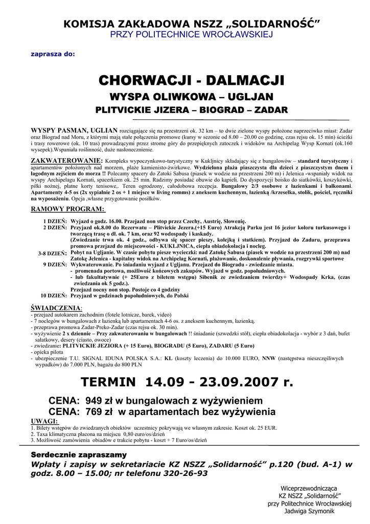 KOMISJA ZAKŁADOWA NSZZ „SOLIDARNOŚĆ” PRZY POLITECHNICE WROCŁAWSKIEJ zaprasza do: CHORWACJI - DALMACJI WYSPA OLIWKOWA – UGLJAN PLITVICKIE JIZERA – BIOGRAD – ZADAR WYSPY PASMAN, UGLIAN rozciągające się na przestrzeni ok. 32 km – to dwie zielone wyspy położone naprzeciwko miast: Zadar oraz Biograd nad Moru, z którymi mają stałe połączenia promowe (kursy w sezonie od 8.00 – 20.00 co godzinę, czas rejsu ok. 15 min) ścieżki i trasy rowerowe (ok. 10 tras) prowadzącymi przez strome góry do przepięknych zatoczek i widoków na Archipelag Wysp Kornati (ok.160 wysepek).Wspaniała roślinność, duże nasłonecznienie. ZAKWATEROWANIE: Kompleks wypoczynkowo-turystyczny w Kukljnicy składający się z bungalowów – standard turystyczny i apartamentów położonych nad morzem, plaże kamienisto-żwirkowe. Wydzielona plaża piaszczysta dla dzieci z piaszczystym dnem i łagodnym zejściem do morza !! Polecamy spacery do Zatoki Sabusa (piasek w wodzie na przestrzeni 200 m) i Jelenica -wspaniały widok na wyspy Archipelagu Kornati, spacerkiem ok. 25 min. Radzimy posiadać obuwie do kąpieli. Do dyspozycji boisko do siatkówki, koszykówki, piłki nożnej, płatne korty tenisowe,. Teren ogrodzony, całodobowa recepcja. Bungalowy 2/3 osobowe z łazienkami i balkonami. Apartamenty 4-5 os (2x sypialnie 2 os + 1 miejsce w living romms) z aneksem kuchennym, łazienką /krzesełka, stolik, pościel, ręczniki na wyposażeniu. Opcja ,własne przygotowanie posiłków. RAMOWY PROGRAM: 1 DZIEŃ: Wyjazd o godz. 16.00. Przejazd non stop przez Czechy, Austrię, Słowenię. 2 DZIEŃ: Przyjazd ok.8.00 do Rezerwatu – Plitvickie Jezera.(+15 Euro) Atrakcją Parku jest 16 jezior koloru turkusowego i tworzącą trasę o dł. ok. 7 km, oraz 92 wodospady i kaskady. (Zwiedzanie trwa ok. 4 godz., odbywa się spacer pieszy, kolejką i statkiem). Przyjazd do Zadaru, przeprawa promowa przejazd do miejscowości - KUKLJNICA, ciepła obiadokolacja i nocleg. 3-8 DZIEŃ: Pobyt na Ugljanie. W czasie pobytu piesze wycieczki: nad Zatokę Śabusa (piasek w wodzie na przestrzeni 200 m) nad Zatokę Jelenica - kapitalny widok na Archipelag Kornati, plażowanie, doskonalenie pływania, rozgrywki sportowe 9 DZIEŃ: Wykwaterowanie. Po śniadaniu wyjazd z Ugljanu. Przejazd do Biogradu - zwiedzanie miasta. - promenada portowa, możliwość końcowych zakupów. Wyjazd w godz. popołudniowych. - lub fakultatywnie (+ 25Euro z biletem wstępu) Sibenik ze zwiedzaniem twierdzy+ Wodospady Krka, (czas zwiedzania ok 5 godz.). Przejazd nocny non stop. Postoje co 4 godziny 10 DZIEŃ: Przyjazd w godzinach popołudniowych, do Polski ŚWIADCZENIA: - przejazd autokarem zachodnim (fotele lotnicze, barek, video) - 7 noclegów w bungalowach z łazienką lub apartamentach 4-6 os. z aneksem kuchennym, łazienką. - przeprawa promowa Zadar-Preko-Zadar (czas rejsu ok. 30 min). - wyżywienie 2 x dziennie – Przy zakwaterowaniu w bungalowach !! śniadanie (szwedzki stół), ciepła obiadokolacja - wybór z 3 dań, bufet sałatkowy, desery (ciasto, owoce) - zwiedzanie: PLITVICKIE JEZIORA (+ 15 Euro), BIOGRADU (5 Euro), ZADARU (5 Euro) - opieka pilota - ubezpieczenie T.U. SIGNAL IDUNA POLSKA S.A.: KL (koszty leczenia) do 10.000 EURO, NNW (następstwa nieszczęśliwych wypadków) do 7.000 PLN, bagażu do 800 PLN TERMIN 14.09 - 23.09.2007 r. CENA: 949 zł w bungalowach z wyżywieniem CENA: 769 zł w apartamentach bez wyżywienia UWAGI: 1. Bilety wstępów do zwiedzanych obiektów uczestnicy pokrywają we własnym zakresie. Koszt ok. 25 EUR. 2. Taxa klimatyczna płacona na miejscu 0,80 euro/os/dzień 3. Możliwość zamówienia obiadów e trakcie pobytu - koszt + 7 Euro/os/dzień Serdecznie zapraszamy Wpłaty i zapisy w sekretariacie KZ NSZZ „Solidarność” p.120 (bud. A-1) w godz. 8.00 – 15.00; nr telefonu 320-26-93 Wiceprzewodnicząca KZ NSZZ „Solidarność” przy Politechnice Wrocławskiej Jadwiga Szymonik