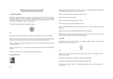 Regulamin odznak i oznak zuchowych, harcerskich i instruktorskich Związku Harcerstwa Polskiego 2.1.Odznaką organizacyjną zuchów jest metalowy znaczek (rys. 2), przedstawiający główkę białego orła i żółtą tarczę wschodzącego słońca na niebieskim tle. 1. KRZYŻ HARCERSKI Podstawę stanowi prostokąt barwy czerwonej z napisem "Zuch". 1.1.Odznaką organizacyjną harcerzy i instruktorów jest krzyż harcerski (rys. l) wzorowany na polskim odznaczeniu wojskowym - Krzyżu Kawalerskim Virtuti Militari. Na poziomych ramionach krzyża harcerskiego umieszczony jest napis "Czuwaj". Pomiędzy ramionami wpleciony jest wieniec, złożony z lewej strony z liści dębowych, z prawej z liści laurowych. 2.2.Znaczek zucha jest własnością ZHP. W środku krzyża umieszczona jest w kręgu lilijka skautowa. Zuchy otrzymują znaczek po złożeniu Obietnicy Zucha. Do noszenia znaczka uprawnia wpis do legitymacji zucha. 2.3.W razie zgubienia znaczka zuch może otrzymać go ponownie w wyniku decyzji drużynowego lub kręgu rady. 2.4.Zuchy noszą znaczek 2 cm nad środkiem lewej górnej kieszeni munduru. Rys. 1 1.2.Krzyż harcerski - płaski lub wypukły, o wysokości 25 mm, tłoczony jest w metalu i oksydowany. 1.3.Krzyż harcerski jest własnością ZHP. Otrzymuje się go po złożeniu Przyrzeczenia Harcerskiego. Do noszenia krzyża upoważnia wpis do książeczki harcerskiej lub książeczki instruktorskiej. 1.4.Przy dyscyplinarnym zwolnieniu z ZHP harcerz powinien zwrócić krzyż radzie drużyny, instruktor - komendantowi hufca. 2.5.Po przyjęciu do drużyny harcerskiej zuch może zatrzymać znaczek zucha, nosząc go na patce prawej kieszeni munduru harcerskiego jako odznakę pamiątkową. 3. LILIJKA 3.1.Znakiem Związku Harcerstwa Polskiego jest tradycyjna lilijka harcerska z inicjałami hasła filaretów "Ojczyzna, Nauka, Cnota" (rys. 3). 1.5.Krzyż harcerski nosi się 2 cm nad środkiem lewej górnej kieszeni munduru lub nad baretkami odznaczeń. Rys.3 Na ubraniu cywilnym harcerze i instruktorzy mogą nosić miniaturkę krzyża. 2. ZNACZEK ZUCHA 3.2.Lilijka ma wysokość 30 mm, na listkach umieszczone są litery "ONC", na związaniu litery "ZHP". Tłoczona jest w metalu. 3.3.Harcerze w okresie próbnym noszą lilijkę w miejsce krzyża harcerskiego. Na ubraniu cywilnym harcerze i instruktorzy mogą nosić miniaturkę lilijki. 3.4.Tradycyjnym symbolem harcerzy i instruktorów specjalności wodnej jest li-lijka połączona z kotwicą (rys. 4). Rys. 2 4.6.Instruktorzy drużyn wodnych na berecie noszą metalową lilijkę połączoną z kotwicą w kolorze złotym. Rys. 8 Rys.4 3.5.Na środku lewej kieszeni munduru zuchowego, harcerskiego i instruktorskiego nosi się emblematy przynależności do struktur światowego ruchu skautowego według wzorów określonych przez WOSM i WAGGGS. Znakiem przynależności zuchów - chłopców, harcerzy i instruktorów do Światowej Organizacji Ruchu Skautowego (WOSM) jest plakietka z białą lilijką na tle fioletowym (rys. 5). 4.7.Instruktorzy drużyn wyróżnionych "Harcerskimi skrzydłami" noszą lilijkę złotą wg wzoru jak w pkt. 4.5. 5. OZNAKI STOPNI ZUCHOWYCH, HARCERSKICH I INSTRUKTORSKICH 5.1.Oznaki stopni zuchowych Oznaką stopni zuchowych są pięcioramienne białe lub srebrne gwiazdki, wykonane z tworzywa sztucznego lub metalu. Rozpiętość ramion gwiazdek - 5 mm. Rys.5 Gwiazdki noszone są pod znaczkiem zucha na, podkładce o wym. 10x40 mm (rys. 9). Znakiem przynależności zuchów - dziewcząt, harcerek i instruktorek do Światowego Stowarzyszenia Przewodniczek i Skautek (WAGGGS) jest plakietka z żółtą koniczynką na tle niebieskim (rys. 6). Rys. 9 Poszczególne stopnie zuchowe oznaczone są: Rys.6 4. ODZNAKI NA NAKRYCIACH GŁOWY 4.1.Zuchy noszą na nakryciu głowy znaczek - symbol gromady. 4.2.Harcerze noszą metalową lilijkę koloru srebrnego. 4.3.Instruktorzy noszą metalową lilijkę koloru złotego. 4.4.Członkowie drużyn wodnych noszą metalową lilijkę połączoną z kotwicą w kolorze srebrnym. Rys.7. zuch ochoczy-jedna gwiazdka, zuch sprawny - dwie gwiazdki, zuch gospodarny - trzy gwiazdki. 5.2. Oznaki stopni harcerskich Stopnie harcerskie oznacza się na naramiennikach: ochotniczka i młodzik – jedna belka, tropicielka i wywiadowca – dwie belki, pionierka i odkrywca – jedna krokiewka, samarytanka i ćwik – dwie krokiewki, harcerka orla i harcerz orli – jedna gwiazdka, harcerka Rzeczypospolitej i harcerz Rzeczypospolitej – dwie gwiazdki. Dodatkowo stopnie harcerskie można oznaczać nabiciem na krzyżu harcerskim: pionierka i odkrywca – srebrna lilijka, samarytanka i ćwik – złota lilijka, harcerka orla i harcerz orli – złota lilijka i złoty okrąg, harcerka Rzeczypospolitej i harcerz Rzeczypospolitej – złote: lilijka, okrąg i wieniec. Rys. 12 a) Szerokość belki na naramiennikach: 5-6 mm (rys. 10a). Szerokość krokiewki na naramiennikach – 5-6 mm; krokiewka rozszerza się do góry naramiennika; kąt rozwarcia krokiewki – 90 stopni (rys. 10b). Rozpiętość gwiazdki na naramiennikach – 10 mm (rys. 10c). 5.4.Oznaki stopni instruktorskich Oznaką stopni instruktorskich są kolorowe podkładki o wymiarach krzyża harcerskiego noszone pod krzyżem: przewodnik - granatowa, Rys. 10a podharcmistrz - zielona, harcmistrz - czerwona. Ponadto oznaką stopnia instruktorskiego może być lilijka, w kolorze podkładki, o wysokości 6 cm, noszona na lewym rękawie munduru, w połowie ramienia. Rys. 10b 7. OZNAKI SPRAWNOŚCI 7.1.Oznaki sprawności zuchowych (rys. 17) Rys. 11 5.4 Naramiennik wędrowniczy Tradycyjnym symbolem wędrowników jest naramiennik wędrowniczy. Naramiennik noszą również instruktorzy pracujący z wędrownikami. Jest to symbol wędrowniczej watry wyhaftowany na zielonym materiale, noszony na lewym pagonie munduru (rys. 12). Rys.17 Oznaki sprawności zuchowych mają kształt trójkąta równobocznego o długości boku 35 mm, zwróconego wierzchołkiem ku dołowi. Symbol sprawności jest