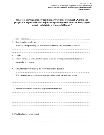 Załącznik nr 2 do Regulaminu „Gminnego programu wspierania edukacji oraz wyrównywania szans edukacyjnych dzieci i młodzieży z Gminy Jabłonna ” Wniosek o przyznanie stypendium artystyczne w ramach „Gminnego programu wspierania edukacji oraz wyrównywania szans edukacyjnych dzieci i młodzieży z Gminy Jabłonna ” 1. Imię i nazwisko:………………………………………………………….………............... 2. Data i miejsce urodzenia:…………………………………………….……………………. 3. Adres do korespondencji, nr telefonu (komórkowy i/lub stacjonarny), e-mail: ………………………………………………………………………………………………… ………………………………………………………………………………………………… 4. PESEL ………………………………………………………………………. 5. Nazwa banku i nr konta bankowego na które ma zostać przekazane stypendium w przypadku przyznania ……………………………………………………………………………. 6. Urząd Skarbowy właściwy dla celów rozliczenia podatku …………………………………………………………………………………………… 7. Wykształcenie (przy wykształceniu wyższym prosimy podać rok ukończenia studiów): ………………………………………………………………………………………………… ………………………………………………………………………………………………… …………………………………………………………………….…………………………… 7. Krótkie uzasadnienie celowości przyznania stypendium: ………………………………………………………………………………………………… ………………………………………………………………………………………………… ………………………………………………………………………………………………… ………………………………………………………………………………………………… ………………………………………………………………………………………………… ………………………………………………………………………………………………… 8. Przebieg kariery artystycznej ………………………………………………………………………………………………… ………………………………………………………………………………………………… Załączniki 1) portfolio lub dokumentacja twórczości np. dyplomy za osiągnięte wyniki 2) podpisane przez wnioskodawcę oświadczenie potwierdzające prawdziwość danych wpisanych we wniosku oraz zgodę na przetwarzanie danych osobowych. ........................................ ....................................... Data, miejscowość Podpis wnioskodawcy .................................................................... ........................................ Data, miejscowość .................................................................... .................................................................... dane wnioskodawcy (imię, nazwisko, adres zamieszkania) Oświadczenie Wnioskodawcy § 1. Świadomy/świadoma odpowiedzialności karnej potwierdzam prawdziwość danych wpisanych we wniosku. § 2. Wyrażam zgodę na przetwarzanie przez administratora danych Urzędu Gminy Jabłonna moich danych osobowych zawartych w złożonym przeze mnie wniosku w celu ich publikacji na stronach internetowych Gminy Jabłonna zgodnie z ustawą z dnia 29 sierpnia 1997 roku o ochronie danych osobowych (Dz. U. z 2002 r. Nr 101, poz. 926 z późn. zm.) oraz „Gminnym programem wspierania edukacji oraz wyrównywania szans edukacyjnych dzieci i młodzieży z Gminy Jabłonna ” ………………………………… miejscowość i data …………………………………. podpis wnioskodawcy