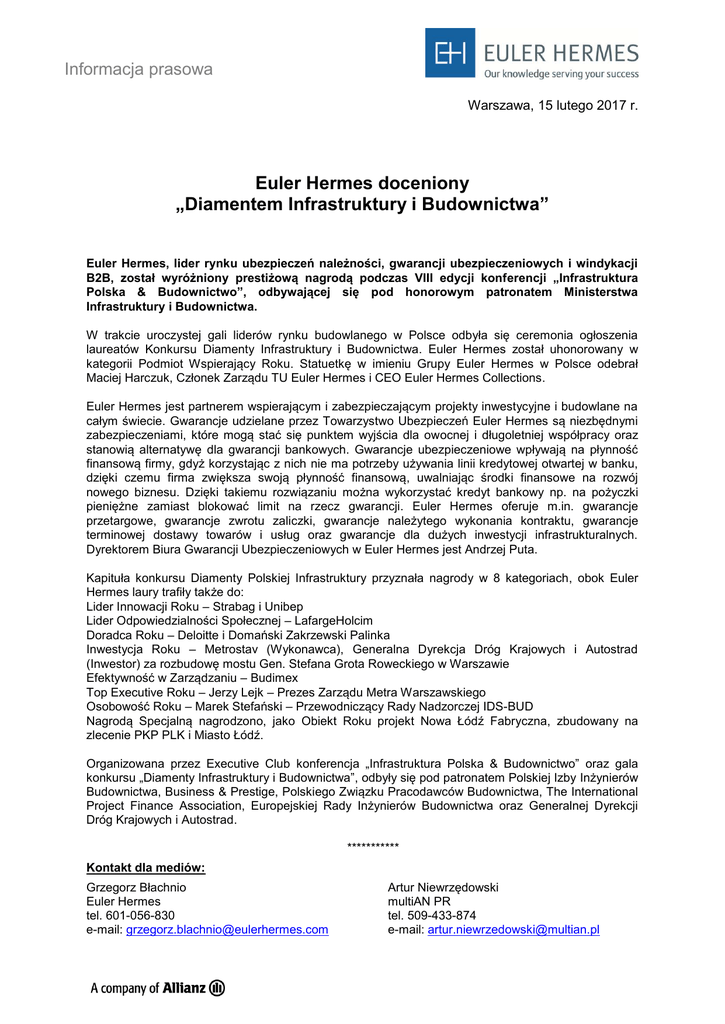 Informacja prasowa Warszawa, 15 lutego 2017 r. Euler Hermes doceniony „Diamentem Infrastruktury i Budownictwa” Euler Hermes, lider rynku ubezpieczeń należności, gwarancji ubezpieczeniowych i windykacji B2B, został wyróżniony prestiżową nagrodą podczas VIII edycji konferencji „Infrastruktura Polska & Budownictwo”, odbywającej się pod honorowym patronatem Ministerstwa Infrastruktury i Budownictwa. W trakcie uroczystej gali liderów rynku budowlanego w Polsce odbyła się ceremonia ogłoszenia laureatów Konkursu Diamenty Infrastruktury i Budownictwa. Euler Hermes został uhonorowany w kategorii Podmiot Wspierający Roku. Statuetkę w imieniu Grupy Euler Hermes w Polsce odebrał Maciej Harczuk, Członek Zarządu TU Euler Hermes i CEO Euler Hermes Collections. Euler Hermes jest partnerem wspierającym i zabezpieczającym projekty inwestycyjne i budowlane na całym świecie. Gwarancje udzielane przez Towarzystwo Ubezpieczeń Euler Hermes są niezbędnymi zabezpieczeniami, które mogą stać się punktem wyjścia dla owocnej i długoletniej współpracy oraz stanowią alternatywę dla gwarancji bankowych. Gwarancje ubezpieczeniowe wpływają na płynność finansową firmy, gdyż korzystając z nich nie ma potrzeby używania linii kredytowej otwartej w banku, dzięki czemu firma zwiększa swoją płynność finansową, uwalniając środki finansowe na rozwój nowego biznesu. Dzięki takiemu rozwiązaniu można wykorzystać kredyt bankowy np. na pożyczki pieniężne zamiast blokować limit na rzecz gwarancji. Euler Hermes oferuje m.in. gwarancje przetargowe, gwarancje zwrotu zaliczki, gwarancje należytego wykonania kontraktu, gwarancje terminowej dostawy towarów i usług oraz gwarancje dla dużych inwestycji infrastrukturalnych. Dyrektorem Biura Gwarancji Ubezpieczeniowych w Euler Hermes jest Andrzej Puta. Kapituła konkursu Diamenty Polskiej Infrastruktury przyznała nagrody w 8 kategoriach, obok Euler Hermes laury trafiły także do: Lider Innowacji Roku – Strabag i Unibep Lider Odpowiedzialności Społecznej – LafargeHolcim Doradca Roku – Deloitte i Domański Zakrzewski Palinka Inwestycja Roku – Metrostav (Wykonawca), Generalna Dyrekcja Dróg Krajowych i Autostrad (Inwestor) za rozbudowę mostu Gen. Stefana Grota Roweckiego w Warszawie Efektywność w Zarządzaniu – Budimex Top Executive Roku – Jerzy Lejk – Prezes Zarządu Metra Warszawskiego Osobowość Roku – Marek Stefański – Przewodniczący Rady Nadzorczej IDS-BUD Nagrodą Specjalną nagrodzono, jako Obiekt Roku projekt Nowa Łódź Fabryczna, zbudowany na zlecenie PKP PLK i Miasto Łódź. Organizowana przez Executive Club konferencja „Infrastruktura Polska & Budownictwo” oraz gala konkursu „Diamenty Infrastruktury i Budownictwa”, odbyły się pod patronatem Polskiej Izby Inżynierów Budownictwa, Business & Prestige, Polskiego Związku Pracodawców Budownictwa, The International Project Finance Association, Europejskiej Rady Inżynierów Budownictwa oraz Generalnej Dyrekcji Dróg Krajowych i Autostrad. *********** Kontakt dla mediów: Grzegorz Błachnio Euler Hermes tel. 601-056-830 e-mail: [email protected] Artur Niewrzędowski multiAN PR tel. 509-433-874 e-mail: [email protected] Euler Hermes to światowy lider na rynku ubezpieczeń należności handlowych oraz jeden z liderów w zakresie gwarancji ubezpieczeniowych i windykacji należności. Posiadająca ponad 100 lat doświadczenia firma oferuje klientom z sektora business-to-business (B2B) usługi finansowe, wspierające zarządzanie środkami pieniężnymi i należnościami. Sieć wywiadowni gospodarczych śledzi i analizuje codzienne zmiany wypłacalności małych, średnich oraz międzynarodowych firm działających na rynkach odpowiadających za 92% światowego PKB. Firma posiada siedzibę główną w Paryżu i działa w ponad 50 krajach, gdzie zatrudnia ponad 6.000 pracowników. Euler Hermes jest spółką zależną Allianz, notowaną na giełdzie Euronext Paris (ELE.PA) oraz posiadającą rating AA- przyznany przez Standard & Poor’s oraz Dagong Europe. W 2015 roku skonsolidowane obroty firmy wyniosły 2,6 mld €, ubezpieczyła ona na całym świecie transakcje biznesowe o wartości wynoszącej na koniec 2015 roku 890 mld €. W celu uzyskania dalszych informacji zapraszamy do odwiedzenia strony internetowej: www.eulerhermes.com, LinkedIn lub Twitter @eulerhermes *** W Polsce grupa Euler Hermes jest obecna od 1998 roku. Towarzystwo Ubezpieczeń Euler Hermes SA oferuje ubezpieczenia należności handlowych oraz gwarancje ubezpieczeniowe. Jednocześnie druga spółka działająca na polskim rynku - Euler Hermes Collections Sp. z o.o. oferuje windykację należności, raporty handlowe, ocenę ryzyka oraz program analiz branżowych. Obsługę klientów zapewnia Euler Hermes Services Polska Sp. z o.o.