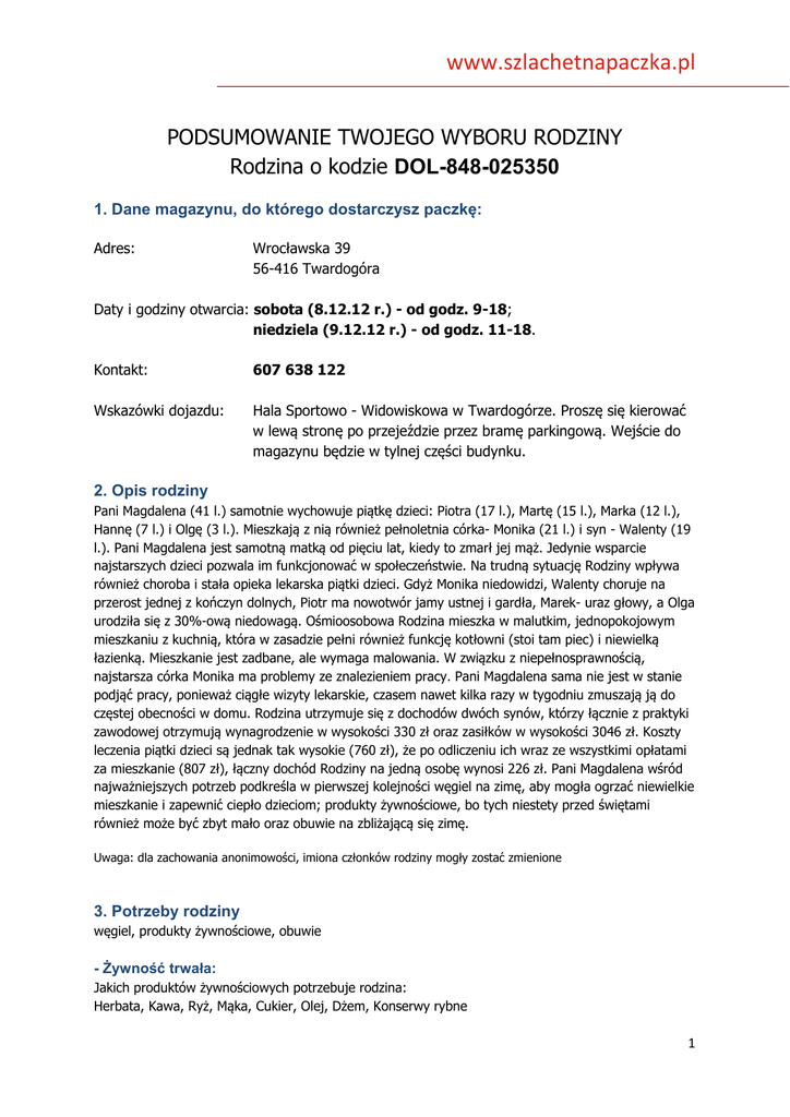 www.szlachetnapaczka.pl PODSUMOWANIE TWOJEGO WYBORU RODZINY Rodzina o kodzie DOL-848-025350 1. Dane magazynu, do którego dostarczysz paczkę: Adres: Wrocławska 39 56-416 Twardogóra Daty i godziny otwarcia: sobota (8.12.12 r.) - od godz. 9-18; niedziela (9.12.12 r.) - od godz. 11-18. Kontakt: 607 638 122 Wskazówki dojazdu: Hala Sportowo - Widowiskowa w Twardogórze. Proszę się kierować w lewą stronę po przejeździe przez bramę parkingową. Wejście do magazynu będzie w tylnej części budynku. 2. Opis rodziny Pani Magdalena (41 l.) samotnie wychowuje piątkę dzieci: Piotra (17 l.), Martę (15 l.), Marka (12 l.), Hannę (7 l.) i Olgę (3 l.). Mieszkają z nią również pełnoletnia córka- Monika (21 l.) i syn - Walenty (19 l.). Pani Magdalena jest samotną matką od pięciu lat, kiedy to zmarł jej mąż. Jedynie wsparcie najstarszych dzieci pozwala im funkcjonować w społeczeństwie. Na trudną sytuację Rodziny wpływa również choroba i stała opieka lekarska piątki dzieci. Gdyż Monika niedowidzi, Walenty choruje na przerost jednej z kończyn dolnych, Piotr ma nowotwór jamy ustnej i gardła, Marek- uraz głowy, a Olga urodziła się z 30%-ową niedowagą. Ośmioosobowa Rodzina mieszka w malutkim, jednopokojowym mieszkaniu z kuchnią, która w zasadzie pełni również funkcję kotłowni (stoi tam piec) i niewielką łazienką. Mieszkanie jest zadbane, ale wymaga malowania. W związku z niepełnosprawnością, najstarsza córka Monika ma problemy ze znalezieniem pracy. Pani Magdalena sama nie jest w stanie podjąć pracy, ponieważ ciągłe wizyty lekarskie, czasem nawet kilka razy w tygodniu zmuszają ją do częstej obecności w domu. Rodzina utrzymuje się z dochodów dwóch synów, którzy łącznie z praktyki zawodowej otrzymują wynagrodzenie w wysokości 330 zł oraz zasiłków w wysokości 3046 zł. Koszty leczenia piątki dzieci są jednak tak wysokie (760 zł), że po odliczeniu ich wraz ze wszystkimi opłatami za mieszkanie (807 zł), łączny dochód Rodziny na jedną osobę wynosi 226 zł. Pani Magdalena wśród najważniejszych potrzeb podkreśla w pierwszej kolejności węgiel na zimę, aby mogła ogrzać niewielkie mieszkanie i zapewnić ciepło dzieciom; produkty żywnościowe, bo tych niestety przed świętami również może być zbyt mało oraz obuwie na zbliżającą się zimę. Uwaga: dla zachowania anonimowości, imiona członków rodziny mogły zostać zmienione 3. Potrzeby rodziny węgiel, produkty żywnościowe, obuwie - Żywność trwała: Jakich produktów żywnościowych potrzebuje rodzina: Herbata, Kawa, Ryż, Mąka, Cukier, Olej, Dżem, Konserwy rybne 1 www.szlachetnapaczka.pl Produkty dla niemowląt: kaszka mleczno - ryżowa (Bobowita, Nestle) Inne produkty żywnościowe: nutella, krem orzechowy - Środki czystości Jakich środków czystości potrzebuje rodzina: Proszek do prania Inne: płyn do płukania tkanin - Odzież Marek Rodzaj odzieży: zimowa Kategoria: kurtka Rozmiar: 152 Typ budowy: Uwagi: Marek Rodzaj odzieży: zimowa Kategoria: kalesony Rozmiar: 152 Typ budowy: Uwagi: Piotr Rodzaj odzieży: zimowa Kategoria: czapka i szalik Rozmiar: Typ budowy: Uwagi: Marta Rodzaj odzieży: przejściowa Kategoria: spodnie Rozmiar: 160 Typ budowy: jeansy Uwagi: Magdalena Rodzaj odzieży: zimowa Kategoria: rękawiczki Rozmiar: M Typ budowy: Uwagi: - Obuwie Monika Rodzaj obuwia: zimowe Kategoria: kozaki Rozmiar: 35 Uwagi: czarne 2 www.szlachetnapaczka.pl Marta Rodzaj obuwia: zimowe Kategoria: kozaki Rozmiar: 37 Uwagi: czarne Piotr Rodzaj obuwia: przejściowe Kategoria: adidasy Rozmiar: 42 Uwagi: Marek Rodzaj obuwia: zimowe Kategoria: trapery Rozmiar: 36 Uwagi: Hanna Rodzaj obuwia: zimowe Kategoria: kozaki Rozmiar: 30 Uwagi: czarne Magdalena Rodzaj obuwia: zimowe Kategoria: kozaki Rozmiar: 40 Uwagi: czarne - Pomoce szkolne Jakich pomocy szkolnych potrzebuje rodzina? Zeszyty, Bloki, Kredki, Papier kolorowy, Klej, Plecak, Przybory do pisania Inne: Kredki bambino, pastele suche i olejne, 2 pióra dla osób leworęcznych - Wyposażenie mieszkania Jakiego wyposażenia mieszkania potrzebuje rodzina: Kołdra, Poduszka, Pościel, Ręczniki Inne: 3 kołdry, 2 komplety pościeli, 6 poduszek Brakujące sprzęty: pralka automatyczna - jak zaznacza Pani Magdalena może być używana, ważne żeby była sprawna. Pani Magdalena nie ma sprawnej pralki, a przy siódemce dzieci prania jest co nie miara. żelazko - również może być używane tak jak z pralką, każdą wypraną rzecz należy wyprasować, Pani Magdalena nie chce, aby dzieci chodziły w wygniecionych ubraniach. - Inne potrzeby maszyna do szycia, by móc dorobić "trochę grosza", węgiel - zbliża się zima, a Pani Magdalena nie chce, by jej dzieci marzły 3 www.szlachetnapaczka.pl - Specjalne upominki Hania - sukienka na bal karnawałowy Marta - perfumy Olga - wózek dla lalek Monika - srebrny łańcuszek Marek - gra komputerowa Magda - kolczyki z cyrkoniami Piotrek - śrubokręty (torksy) Walenty - perfumy 4