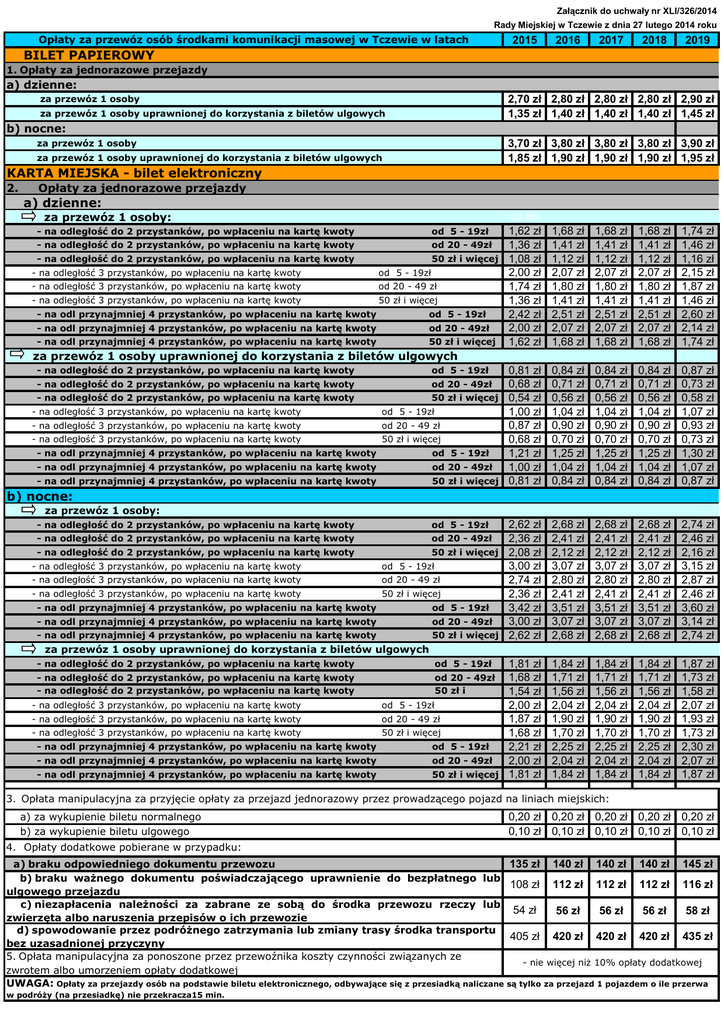 Załącznik do uchwały nr XLI/326/2014 Rady Miejskiej w Tczewie z dnia 27 lutego 2014 roku Opłaty za przewóz osób środkami komunikacji masowej w Tczewie w latach 2015 2016 2017 2018 2019 BILET PAPIEROWY 1. Opłaty za jednorazowe przejazdy a) dzienne: 2,70 zł 2,80 zł 2,80 zł 2,80 zł 2,90 zł 1,35 zł 1,40 zł 1,40 zł 1,40 zł 1,45 zł za przewóz 1 osoby za przewóz 1 osoby uprawnionej do korzystania z biletów ulgowych b) nocne: 3,70 zł 3,80 zł 3,80 zł 3,80 zł 3,90 zł 1,85 zł 1,90 zł 1,90 zł 1,90 zł 1,95 zł za przewóz 1 osoby za przewóz 1 osoby uprawnionej do korzystania z biletów ulgowych KARTA MIEJSKA - bilet elektroniczny 2. Opłaty za jednorazowe przejazdy a) dzienne: za przewóz 1 osoby: 103,85% 1,62 zł 1,36 zł - na odległość do 2 przystanków, po wpłaceniu na kartę kwoty 50 zł i więcej 1,08 zł - na odległość 3 przystanków, po wpłaceniu na kartę kwoty od 5 - 19zł 2,00 zł - na odległość 3 przystanków, po wpłaceniu na kartę kwoty od 20 - 49 zł 1,74 zł - na odległość 3 przystanków, po wpłaceniu na kartę kwoty 50 zł i więcej 1,36 zł - na odl przynajmniej 4 przystanków, po wpłaceniu na kartę kwoty od 5 - 19zł 2,42 zł - na odl przynajmniej 4 przystanków, po wpłaceniu na kartę kwoty od 20 - 49zł 2,00 zł - na odl przynajmniej 4 przystanków, po wpłaceniu na kartę kwoty 50 zł i więcej 1,62 zł za przewóz 1 osoby uprawnionej do korzystania z biletów ulgowych - na odległość do 2 przystanków, po wpłaceniu na kartę kwoty od 5 - 19zł 0,81 zł - na odległość do 2 przystanków, po wpłaceniu na kartę kwoty od 20 - 49zł 0,68 zł - na odległość do 2 przystanków, po wpłaceniu na kartę kwoty 50 zł i więcej 0,54 zł - na odległość 3 przystanków, po wpłaceniu na kartę kwoty od 5 - 19zł 1,00 zł - na odległość 3 przystanków, po wpłaceniu na kartę kwoty od 20 - 49 zł 0,87 zł - na odległość 3 przystanków, po wpłaceniu na kartę kwoty 50 zł i więcej 0,68 zł - na odl przynajmniej 4 przystanków, po wpłaceniu na kartę kwoty od 5 - 19zł 1,21 zł - na odl przynajmniej 4 przystanków, po wpłaceniu na kartę kwoty od 20 - 49zł 1,00 zł - na odl przynajmniej 4 przystanków, po wpłaceniu na kartę kwoty 50 zł i więcej 0,81 zł - na odległość do 2 przystanków, po wpłaceniu na kartę kwoty od 5 - 19zł - na odległość do 2 przystanków, po wpłaceniu na kartę kwoty od 20 - 49zł 1,68 zł 1,41 zł 1,12 zł 2,07 zł 1,80 zł 1,41 zł 2,51 zł 2,07 zł 1,68 zł 1,68 zł 1,41 zł 1,12 zł 2,07 zł 1,80 zł 1,41 zł 2,51 zł 2,07 zł 1,68 zł 1,68 zł 1,41 zł 1,12 zł 2,07 zł 1,80 zł 1,41 zł 2,51 zł 2,07 zł 1,68 zł 1,74 zł 1,46 zł 1,16 zł 2,15 zł 1,87 zł 1,46 zł 2,60 zł 2,14 zł 1,74 zł 0,84 zł 0,71 zł 0,56 zł 1,04 zł 0,90 zł 0,70 zł 1,25 zł 1,04 zł 0,84 zł 0,84 zł 0,71 zł 0,56 zł 1,04 zł 0,90 zł 0,70 zł 1,25 zł 1,04 zł 0,84 zł 0,84 zł 0,71 zł 0,56 zł 1,04 zł 0,90 zł 0,70 zł 1,25 zł 1,04 zł 0,84 zł 0,87 zł 0,73 zł 0,58 zł 1,07 zł 0,93 zł 0,73 zł 1,30 zł 1,07 zł 0,87 zł 2,68 zł 2,41 zł 2,12 zł 3,07 zł 2,80 zł 2,41 zł 3,51 zł 3,07 zł 2,68 zł 2,68 zł 2,41 zł 2,12 zł 3,07 zł 2,80 zł 2,41 zł 3,51 zł 3,07 zł 2,68 zł 2,68 zł 2,41 zł 2,12 zł 3,07 zł 2,80 zł 2,41 zł 3,51 zł 3,07 zł 2,68 zł 2,74 zł 2,46 zł 2,16 zł 3,15 zł 2,87 zł 2,46 zł 3,60 zł 3,14 zł 2,74 zł 1,84 zł 1,71 zł 1,56 zł 2,04 zł 1,90 zł 1,70 zł 2,25 zł 2,04 zł 1,84 zł 1,84 zł 1,71 zł 1,56 zł 2,04 zł 1,90 zł 1,70 zł 2,25 zł 2,04 zł 1,84 zł 1,84 zł 1,71 zł 1,56 zł 2,04 zł 1,90 zł 1,70 zł 2,25 zł 2,04 zł 1,84 zł 1,87 zł 1,73 zł 1,58 zł 2,07 zł 1,93 zł 1,73 zł 2,30 zł 2,07 zł 1,87 zł b) nocne: za przewóz 1 osoby: 2,62 zł 2,36 zł - na odległość do 2 przystanków, po wpłaceniu na kartę kwoty 50 zł i więcej 2,08 zł - na odległość 3 przystanków, po wpłaceniu na kartę kwoty od 5 - 19zł 3,00 zł - na odległość 3 przystanków, po wpłaceniu na kartę kwoty od 20 - 49 zł 2,74 zł - na odległość 3 przystanków, po wpłaceniu na kartę kwoty 50 zł i więcej 2,36 zł - na odl przynajmniej 4 przystanków, po wpłaceniu na kartę kwoty od 5 - 19zł 3,42 zł - na odl przynajmniej 4 przystanków, po wpłaceniu na kartę kwoty od 20 - 49zł 3,00 zł - na odl przynajmniej 4 przystanków, po wpłaceniu na kartę kwoty 50 zł i więcej 2,62 zł - na odległość do 2 przystanków, po wpłaceniu na kartę kwoty od 5 - 19zł - na odległość do 2 przystanków, po wpłaceniu na kartę kwoty od 20 - 49zł za przewóz 1 osoby uprawnionej do korzystania z biletów ulgowych 1,81 zł 1,68 zł 1,54 zł od 5 - 19zł 2,00 zł - na odległość 3 przystanków, po wpłaceniu na kartę kwoty od 20 - 49 zł 1,87 zł - na odległość 3 przystanków, po wpłaceniu na kartę kwoty 50 zł i więcej 1,68 zł - na odl przynajmniej 4 przystanków, po wpłaceniu na kartę kwoty od 5 - 19zł 2,21 zł - na odl przynajmniej 4 przystanków, po wpłaceniu na kartę kwoty od 20 - 49zł 2,00 zł - na odl przynajmniej 4 przystanków, po wpłaceniu na kartę kwoty 50 zł i więcej 1,81 zł - na odległość do 2 przystanków, po wpłaceniu na kartę kwoty - na odległość do 2 przystanków, po wpłaceniu na kartę kwoty - na odległość do 2 przystanków, po wpłaceniu na kartę kwoty więcej - na odległość 3 przystanków, po wpłaceniu na kartę kwoty od 5 - 19zł od 20 - 49zł 50 zł i 3. Opłata manipulacyjna za przyjęcie opłaty za przejazd jednorazowy przez prowadzącego pojazd na liniach miejskich: a) za wykupienie biletu normalnego b) za wykupienie biletu ulgowego 0,20 zł 0,20 zł 0,20 zł 0,20 zł 0,20 zł 0,10 zł 0,10 zł 0,10 zł 0,10 zł 0,10 zł 4. Opłaty dodatkowe pobierane w przypadku: a) braku odpowiedniego dokumentu przewozu 135 zł 140 zł 140 zł 140 zł 145 zł b) braku ważnego dokumentu poświadczającego uprawnienie do bezpłatnego lub 108 zł 112 zł 112 zł 112 zł 116 zł ulgowego przejazdu c) niezapłacenia na
