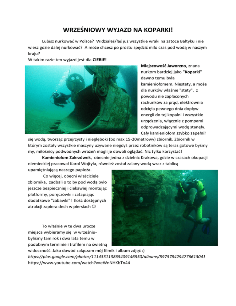 WRZEŚNIOWY WYJAZD NA KOPARKI! Lubisz nurkować w Polsce? Widziałeś/łaś już wszystkie wraki na zatoce Bałtyku i nie wiesz gdzie dalej nurkować? A może chcesz po prostu spędzić miło czas pod wodą w naszym kraju? W takim razie ten wyjazd jest dla CIEBIE! Miejscowość Jaworzno, znana nurkom bardziej jako "Koparki" dawno temu była kamieniołomem. Niestety, a może dla nurków właśnie "stety", z powodu nie zapłaconych rachunków za prąd, elektrownia odcięła pewnego dnia dopływ energii do tej kopalni i wszystkie urządzenia, włącznie z pompami odprowadzającymi wodę stanęły. Cały kamieniołom szybko zapełnił się wodą, tworząc przejrzysty i niegłęboki (bo max 15-20metrowy) zbiornik. Zbiornik w którym zostały wszystkie maszyny używane niegdyś przez robotników są teraz gotowe byśmy my, miłośnicy podwodnych wrażeń mogli je dowoli oglądać. Nic tylko korzystać! Kamieniołom Zakrzówek, obecnie jedna z dzielnic Krakowa, gdzie w czasach okupacji niemieckiej pracował Karol Wojtyła, również został zalany wodą wraz z tablicą upamiętniającą naszego papieża. Co więcej, obecni właściciele zbiornika, zadbali o to by pod wodą było jeszcze bezpieczniej i ciekawiej montując platformy, poręczówki i zatapiając dodatkowe "zabawki"! Ilość dostępnych atrakcji zapiera dech w piersiach To właśnie w te dwa urocze miejsca wybieramy się w wrześniubyliśmy tam rok i dwa lata temu w podobnym terminie i trafiłem na świetną widoczność. Jako dowód załączam mój filmik i album zdjęć :) https://plus.google.com/photos/111433113865409146550/albums/5975784294776613041 https://www.youtube.com/watch?v=eWnNHKbTn44 Wymagania; - uprawnienia minimum OWD - jeśli masz specjalność Deep Diver (możesz je zrobić na wyjeździe w promocyjnej cenie!) czekają Cie jeszcze większe wrażenia na Zakrzówku :) - Uśmiech :) Szczegóły: - Wyjeżdżamy w piątek (11.09) raniutko - Najpierw jedziemy do Jaworzna, ul. Płetwonurków 1 – wykonujemy dwa nurkowania - Wieczorem wracamy do Krakowa gdzie mamy nocleg – wcześniej możemy wybrać się do restauracji na obiad - W Sobotę (12.09) jedziemy na Zakrzówek – ok.10km km od naszego noclegu - jesteśmy tam cały dzień i możemy zrobić nawet nurkowania nocne! – w międzyczasie na bazie możemy zrobić grill - Powrót w niedzielę (13.09) – wykwaterujemy się i możemy jeszcze raz zajechać na Zakrzówek LUB Jaworzno i zrobić ostatniego nurka. - Wszelkie pytania i informacje – [email protected] lub - +48 724 132 850 Cena - 350 zł/os lub 650 zł/para a w niej : - Pełne zakwaterowanie(2 noce) w 2 osobowych pokojach w Krakowie – pokoje z łazienką i wifi - Opiekę Organizatora - Przewodnik pod wodą. - Opłaty za korzystanie i przebywanie na bazie - Film i zdjęcia! Cena nie zawiera: - Dojazdu (jeśli takowego nie masz, napisz do mnie) postaram się coś zorganizować. Jeśli znajdzie się więcej takich osób za dopłatą wynajmiemy jakiś busik - Wyżywienia, jak wspomniałem wcześnie - są aneksy kuchenne - Ładowania butli - (5 zł + 1zł za 1l objętości butli) - na wyjeździe można odbyć kurs NitrOX - Wypożyczenia sprzętu - Ubezpieczenia - jeśli chcesz takowe wykupić - napisz do mnie!