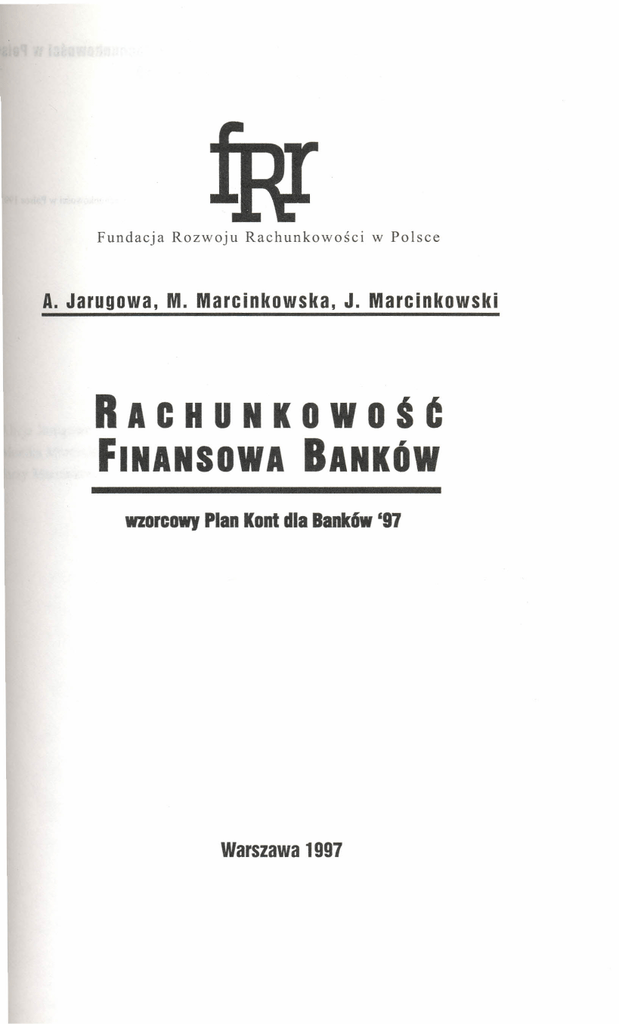 Fundacja A. Jarugowa, Rozwoju Rachunkowości M. Marcinkowska, w Polsce J. Marcinkowski RACHUNKOwoiC FINANSOWA BANKÓW wzorcowy Plan Kont dla Banków '97 Warszawa 1997 SPIS TREŚCI 11 Wstęp Rozdział l Rachunkowość bankowa w warunkach gospodarki rynkowej. 1.1 Rachunkowość 13 w procesie przechodzenia do gospodarki rynkowej. 1.2 Rachunkowość 1.3 Międzynarodowe finansowa i rachunkowość zarządcza. 13 26 regulacje rachunkowości ze szczególnym uwzględnieniem rachunkowości bankowej 32 1.3.1. Dyrektywy Unii Europejskiej. 1.3.2. Międzynarodowe Rachunkowości 1.3.3. Międzynarodowe 32 standardy (MSR). 43 wytyczne rewizji finansowej (MWRF). 1.3.4. Zalecenia ONZ. 48 52 56 1.3.5. Zalecenia OECD. lA. Regulacje prawne rachunkowości bankowej w Polsce. IA.1. Rachunkowość 59 w świetle ustawy z 29.09.l994r. 60 1A.2. Zakres podmiotowy rachunkowości. 62 104.3. Zakres przedmiotowy. 63 [AA. Fundamentalne koncepcje i zasady rachunkowości. [04.5. Prowadzenie ksiąg rachunkowych. 65 lA.6. Wycena aktywów i pasywów 70 69 [A.7. Struktura wyniku finansowego. 74 1A.8. Sprawozdanie finansowe. 77 104.9. Badanie i publikowanie sprawozdań finansowych. 78 Rozdział 2. Wprowadzenie do metodologii rachunkowości bankowej. 2.1. Kompendium rachunkowości bankowej. SI 81 2.2. Pódstawowe zasady, założenia i koncepcje rachunkowości bankowej. 120 2.3. Struktura wzorcowego planu kont banków. 128 2A. Zasady wyceny składników bilansowych banku. 158 Rozdział 3. Sprawozdania finansowe jako źródło informacji o dzialalności banku; 3.1. Ogólna charakterystyka sprawozdań finansowych. 183 183 3.2. Rachunek zysków i strat - sprawozdanie o dokonaniach banku. 3.3.Bilans banku - sprawozdanie o sytuacji finansowej. 3.3.1. Charakterystyka aktywów. 3.3.2. Charakterystyka zobowiązań i innych pasywów. 202 243 248 263 3.3.3. Charakterystyka kapitału własnego banku. 268 3A. Bilans banku według czwartej dyrektywy bis EWG. 277 3.5. Charakterystyka 284 pozycji pozabilansowych. 3.6. Informacja dodatkowa do sprawozdania finansowego banku. 289 3.7. Sprawozdanie z przepływu środków 299 pieniężnych banku (cash flow statement). Rozdział 4. Ocena działałności banków komercyjnych na podstawie sprawozdań finansowych. 353 369 4.1. Kierunki oceny działalności banków. 4.2. Analiza wskaźnikowa banków. 4.3. Analiza porównawcza i strukturalna sprawozdań finansowych. 399 Rozdział 5. Ocena wyników ekonomicznych w porównaniach banków międzybankowych. 5.1. Porównania międzybankowe jako metoda badań. 5.2. Metodologia porównywania 409 409 sytuacji finansowej banków - ranking banków. Aneks l. Wzorcowy 353 Plan Kont Banków. 413 435 Aneks 2. Jednolity Plan Kont - "SCA". 470 Bibliografia 479