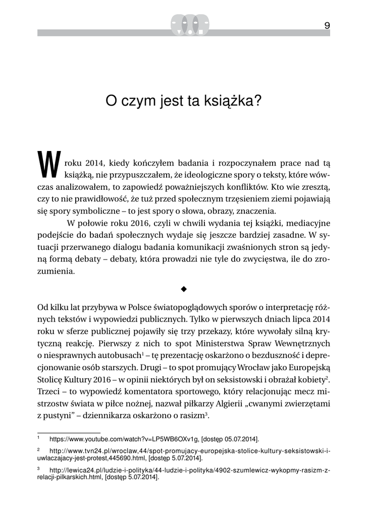 9 O czym jest ta książka? W roku 2014, kiedy kończyłem badania i rozpoczynałem prace nad tą książką, nie przypuszczałem, że ideologiczne spory o teksty, które wówczas analizowałem, to zapowiedź poważniejszych konfliktów. Kto wie zresztą, czy to nie prawidłowość, że tuż przed społecznym trzęsieniem ziemi pojawiają się spory symboliczne – to jest spory o słowa, obrazy, znaczenia. W połowie roku 2016, czyli w chwili wydania tej książki, mediacyjne podejście do badań społecznych wydaje się jeszcze bardziej zasadne. W sytuacji przerwanego dialogu badania komunikacji zwaśnionych stron są jedyną formą debaty – debaty, która prowadzi nie tyle do zwycięstwa, ile do zrozumienia. ◆ Od kilku lat przybywa w Polsce światopoglądowych sporów o interpretację różnych tekstów i wypowiedzi publicznych. Tylko w pierwszych dniach lipca 2014 roku w sferze publicznej pojawiły się trzy przekazy, które wywołały silną krytyczną reakcję. Pierwszy z nich to spot Ministerstwa Spraw Wewnętrznych o niesprawnych autobusach1 – tę prezentację oskarżono o bezduszność i deprecjonowanie osób starszych. Drugi – to spot promujący Wrocław jako Europejską Stolicę Kultury 2016 – w opinii niektórych był on seksistowski i obrażał kobiety2. Trzeci – to wypowiedź komentatora sportowego, który relacjonując mecz mistrzostw świata w piłce nożnej, nazwał piłkarzy Algierii „cwanymi zwierzętami z pustyni” – dziennikarza oskarżono o rasizm3. 1 https://www.youtube.com/watch?v=LP5WB6OXv1g, [dostęp 05.07.2014]. 2 http://www.tvn24.pl/wroclaw,44/spot-promujacy-europejska-stolice-kultury-seksistowski-iuwlaczajacy-jest-protest,445690.html, [dostęp 5.07.2014]. 3 http://lewica24.pl/ludzie-i-polityka/44-ludzie-i-polityka/4902-szumlewicz-wykopmy-rasizm-zrelacji-pilkarskich.html, [dostęp 5.07.2014]. 10 Mediacje semiotyczne Wygląda na to, że polskie społeczeństwo zaczęło sięgać po postulowaną przez Johna Fiske’a „semiotyczną demokrację” (Fiske 1999: 239), co oznaczałoby, że oprócz władzy społeczeństwo zaczyna też wybierać sposób oceniania i interpretowania treści masowej komunikacji. Głównym tematem tej książki jest zatem „semiotyczna demokracja”, a raczej „semiotyczne nieposłuszeństwo”. Nazwijmy tak reakcje na wypowiedzi czy zachowania, które prowokują protesty, a nawet wywołują ideologiczne spory. Większość takich przekazów dotyczy podstawowych kategorii społecznych, takich jak płeć, rasa, wiek, poglądy polityczne, niepełnosprawność itp., ponieważ często po krytyce tekstu pojawia się jego obrona, teksty takie możemy określać mianem „konfliktogennych”. ◆ Podstawowym celem moich badań było dotarcie do mechanizmów krytycznego odbioru tekstu – tekstu w dowolnej formie semiotycznej. Punktem wyjścia analiz były sytuacje, w których ludzie, zwykle niespecjaliści, dostrzegali w komunikacji warstwę ideologiczną i próbowali ją opisać, a nawet zdemaskować. Ich zarzuty dotyczyły przekazów multimodalnych (wielokodowych), więc nie jest to praca stricte lingwistyczna, raczej – komunikologiczna. W książce – oprócz wprowadzenia do semiotyki społecznej – omawiam dwa typy zjawisk. Pierwszy z nich nazwałem „semiotycznym protestem”. Jest to czyjaś jednostkowa, negatywna reakcja na przekaz publiczny, często zawierająca oskarżenia o deprecjację lub nawet dyskryminację konkretnej grupy społecznej. Analiza takich wypowiedzi w zestawieniu z tekstami, do których się one odnosiły, pozwoliła mi odtworzyć strategie krytycznego czytania (i patrzenia). Drugi typ omawianych zjawisk nazwałem „dyskursywnym sporem”. Pod nazwą tą kryje się sytuacja, w której reakcja na tekst przyjmuje postać społecznej debaty. Nie jest to jednak zwykła dyskusja, lecz długotrwała wymiana poglądów, która ma często charakter otwartego konfliktu między różnymi grupami czy wspólnotami światopoglądowymi. Tak właśnie należy rozumieć przymiotnik „dyskursywny” – jako „interakcyjny, zderzający perspektywy jakichś środowisk, wspólnot czy grup interesów”. W książce omawiam trzy dyskursywne spory. Przypadek pierwszy to spór o „Murzynka Bambo” – wiersz dla dzieci autorstwa Juliana Tuwima. Przypadek drugi to dyskursywny konflikt o zwyczaj ustępowania miejsca 11 O CZYM JEST TA KSIĄŻKA? w środkach transportu publicznego. Przypadek trzeci to protest środowisk prawicowych wobec postrzegania ich przez pryzmat faszyzmu. Jak widać, owe trzy debaty dotyczą zjawisk z różnych poziomów komunikacji (wiersz, skrypt kulturowy, pojęcie), ale też różnych kategorii społecznych (rasa, wiek, poglądy polityczne). ◆ Do kogo adresowana jest ta książka? Pisałem ją z myślą o szerokim gronie Czytelników – także niespecjalistów. Z tego powodu unikałem wielu właściwych lingwistyce i analizie dyskursu pojęć i terminów. Próbowałem też nadać książce przyjazną strukturę i nie przytłaczać wniosków z badań rozbudowanymi opisami teorii. Przede wszystkim jednak pisałem tę książkę z myślą o praktykach tworzących lub oceniających teksty publiczne; o badaczach komunikacji społecznej, reprezentujących – mimo wspólnego obiektu badań – różne, często hermetyczne dyscypliny. Tworząc to opracowanie, starałem się zaproponować inny model myślenia krytycznego – podejście mniej agresywne i nieautorytarne. To propozycja wymagająca refleksyjności i poznawczej empatii. Jeśli bowiem dobre relacje społeczne uznamy za wartość uniwersalną, musimy się nauczyć rozmawiać z tymi, których poglądów nie akceptujemy. Punktem wyjścia tej trudnej rozmowy jest zrozumienie mechanizmów myślenia i działania drugiej strony. Owego zrozumienia nie da się osiągnąć bez obserwacji komunikacji i reakcji ludzi, którzy jej doświadczają. Obserwacja komunikacji, prowadząca do zrozumienia różnic i tego, co wspólne – to jest właśni