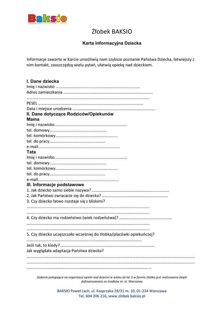 Żłobek BAKSIO Karta Informacyjna Dziecka Informacje zawarte w Karcie umożliwią nam szybsze poznanie Paostwa Dziecka, łatwiejszy z nim kontakt, zaoszczędzą wielu pytao, ułatwią opiekę nad dzieckiem. I. Dane dziecka Imię i nazwisko …………………………………...………………………………... Adres zamieszkania …………………………………..……………………………………… …………………………………………………………………………………………............... PESEL …………………..…………………………………………………………………… Data i miejsce urodzenia …………………………………………………………………….. II. Dane dotyczące Rodziców/Opiekunów Mama Imię i nazwisko................................................................ tel. domowy.................................................. tel. komórkowy....................................................... tel. do pracy................................................. e-mail........................................................................ Tata Imię i nazwisko................................................................ tel. domowy.................................................. tel. komórkowy....................................................... tel. do pracy................................................. e-mail....................................................................... III. Informacje podstawowe 1. Jak dziecko samo siebie nazywa? …………………………………………………................ 2. Jak Paostwo zwracacie się do dziecka? ……………………………………………………... 3. Czy dziecko łatwo rozstaje się z bliskimi? …………………………………………………………………………………………............... …………………………………………………………………………………………............... 4. Czy dziecko ma rodzeostwo (wiek rodzeostwa)? …………………………………………… …………………………………………………………………………………………............... …………………………………………………………………………………………............... 5. Czy dziecko uczęszczało wcześniej do żłobka/placówki opiekuoczej? ………………………………………………………………………………………………… Jeśli tak, to kiedy?………………………………………………………………………………. Jak wyglądała adaptacja Paostwa dziecka? ……………………………………………………………………………………………………………………………………………… ……………………………………………………………………………………………………………………………………………… ………………………………………………………………………………………………………… Zadanie polegające na organizacji opieki nad dziedmi w wieku do lat 3 w formie żłobka jest realizowane dzięki dofinansowaniu ze środków m. st. Warszawy BAKSIO Paweł Lach, ul. Kasprzaka 29/31 m. 10, 01-234 Warszawa Tel. 604 206 216, www.zlobek.baksio.pl 6. Które z poniżej wymienionych cech charakteryzują Paostwa dziecko? wesołe, spokojne, ruchliwe, nadpobudliwe, płaczliwe odważne, wrażliwe, lękliwe, zamknięte w sobie Inne (jakie?)……………………………………………………………………………... 7. W kontaktach z innymi dziecko? Narzuca swoją wolę Współdziała Jest uległe Obojętne Inne (jakie?)…………………………………………………………………………… 8. Które z wymienionych zachowao charakteryzuje Paostwa dziecko w złości? Płacz, Krzyk, Rzucanie na ziemię, Bicie, Obrażanie Inne (jakie?)……………………………………………………………………………... 9. Jaki jest najlepszy sposób postępowania z Paostwa dzieckiem w trakcie napadu złości? ……………………………………………………………………….................. …………………………………………………………………………………………............... 10. Czy są sytuacje, których dziecko nie lubi lub boi się?............................................................ Jakie?........................................................................................................................................... .................................................................................................................................................... 11. Co dziecko najlepiej lubi robid (proszę podkreślid): rysowad, malowad, lepid z plasteliny, budowad z klocków, słuchad bajek, oglądad książeczki, biegad, taoczyd Inne (jakie?)…………………………………………………………………………… 12. Najczęściej dziecko bawi się (proszę podkreślid): Samo, z opiekunem, z innymi dziedmi 13. Czy i w jaki sposób dziecko sygnalizuje potrzeby fizjologiczne? …………………………. …………………………………………………………………………………………............... 14. Czy dziecko porozumiewa się za pomocą słów? Jak dziecko mówi gdy: chce jeśd ………………………………………………………………………………... chce spad ……………………………………………………………………………….. coś je boli ………………………………………………………………………………. 15. Czy dziecko korzysta z nocnika? TAK/NIE 16. Czy dziecko śpi w ciągu dnia, jak długo i w jakich godzinach? …………………………… ……
