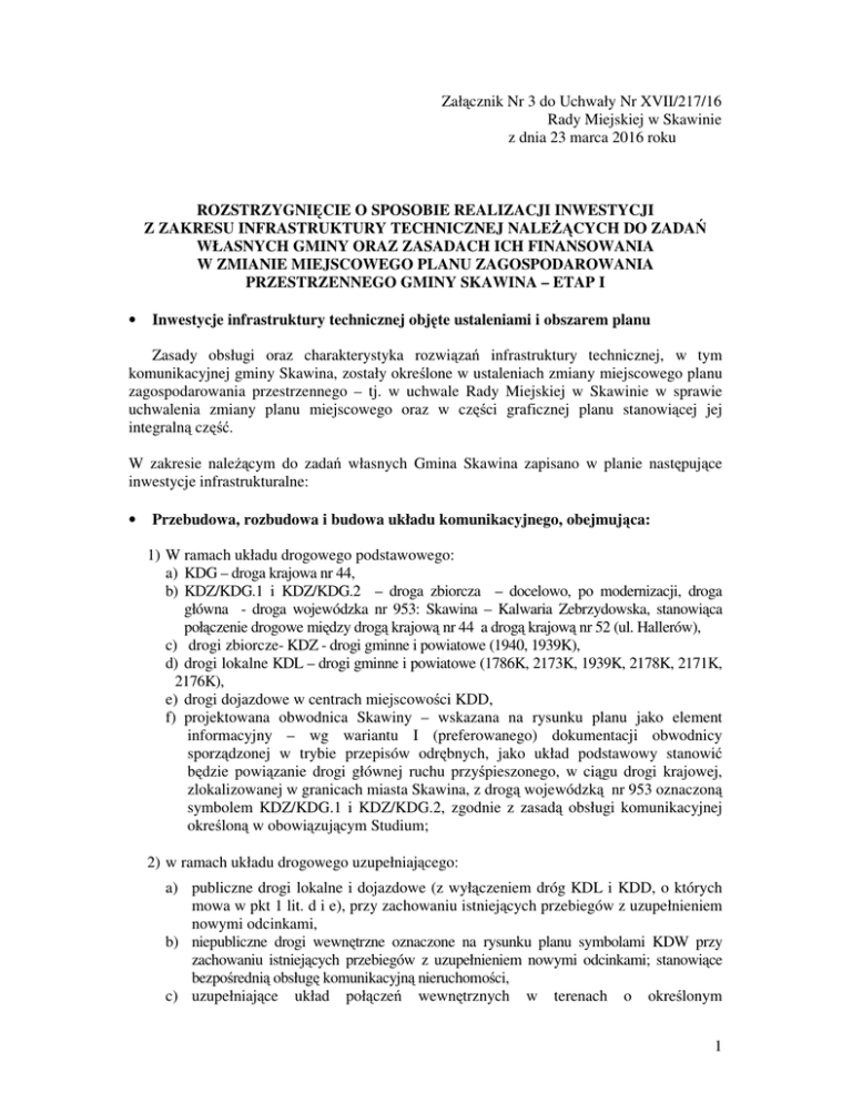 Załącznik Nr 3 do Uchwały Nr XVII/217/16 Rady Miejskiej w Skawinie z dnia 23 marca 2016 roku ROZSTRZYGNIĘCIE O SPOSOBIE REALIZACJI INWESTYCJI Z ZAKRESU INFRASTRUKTURY TECHNICZNEJ NALEŻĄCYCH DO ZADAŃ WŁASNYCH GMINY ORAZ ZASADACH ICH FINANSOWANIA W ZMIANIE MIEJSCOWEGO PLANU ZAGOSPODAROWANIA PRZESTRZENNEGO GMINY SKAWINA – ETAP I • Inwestycje infrastruktury technicznej objęte ustaleniami i obszarem planu Zasady obsługi oraz charakterystyka rozwiązań infrastruktury technicznej, w tym komunikacyjnej gminy Skawina, zostały określone w ustaleniach zmiany miejscowego planu zagospodarowania przestrzennego – tj. w uchwale Rady Miejskiej w Skawinie w sprawie uchwalenia zmiany planu miejscowego oraz w części graficznej planu stanowiącej jej integralną część. W zakresie należącym do zadań własnych Gmina Skawina zapisano w planie następujące inwestycje infrastrukturalne: • Przebudowa, rozbudowa i budowa układu komunikacyjnego, obejmująca: 1) W ramach układu drogowego podstawowego: a) KDG – droga krajowa nr 44, b) KDZ/KDG.1 i KDZ/KDG.2 – droga zbiorcza – docelowo, po modernizacji, droga główna - droga wojewódzka nr 953: Skawina – Kalwaria Zebrzydowska, stanowiąca połączenie drogowe między drogą krajową nr 44 a drogą krajową nr 52 (ul. Hallerów), c) drogi zbiorcze- KDZ - drogi gminne i powiatowe (1940, 1939K), d) drogi lokalne KDL – drogi gminne i powiatowe (1786K, 2173K, 1939K, 2178K, 2171K, 2176K), e) drogi dojazdowe w centrach miejscowości KDD, f) projektowana obwodnica Skawiny – wskazana na rysunku planu jako element informacyjny – wg wariantu I (preferowanego) dokumentacji obwodnicy sporządzonej w trybie przepisów odrębnych, jako układ podstawowy stanowić będzie powiązanie drogi głównej ruchu przyśpieszonego, w ciągu drogi krajowej, zlokalizowanej w granicach miasta Skawina, z drogą wojewódzką nr 953 oznaczoną symbolem KDZ/KDG.1 i KDZ/KDG.2, zgodnie z zasadą obsługi komunikacyjnej określoną w obowiązującym Studium; 2) w ramach układu drogowego uzupełniającego: a) publiczne drogi lokalne i dojazdowe (z wyłączeniem dróg KDL i KDD, o których mowa w pkt 1 lit. d i e), przy zachowaniu istniejących przebiegów z uzupełnieniem nowymi odcinkami, b) niepubliczne drogi wewnętrzne oznaczone na rysunku planu symbolami KDW przy zachowaniu istniejących przebiegów z uzupełnieniem nowymi odcinkami; stanowiące bezpośrednią obsługę komunikacyjną nieruchomości, c) uzupełniające układ połączeń wewnętrznych w terenach o określonym 1 przeznaczeniu niewydzielone na rysunku planu drogi, dojazdy i dojścia – do zaprojektowania na etapie zagospodarowania terenów według ustaleń planu; 3) transport zbiorowy: a) linia kolejowa obsługująca miasto Skawina, zapewniająca połączenia osobowe z Krakowem, Oświęcimiem, Zakopanem, Bielskiem – Białą oraz Suchą Beskidzką, poprzez dwie stacje kolejowe: Skawina (zlokalizowaną w centrum miasta) i Skawina Zachodnia: − Kraków Płaszów – Oświęcim nr 94, − Skawina – Sucha Beskidzka nr 97, b) linie autobusowe prowadzone będą istniejącymi i projektowanymi ulicami układu podstawowego oraz uzupełniającego. Komunikację autobusową realizują na mocy porozumień międzygminnych, regularne linie MPK oraz inne firmy przewozowe (PKS, KPPU itp.). Ponadto, uzupełnienie oferty przewozowej stanowić mogą linie autobusowe i mikrobusowe innych przewoźników. Całość inwestycji komunikacyjnych obejmuje także urządzenia towarzyszące, w tym m.in. przystanki i inne urządzenia transportu zbiorowego oraz – w infrastrukturze drogowej: chodniki, zieleń, oświetlenie, sygnalizację i urządzenia sterowania ruchem oraz urządzenia ochrony terenów przyległych przed tzw. „zanieczyszczeniami komunikacyjnymi”. • Modernizacja, rozbudowa technicznej obejmujących: i budowa pozostałych systemów infrastruktury 1) Zaopatrzenie w wodę: a) rozbudowa i modernizacja istniejących sieci wodociągowych, b) realizacja wodociągu „Radziszów – Wola Radziszowska” w oparciu o zasilanie z pompowni ZUW „Skawina”, z własnym zbiornikiem wyrównawczym, hydroforniami dla wyżej położonych przysiółków, zrealizowaną aktualnie magistralą doprowadzającą wodę – ø 250 mm [ wzdłuż ul. Radziszowskiej ], oraz rurociągami ø 200 / 150 mm tworzącymi z wodociągiem „Skawina” układy pierścieniowe; c) realizacja sieci wodociągowej, rozdzielczej dla nowo wprowadzonych terenów zabudowy mieszkaniowej i usługowej, w oparciu o zasilanie z istniejącej sieci wodociągowej; należy dążyć do tworzenia tzw. „pierścieniowego” układu sieci; 2) Odprowadzenie ścieków sanitarnych i wód opadowych: a) realizacja systemów kanalizacji zbiorczej, w pierwszej kolejności dla wsi położonych w obrębie strefy ochronnej ujęcia wody pitnej na rz. Skawince, tj. wsi: Radziszów, Wola Radziszowska, Rzozów, Gołuchowice, Jurczyce, dla których odbiornikiem ścieków będzie lewobrzeżny główny kanał sanitarny Ø 0,4m Skawina – Radziszów, co obejmuje: - realizacja systemu kanalizacji wsi Radziszów – Wola Radziszowska, z głównymi kanałami w dolinie rzek Cedron i Skawinki, - realizacja systemu kanalizacji dla sołectwa Gołuchowice, sprowadzającego ścieki do kanalizacji Rzozowa, - realizacja systemu kanalizacji dla Jurczyc, ze sprowadzeniem ścieków do układu Radziszowa, 2 - skanalizowanie wsi Polanka Hallera z przepompowaniem ścieków do systemu kanalizacji Jurczyc, - realizacja dla pozostałych wsi gminy, tj. położonych wzdłuż Kanału Łączany Skawina wsi: Jaśkowice, Pozowice, Facimiech, Ochodza, Borek Szlachecki, Kopanka, Wielkie Drogi, Zelczyna oraz wsi : Grabie i Krzęcin, odrębnych systemów kanalizacji sanitarnej wraz z realizacją przepompowni tłoczących ścieki układem grawitacyjno – ciśnieniowym poprzez kanalizację m. Skawiny do centralnej oczyszczalni ścieków w Skawinie, - realizacja lokalnych oczyszczalni ścieków dla u