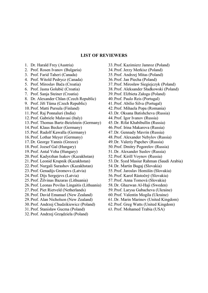 LIST OF REVIEWERS 1. Dr. Harald Frey (Austria) 2. Prof. Rosen Ivanov (Bulgaria) 3. Prof. Farid Taheri (Canada) 4. Prof. Witold Pedrycz (Canada) 5. Prof. Miroslav Bača (Croatia) 6. Prof. Jasna Golubić (Croatia) 7. Prof. Sanja Steiner (Croatia) 8. Dr. Alexander Chlan (Czech Republic) 9. Prof. Jiří Tůma (Czech Republic) 10. Prof. Matti Pursula (Finland) 11. Prof. Raj Ponnaluri (India) 12. Prof. Gabriele Malavasi (Italy) 13. Prof. Thomas Bartz-Beielstein (Germany) 14. Prof. Klaus Becker (Germany) 15. Prof. Rudolf Kawalla (Germany) 16. Prof. Lothar Meyer (Germany) 17. Dr. George Yannis (Greece) 18. Prof. Jozsef Gal (Hungary) 19. Prof. Antal Veha (Hungary) 20. Prof. Kadyrzhan Isakov (Kazakhstan) 21. Prof. Leonid Krupnik (Kazakhstan) 22. Prof. Nurgali Surashov (Kazakhstan) 23. Prof. Genadijs Gromovs (Latvia) 24. Prof. Dijs Sergejevs (Latvia) 25. Prof. Žilvinas Bazaras (Lithuania) 26. Prof. Leonas Povilas Lingaitis (Lithuania) 27. Prof. Piet Rietveld (Netherlands) 28. Prof. David Emanuel (New Zealand) 29. Prof. Alan Nicholson (New Zealand) 30. Prof. Andrzej Chudzikiewicz (Poland) 31. Prof. Stanisław Gucma (Poland) 32. Prof. Andrzej Grządziela (Poland) 33. Prof. Kazimierz Jamroz (Poland) 34. Prof. Jerzy Merkisz (Poland) 35. Prof. Andrzej Mitas (Poland) 36. Prof. Jan Piecha (Poland) 37. Prof. Mirosław Siegiejczyk (Poland) 38. Prof. Aleksander Sładkowski (Poland) 39. Prof. Elżbieta Załoga (Poland) 40. Prof. Paulo Reis (Portugal) 41. Prof. Abilio Silva (Portugal) 42. Prof. Mihaela Popa (Romania) 43. Dr. Oksana Batishcheva (Russia) 44. Prof. Igor Ivanov (Russia) 45. Dr. Rifat Khabibullin (Russia) 46. Prof. Irina Makarova (Russia) 47. Dr. Gennady Mavrin (Russia) 48. Prof. Alexander Nebylov (Russia) 49. Dr. Valeriy Papchev (Russia) 50. Prof. Dmitry Pogorelov (Russia) 51. Dr. Alexander Suslov (Russia) 52. Prof. Kirill Voynov (Russia) 53. Dr. Syed Masiur Rahman (Saudi Arabia) 54. Dr. Martin Bugaj (Slovakia) 55. Prof. Jaroslav Homišin (Slovakia) 56. Prof. Karol Rástočný (Slovakia) 57. Prof. Anna Tomová (Slovakia) 58. Dr. Ghazwan Al-Haji (Sweden) 59. Prof. Larysa Gubacheva (Ukraine) 60. Prof. Valentin Mogila (Ukraine) 61. Dr. Marin Marinov (United Kingdom) 62. Prof. Greg Watts (United Kingdom) 63. Prof. Mohamed Trabia (USA)