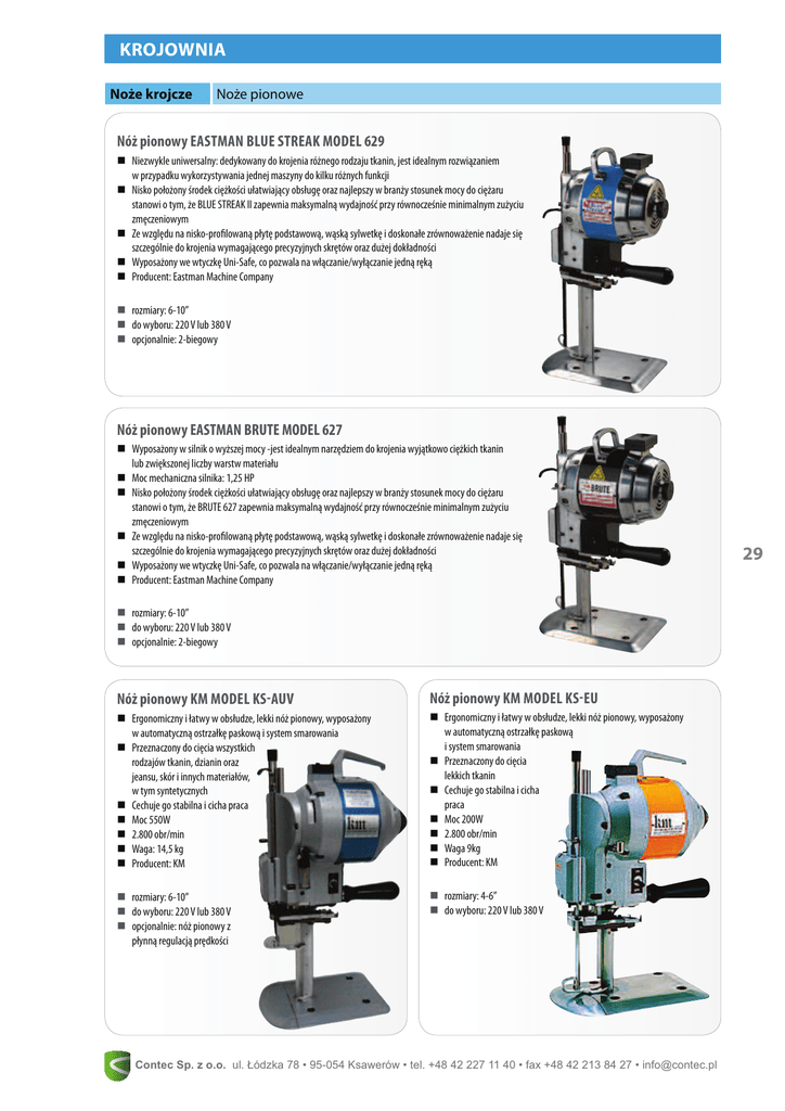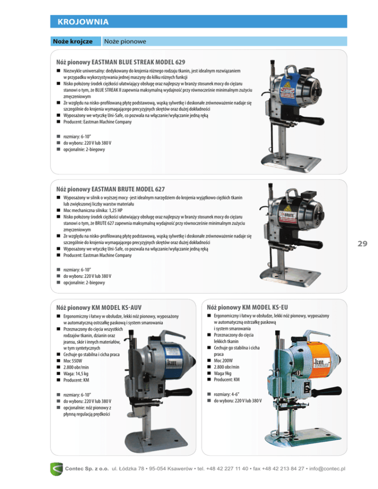 KROJOWNIA Noże krojcze Noże pionowe Nóż pionowy EASTMAN BLUE STREAK MODEL 629 n Niezwykle uniwersalny: dedykowany do krojenia różnego rodzaju tkanin, jest idealnym rozwiązaniem w przypadku wykorzystywania jednej maszyny do kilku różnych funkcji n Nisko położony środek ciężkości ułatwiający obsługę oraz najlepszy w branży stosunek mocy do ciężaru stanowi o tym, że BLUE STREAK II zapewnia maksymalną wydajność przy równocześnie minimalnym zużyciu zmęczeniowym n Ze względu na nisko-profilowaną płytę podstawową, wąską sylwetkę i doskonałe zrównoważenie nadaje się szczególnie do krojenia wymagającego precyzyjnych skrętów oraz dużej dokładności n Wyposażony we wtyczkę Uni-Safe, co pozwala na włączanie/wyłączanie jedną ręką n Producent: Eastman Machine Company n rozmiary: 6-10” n do wyboru: 220 V lub 380 V n opcjonalnie: 2-biegowy Nóż pionowy EASTMAN BRUTE MODEL 627 n Wyposażony w silnik o wyższej mocy -jest idealnym narzędziem do krojenia wyjątkowo ciężkich tkanin lub zwiększonej liczby warstw materiału n Moc mechaniczna silnika: 1,25 HP n Nisko położony środek ciężkości ułatwiający obsługę oraz najlepszy w branży stosunek mocy do ciężaru stanowi o tym, że BRUTE 627 zapewnia maksymalną wydajność przy równocześnie minimalnym zużyciu zmęczeniowym n Ze względu na nisko-profilowaną płytę podstawową, wąską sylwetkę i doskonałe zrównoważenie nadaje się szczególnie do krojenia wymagającego precyzyjnych skrętów oraz dużej dokładności n Wyposażony we wtyczkę Uni-Safe, co pozwala na włączanie/wyłączanie jedną ręką n Producent: Eastman Machine Company n rozmiary: 6-10” n do wyboru: 220 V lub 380 V n opcjonalnie: 2-biegowy Nóż pionowy KM MODEL KS-AUV Nóż pionowy KM MODEL KS-EU n Ergonomiczny i łatwy w obsłudze, lekki nóż pionowy, wyposażony w automatyczną ostrzałkę paskową i system smarowania n Przeznaczony do cięcia wszystkich rodzajów tkanin, dzianin oraz jeansu, skór i innych materiałów, w tym syntetycznych n Cechuje go stabilna i cicha praca n Moc 550W n 2.800 obr/min n Waga: 14,5 kg n Producent: KM n Ergonomiczny i łatwy w obsłudze, lekki nóż pionowy, wyposażony w automatyczną ostrzałkę paskową i system smarowania n Przeznaczony do cięcia lekkich tkanin n Cechuje go stabilna i cicha praca n Moc 200W n 2.800 obr/min n Waga 9kg n Producent: KM n rozmiary: 6-10” n do wyboru: 220 V lub 380 V n opcjonalnie: nóż pionowy z płynną regulacją prędkości n rozmiary: 4-6” n do wyboru: 220 V lub 380 V Contec Sp. z o.o. ul. Łódzka 78 • 95-054 Ksawerów • tel. +48 42 227 11 40 • fax +48 42 213 84 27 • [email protected] 29 KROJOWNIA Noże krojcze Noże tarczowe Nóż tarczowy SUPRENA 50 mm n n n n n n n n n n Poręczny nóż o opływowej, optymalnej budowie Posiada wbudowany, prosty w obsłudze system automatycznego ostrzenia Wygodny uchwyt ułatwia wykonywanie precyzyjnych operacji System podwójnej izolacji silnika podwyższa bezpieczeństwo pracy Moc silnika: 50 W Napięcie: 220 V Średnica ostrza: 50 mm Prędkość: 2800 obrotów na minutę Wysokość cięcia: do 8 mm Waga: ok. 1 kg n opcjonalnie: wersja wzmocniona Nóż tarczowy BULLMER 60 mm n Odporny i trwały nóż tarczowy wyposażony w bezpieczną instalację, standardowe 10-kątne ostrze oraz elastyczny przeciwnóż jest doskonałym narzędziem do cięcia praktycznie wszystkich rodzajów materiałów n Zastosowanie: jest wykorzystywany zarówno w przemyśle tekstylnym, jak również z powodzeniem do cięcia plastiku, a także w przemyśle meblarskim do cięcia tapicerki n Optymalny stosunek mocy do ciężaru stanowi o tym, że nóż zapewnia maksymalną wydajność przy równocześnie minimalnym zużyciu zmęczeniowym n W komplecie z mechanizmem ostrzącym n Rozmiar ostrza: 60 mm n Typ ostrza: 10-kątne n Wysokość cięcia: 10 mm n Silnik: 90 W n opcjonalnie: wąska lub szeroka stopa (podstawa) 30 Nóż tarczowy BULLMER 60mm/pneumatyczny n Niezwykle poręczny, wzmocniony nóż tarczowy, pneumatyczny wyposażony w dziesięciokątne ostrze specjalnie dedykowany do krojenia szczególnie wymagających tkanin, nawet podczas wielogodzinnej pracy n Ergonomiczny kształt sprawia, że nadaje się szczególnie do krojenia wymagającego precyzyjnych skrętów oraz dużej dokładności n Dedykowany jest do cięcia tak wymagających tkanin jak np.namioty, plandeki, materace, plastik jest również wykorzystywany z powodzeniem w przemyśle automotiv n Optymalny stosunek mocy do ciężaru stanowi o tym, że nóż zapewnia maksymalną wydajność przy równocześnie minimalnym zużyciu zmęczeniowym n Dzięki regulacji redukcji przepływu powietrza nóż dysponuje zróżnicowanym wachlarzem prędkości pracy. n Rozmiar ostrza: 60 mm n Typ ostrza: 10-kątne n Wysokość cięcia: 10 mm n Pneumatyczny silnik: 120 W Nóż tarczowy EASTMAN CARDINAL n SERIA CARDINAL obejmuje noże okrągłe o specyfikacjach technicznych idealnie dostosowanych do indywidualnych potrzeb klienta n Płyty podstawowe i rolki zapewniają masywną i stabilną podstawę oraz płynne cięcie bez drgań n Standard Narrow Silhouette pozwala wyeliminować zniekształcenia procesu cięcia oraz umożliwia dokładne wykonanie cięcia na wszystkich rodzajach materiału n Unikalna wtyczka i listwa zaciskowa pozwalają operatorowi na włączanie zasilania za pomocą jednej ręki n Ergonomiczne rozmieszczenie elementów regulacyjnych pozwala operatorowi włączać wyłącznik i ostrzałkę tą samą ręką, co zapewnia ciągłe, dokładne cięcie n Model 534 zaprojektowany został specjalnie do niskich warstw wełny, bawełny, jedwabiu i tkanin syntetycznych. Model ten przy swojej zwrotności posiada moc wystarczającą do właściwego cięcia wymienionych materiałów n rozmiary: 4-7 1/4” n opcjonalnie: 2-biegowy lub 4-biegowy KROJOWNIA Noże krojcze Odkrawacze Automatyczny odkrawacz z podnoszeniem szyny, ze stopą jezdną, HOOGS n n n n n n n