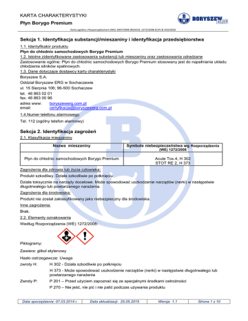 KARTA CHARAKTERYSTYKI Płyn Borygo Premium Sekcja 1