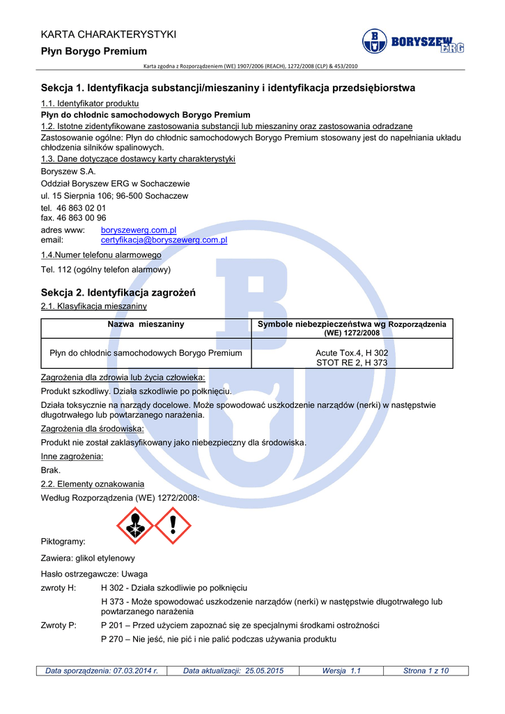 KARTA CHARAKTERYSTYKI Płyn Borygo Premium Karta zgodna z Rozporządzeniem (WE) 1907/2006 (REACH), 1272/2008 (CLP) & 453/2010 Sekcja 1. Identyfikacja substancji/mieszaniny i identyfikacja przedsiębiorstwa 1.1. Identyfikator produktu Płyn do chłodnic samochodowych Borygo Premium 1.2. Istotne zidentyfikowane zastosowania substancji lub mieszaniny oraz zastosowania odradzane Zastosowanie ogólne: Płyn do chłodnic samochodowych Borygo Premium stosowany jest do napełniania układu chłodzenia silników spalinowych. 1.3. Dane dotyczące dostawcy karty charakterystyki Boryszew S.A. Oddział Boryszew ERG w Sochaczewie ul. 15 Sierpnia 106; 96-500 Sochaczew tel. 46 863 02 01 fax. 46 863 00 96 adres www: boryszewerg.com.pl email: [email protected] 1.4.Numer telefonu alarmowego Tel. 112 (ogólny telefon alarmowy) Sekcja 2. Identyfikacja zagrożeń 2.1. Klasyfikacja mieszaniny Nazwa mieszaniny Symbole niebezpieczeństwa wg Rozporządzenia (WE) 1272/2008 Płyn do chłodnic samochodowych Borygo Premium Acute Tox.4, H 302 STOT RE 2, H 373 Zagrożenia dla zdrowia lub życia człowieka: Produkt szkodliwy. Działa szkodliwie po połknięciu. Działa toksycznie na narządy docelowe. Może spowodować uszkodzenie narządów (nerki) w następstwie długotrwałego lub powtarzanego narażenia. Zagrożenia dla środowiska: Produkt nie został zaklasyfikowany jako niebezpieczny dla środowiska. Inne zagrożenia: Brak. 2.2. Elementy oznakowania Według Rozporządzenia (WE) 1272/2008: Piktogramy: Zawiera: glikol etylenowy Hasło ostrzegawcze: Uwaga zwroty H: H 302 - Działa szkodliwie po połknięciu H 373 - Może spowodować uszkodzenie narządów (nerki) w następstwie długotrwałego lub powtarzanego narażenia Zwroty P: P 201 – Przed użyciem zapoznać się ze specjalnymi środkami ostrożności P 270 – Nie jeść, nie pić i nie palić podczas używania produktu Data sporządzenia: 07.03.2014 r. Data aktualizacji: 25.05.2015 Wersja 1.1 Strona 1 z 10 KARTA CHARAKTERYSTYKI Płyn Borygo Premium Karta zgodna z Rozporządzeniem (WE) 1907/2006 (REACH), 1272/2008 (CLP) & 453/2010 P 301+ P 312 - W przypadku połknięcia: w przypadku złego samopoczucia skontaktować się z ośrodkiem zatruć/lekarzem P 314 – W przypadku złego samopoczucia zasięgnąć porady/zgłosić się pod opiekę lekarza P 404 - Przechowywać w zamkniętym pojemniku P 501- Zawartość/pojemnik usuwać do punktu selektywnej zbiórki odpadów 2.3. Inne zagrożenia Brak informacji na temat spełnienia kryteriów PBT lub vPvB zgodnie z załącznikiem XIII rozporządzenia REACH. Odpowiednie badania nie były przeprowadzone. Długotrwałe narażenie lub wysokie stężenie par lub mgły mogą powodować słabe podrażnienie dróg oddechowych oraz bóle i zawroty głowy, nudności, senność, zaburzenia ze strony ośrodkowego układu nerwowego, mimowolny ruch oczu, śpiączkę. Kontakt ze skórą powoduje słabe podrażnienia skóry. Zanieczyszczenie oczu w warunkach przedłużającego się kontaktu powoduje umiarkowane podrażnienie oczu. Produkt palny, stwarza zagrożenie pożarowe. Może działać wybuchowo z silnymi utleniaczami. Sekcja 3. Skład/informacja o składnikach 3.1. Substancje Nie dotyczy 3.2. Mieszaniny Nazwa substancji Zakres stężeń [%] Numer CAS Numer WE Glikol etylenowy* 30 - 50 107-21-1 203-473-3 Symbole niebezpieczeństwa** Rozporządzenie (WE) 1272/2008 Acute Tox. 4 ; H 302 STOT RE. 2 ; H 373 * Numer rejestracji dla glikolu etylenowego: 01-2119456816-28-XXXX ** patrz sekcja 16 Sekcja 4. Środki pierwszej pomocy 4.1. Opis środków pierwszej pomocy Połknięcie: w razie połknięcia sprowokować wymioty, podać do wypicia ok.100ml wódki (40%) lub innego podobnego napoju alkoholowego. Wezwać natychmiast pomoc lekarską. Wdychanie: przy wystąpieniu trudności z oddychaniem podawać tlen. Wynieść poszkodowanego na świeże powietrze. Skóra: przemyć wodą z mydłem. Oczy: natychmiast przemyć oczy dużą ilością bieżącej wody przy szeroko otwartych powiekach. 4.2. Najważniejsze ostre i opóźnione objawy oraz skutki narażenia W pierwszym okresie zatrucia po połknięciu występują objawy podobne do stanu upojenia alkoholowego: stan pobudzenia, zaburzenia mowy, zaburzenia równowagi i koordynacji ruchów, bóle i zawroty głowy, senność itp. Następnie występują nudności i wymioty, biegunka. Może wystąpić zaburzenia oddychania. W przypadku ciężkich zatruć zaburzenia krążenia, przyspieszenie akcji serca, spadek ciśnienia krwi, śpiączka, utrata przytomności z drgawkami, zapaść. Możliwa śmierć z powodu zatrzymania oddychania. Dawka śmiertelna dla człowieka wynosi 100 ml. Kontakt ze skórą powoduje słabe podrażnienie skóry. Zanieczyszczenie oczu powoduje umiarkowane podrażnienie oczu przy przedłużającym się kontakcie. Skutkiem przewlekłego narażenia jest nasilenie występujących dolegliwości skórnych, oczu, dróg oddechowych. Może powodować zaburzenia i uszkodzenia nerek i wątroby, możliwe uszkodzenia mózgu. Data sporządzenia: 07.03.2014 r. Data aktualizacji: 25.05.2015 Wersja 1.1 Strona 2 z 10 KARTA CHARAKTERYSTYKI Płyn Borygo Premium Karta zgodna z Rozporządzeniem (WE) 1907/2006 (REACH), 1272/2008 (CLP) & 453/2010 4.3. Wskazania dotyczące wszelkiej natychmiastowej pomocy lekarskiej i szczególnego postępowania z poszkodowanym. Osobie nieprzytomnej nie podawać niczego doustnie i nie prowokować wymiotów. Personelowi medycznemu udzielającemu pomocy pokazać kartę charakterystyki, etykietę lub opakowanie. Wskazówki dla lekarza: Leczenie zatrucia glikolem etylenowym, odpowiednio do stanu chorego, powinno obejmować: Płukanie żołądka w czasie do 2 godzin od zatrucia, zwalczanie zaburzeń krążeniowo-oddechowych, podanie alkoholu etylenowego (dożylnie we wlewie kroplowym 5-15% roztwór alkoholu etylenowego w 5% glukozie). W przypadku ciężkich zatruć stosować hemodializę, diurezę. ( dane z sekcji 4 dotyczą 100% glikolu etylenowego) Sekcja 5. Postępowa