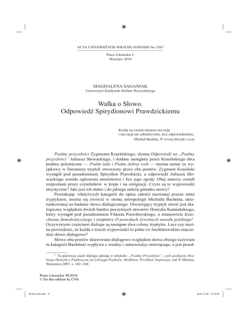ACTA UNIVERSITATIS WRATISLAVIENSIS No 3267 Prace Literackie L Wrocław 2010 MAGDALENA SAGANIAK Uniwersytet Kardynała Stefana Wyszyńskiego Walka o Słowo. Odpowiedź Spirydionowi Prawdzickiemu Każdy na swoim miejscu ma rację i ma rację nie subiektywnie, lecz odpowiedzialnie. Michaił Bachtin, W stronę filozofii czynu Psalmy przyszłości Zygmunta Krasińskiego, słynną Odpowiedź na „Psalmy przyszłości” Juliusza Słowackiego, i dodane następnie przez Krasińskiego dwa psalmy polemiczne — Psalm żalu i Psalm dobrej woli — można uznać za wyjątkowy w literaturze tryptyk stworzony przez obu poetów. Zygmunt Krasiński wystąpił pod pseudonimem Spirydion Prawdzicki, a odpowiedź Juliusza Słowackiego została ogłoszona anonimowo i bez jego zgody. Obaj autorzy zostali rozpoznani przez czytelników w kraju i na emigracji. Czym są te wypowiedzi artystyczne? Jaki jest ich status i do jakiego należą gatunku mowy? Poszukując właściwych kategorii do opisu całości nazwanej przeze mnie tryptykiem, można się zwrócić w stronę antropologii Michaiła Bachtina, ukierunkowanej na badanie słowa dialogicznego. Otwierający tryptyk utwór jest dialogiczny względem dwóch bardzo poczytnych utworów Henryka Kamieńskiego, który wystąpił pod pseudonimem Filareta Prawdowskiego, a mianowicie Katechizmu demokratycznego i rozprawy O prawdach żywotnych narodu polskiego1. Oczywistymi częściami dialogu są następne dwa człony tryptyku. Lecz czy można powiedzieć, że każda z trzech wypowiedzi to pełne (w bachtinowskim znaczeniu) słowo dialogowe? Słowo obu poetów skierowane dialogowo względem słowa obcego (używam tu kategorii Bachtina) wypływa z wiedzy i samowiedzy mówiącego, a jest przed1 Tę pierwszą część dialogu opisuję w artykule: „Psalmy Przyszłości”, czyli spotkanie Hrabiego Henryka z Pankracym, [w:] Księga Psalmów. Modlitwa. Przekład. Inspiracja, red. P. Mitzner, Warszawa 2007, s. 142–160. Prace Literackie 50/2010 © for this edition by CNS PL50_book.indb 51 2010-12-06 12:39:28 52 MAGDALENA SAGANIAK stawione przez człowieka, który tę samowiedzę reprezentuje i który rzuca na szalę swój osobisty autorytet (aczkolwiek ukryty pod pseudonimem). Poza samą dialogicznością z antropologią Bachtina wydaje się zgodne także to, że głoszona przez Kamieńskiego, a potem Krasińskiego i Słowackiego, prawda nie jest bezosobowa, lecz stanowi ideę (w rozumieniu Bachtina) wynikającą z całokształtu życia, związaną z wyborem kategorii, wartości i zasad działania, głoszoną z odpowiedzialnością i ze świadomością możliwości odmiennego wyboru dokonanego przez Innego. Posługując się nadal kategoriami Bachtina, można rozpatrzyć pytanie, czy wypowiedzi zawarte w tryptyku mogłyby stanowić „bezpośrednie słowo autora”2. Nie każda epoka otwiera drogę bezpośredniemu słowu autora, nie każda dysponuje własnym stylem, bowiem styl zakłada obecność autorytatywnych punktów widzenia, autorytatywnych, skrystalizowanych ocen ideologicznych. Gdy tego nie ma, literaturze pozostaje albo ucieczka do stylizacji, albo zwrot do pozaliterackich form wypowiedzi, zasobnych w określony sposób ujmowania i przedstawiania świata. Tam, gdzie pisarzowi brak adekwatnej formy do bezpośredniego wyrażenia swych myśli, musi on przekazywać je poprzez słowa cudze. Niekiedy zresztą samo zadanie artystyczne wymaga realizacji poprzez słowo dwugłosowe (jak przekonamy się niżej, tak właśnie rzecz się miała z Dostojewskim)3. Choć Bachtin uważał, że epoka romantyzmu otwiera drogę dla owego bezpośredniego autorskiego słowa, które występuje jako jednogłosowe w poezji romantycznej, to jednak widział powody, dla których poeta mógł obrać inną drogę artystyczną. Najprostszy namysł nad Psalmami przyszłości i Odpowiedzią prowadzi do wniosku, że mamy do czynienia z wypowiedziami dwugłosowymi, i to bardzo skomplikowanymi pod względem architektoniki wielogłosowości. Psalmy ciążą wprawdzie ku „słowu bezpośredniemu, skierowanemu wprost na swój przedmiot, wyrażającemu ostateczną pozycje myślową mówiącego”4, ale mają także cechy wypowiedzi, którą Bachtin określiłby prawdopodobnie jako słowo dwugłosowe jednokierunkowe (odnoszące się do słowa cudzego, ale wykorzystujące je do własnych celów), ponieważ są zwrotem do pozaliterackich form wypowiedzi, czyli stylizacją na psalmy, a zarazem polemiką z dwoma tekstami publicystycz2 Bachtin wyróżnia trzy typy słowa: I. Słowo bezpośrednie skierowane na swój przedmiot, wyrażające ostateczną pozycję myślową mówiącego; II. Słowo uprzedmiotowione (słowo przedstawionej postaci); III. Słowo nastawione na cudze słowo, czyli słowo dwugłosowe. Występuje ono w trzech odmianach: 1. Dwugłosowe słowo jednokierunkowe (stylizacja, narracja opowiadacza, nieuprzedmiotowione słowo bohatera, który w pewnej mierze jest nosicielem koncepcji autora, Icherzählung); 2. Dwugłosowe słowo parodystyczne (parodia w różnych odmianach, wszelkie formy przekazu cudzego ze zmienionym akcentem); 3. Typ aktywny (odzwierciedlone słowo cudze), gdzie należą: ukryta polemika wewnętrzna, autobiografia i spowiedź zabarwione polemicznie, wszelkie słowo oglądające się na słowo cudze, replika dialogu, ukryty dialog (M. Bachtin, Problemy poetyki Dostojewskiego, przeł. N. Modzelewska, Warszawa 1970, rozdz.: Słowo w dziele Dostojewskiego, tabelka na s. 301–302). 3 M. Bachtin, op. cit., s. 291. 4 Ibidem, s. 301. Prace Literackie 50/2010 © for this edition by CNS PL50_book.indb 52 2010-12-06 12:39:28 Walka o Słowo. Odpowiedź Spirydionowi Prawdzickiemu 53 nymi Filareta Prawdowskiego i z poglądami lewicy demokratycznej (typ aktywny słowa dwukierunkowego), z elementami parodystycznymi (dwugłosowe słowo parodystyczne). Odpowiedź Spirydionowi Prawdzickiemu — jako replika w dialogu — jest wprost ukształtowana dwugłosowo (typ aktywny słowa różnokieru