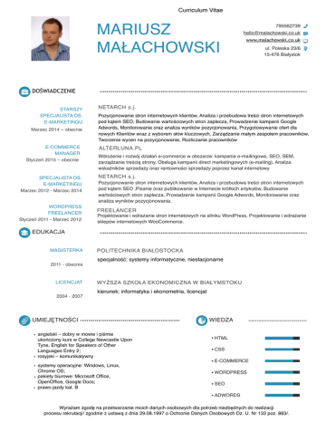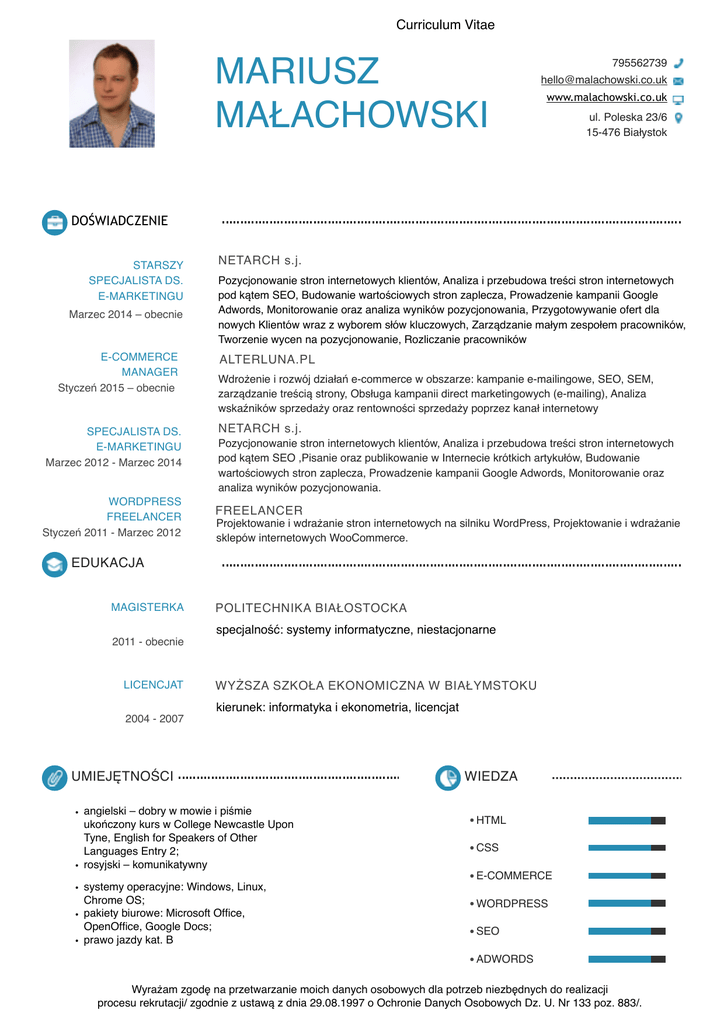 Curriculum Vitae MARIUSZ MAŁACHOWSKI 795562739 [email protected] www.malachowski.co.uk ul. Poleska 23/6 15-476 Białystok DOŚWIADCZENIE STARSZY SPECJALISTA DS. E-MARKETINGU Marzec 2014 – obecnie E-COMMERCE MANAGER Styczeń 2015 – obecnie SPECJALISTA DS. E-MARKETINGU Marzec 2012 - Marzec 2014 WORDPRESS FREELANCER Styczeń 2011 - Marzec 2012 NETARCH s.j. Pozycjonowanie stron internetowych klientów, Analiza i przebudowa treści stron internetowych pod kątem SEO, Budowanie wartościowych stron zaplecza, Prowadzenie kampanii Google Adwords, Monitorowanie oraz analiza wyników pozycjonowania, Przygotowywanie ofert dla nowych Klientów wraz z wyborem słów kluczowych, Zarządzanie małym zespołem pracowników, Tworzenie wycen na pozycjonowanie, Rozliczanie pracowników ALTERLUNA.PL Wdrożenie i rozwój działań e-commerce w obszarze: kampanie e-mailingowe, SEO, SEM, zarządzanie treścią strony, Obsługa kampanii direct marketingowych (e-mailing), Analiza wskaźników sprzedaży oraz rentowności sprzedaży poprzez kanał internetowy NETARCH s.j. Pozycjonowanie stron internetowych klientów, Analiza i przebudowa treści stron internetowych pod kątem SEO ,Pisanie oraz publikowanie w Internecie krótkich artykułów, Budowanie wartościowych stron zaplecza, Prowadzenie kampanii Google Adwords, Monitorowanie oraz analiza wyników pozycjonowania. FREELANCER Projektowanie i wdrażanie stron internetowych na silniku WordPress, Projektowanie i wdrażanie sklepów internetowych WooCommerce. EDUKACJA MAGISTERKA POLITECHNIKA BIAŁOSTOCKA specjalność: systemy informatyczne, niestacjonarne 2011 - obecnie LICENCJAT WYŻSZA SZKOŁA EKONOMICZNA W BIAŁYMSTOKU kierunek: informatyka i ekonometria, licencjat 2004 - 2007 UMIEJĘTNOŚCI • angielski – dobry w mowie i piśmie ukończony kurs w College Newcastle Upon Tyne, English for Speakers of Other Languages Entry 2; • rosyjski – komunikatywny • systemy operacyjne: Windows, Linux, Chrome OS; • pakiety biurowe: Microsoft Office, OpenOffice, Google Docs; • prawo jazdy kat. B WIEDZA HTML CSS E-COMMERCE WORDPRESS SEO ADWORDS Wyrażam zgodę na przetwarzanie moich danych osobowych dla potrzeb niezbędnych do realizacji procesu rekrutacji/ zgodnie z ustawą z dnia 29.08.1997 o Ochronie Danych Osobowych Dz. U. Nr 133 poz. 883/.