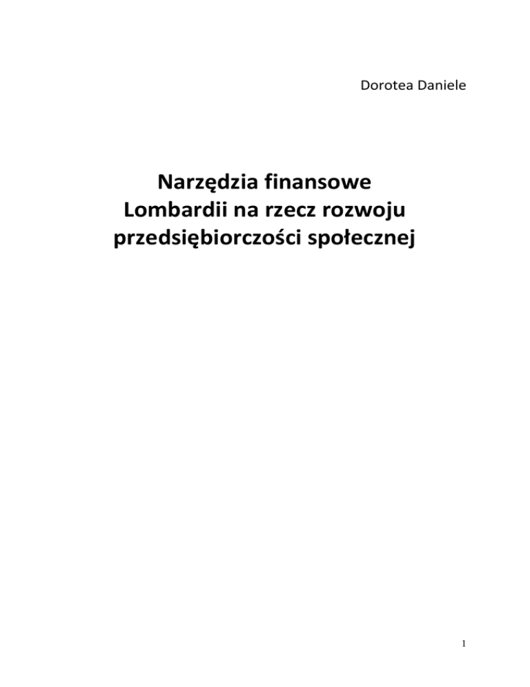 Dorotea Daniele Narzędzia finansowe Lombardii na rzecz rozwoju przedsiębiorczości społecznej 1 Spis treści: Rozdział 1 - Spółdzielnie socjalne we Włoszech s. 3 1.1 Początki spółdzielczości we Włoszech s. 3 1.2 Ustawa 381/91 i charakterystyka spółdzielni socjalnych we Włoszech s. 4 1.3 Dane liczbowe s. 5 1.4 Włoskie spółdzielnie socjalne: kluczowe czynniki rozwoju s. 8 Rozdział 2 – Narzędzia finansowania spółdzielni socjalnych w Lombardii s. 13 2.1 Finlombarda s. 13 2.2 FRIM - Rotacyjny Fundusz dla Przedsiębiorczości. s. 13 Kierunek działania – „Współpraca”. 2.3 EFS Jeremie s. 18 2.4 Dotacje dla osób niepełnosprawnych – Dote disabili s. 26 Rozdział 3 – Porównanie spółdzielczości w Lombardii i w Małopolsce s. 29 2 Rozdział 1 – Spółdzielnie socjalne we Włoszech 1.1 Początki spółdzielczości we Włoszech Spółdzielczość socjalna we Włoszech doświadczyła szybkiego i intensywnego rozwoju, który rzadko można zaobserwować w innych sektorach. Pierwsze kroki poczyniono już w latach 70tych, ale naprawdę znaczące doświadczenia miały miejsce w kolejnej dekadzie, kiedy to opracowano pierwszy projekt ustawy regulującej ten sektor i kiedy powstały pierwsze krajowe organizacje reprezentujące go. W latach 70tych i 80tych spółdzielnie generujące nowe miejsca pracy, które włączały do rynku pracy osoby zagrożone wykluczeniem (ze względu na ich stan fizyczny, psychiczny lub pozycję społeczną) i spółdzielnie oferujące usługi opiekuńczo-socjalne zostały określone mianem „spółdzielni solidarności społecznej”. W wielu przypadkach jedna i ta sama spółdzielnia pełniła obie te funkcje: włączania do pracy, a także świadczenia usług na rzecz społeczności. W niektórych regionach Włoch spółdzielnie solidarności społecznej działały w bardzo ważnych i innowacyjnych obszarach jak na przykład spółdzielnie pracy utworzone w celu integracji zawodowej osób po hospitalizacji psychiatrycznej lub w celu uruchomienia usług opieki domowej dla osób starszych. Działalność tego typu cieszyła się poparciem gmin, a była realizowana przez pracujących członków spółdzielni usługowych. Spółdzielnie często same promowały swoje usługi na terytorium swojej działalności, który to obszar przeważnie pokrywał się z terytorium gminy, prowincji (powiatu), miasta lub dzielnicy; czasem działały dzięki udziałowi członków, którzy poświęcali w ramach wolontariatu swój wolny czas i swoją pracę oraz dzięki dofinansowaniu napływającemu ze strony gmin i powiatów lub Zakładów Opieki Zdrowotnej. W tych latach pojawiły się nowe tematy i nowe problemy społeczne: • deinstytucjonalizacja, która nie dotyczyła tylko psychiatrii, ale również usług poświęconych osobom nieletnim, osobom niepełnosprawnym i osobom starszym; • dostarczanie usług opiekuńczych w miejscu zamieszkania osób, które takiej pomocy potrzebowały lub jak najbliżej miejsca ich zamieszkania; • wzrost średniego wieku społeczeństwa i zwiększenie populacji osób starszych; • coraz rzadsza obecność kobiet w środowisku rodzinnym gdzie poświęcałyby się opiece nad dziećmi, nad osobami starszymi itp. Tego typu zjawiskami kulturalnymi i społecznymi, zajmują się władze lokalne. Jednak nie zawsze dysponują odpowiednimi środkami, aby móc poradzić sobie z ich negatywnymi następstwami. Coraz częściej mówi się o kryzysie „państwa socjalnego”, które nie jest w stanie sprostać nowym wymaganiom włoskiego społeczeństwa. To właśnie spółdzielczość i inne formy organizacji trzeciego sektora stają się odpowiedzialne za zwalczanie tegoż kryzysu. Fenomen spółdzielczości socjalnej zrodził się zatem z konieczności zaspokojenia nowych potrzeb społecznych niedopełnionych przez administrację publiczną. W listopadzie 1991 roku miało miejsce zatwierdzenie ustawy nr 381. Doszło do niego w sytuacji, którą uznać można za względny rozwój. Istniały już wówczas, szczególnie na północy kraju, różnego rodzaju porozumienia i umowy pomiędzy spółdzielniami a władzą lokalną. Od tego momentu przedsiębiorstwa, o których mowa zyskały miano spółdzielni socjalnych i miały na celu zawodową integrację osób zagrożonych wykluczeniem z rynku pracy, a także zarządzanie usługami socjalno-zdrowotnymi oraz edukacyjnymi. 3 1.2 Ustawa 381/91 i charakterystyka spółdzielni socjalnych we Włoszech Innowacyjność tych organizacji podsumowuje artykuł pierwszy ustawy 381/91, który definiuje spółdzielnie socjalne jako instytucje, których celem jest dążenie do realizacji interesów wspólnych społeczności oraz integracja społeczna obywateli poprzez dwie różne formy spółdzielni: jedne zapewniają usługi socjalno-zdrowotne i edukacyjne (spółdzielnie typu A), inne gwarantują warunki sprzyjające integracji zawodowej osób zagrożonych wykluczeniem (spółdzielnie typu B). Jest to pierwszy krok w kierunku „firmy społecznej”. Biorąc pod uwagę tradycyjne ujęcie spółdzielczości, ustawa tworzy nowy rodzaj podmiotu: mamy do czynienia z organizacją o charakterze przedsiębiorstwa non-profit, której głównym zadaniem jest dążenie do zaspokojenia interesu wspólnego; pojęcie samopomocy typowe dla tradycyjnych spółdzielni nie jest tym razem ograniczone do członków spółdzielni. Spółdzielnia swoim zasięgiem obejmuje całą społeczność, w obrębie której działa, zgodnie z logiką zwaną dziś „multi-stakeholders” (zasada wielu interesariuszy). Ustawa w sposób ogólny traktuje o definicji spółdzielni i o ewentualnej regulacji tego sektora. Spółdzielnie socjalne mają następujące cechy: • w nazwie przedsiębiorstwa zawiera się termin „spółdzielnia socjalna”; • statut przewiduje również członków wolontariuszy, którzy świadczą pracę nieodpłatnie, mając prawo jedynie do zwrotu poniesionych kosztów; liczba wolontariuszy nie moż