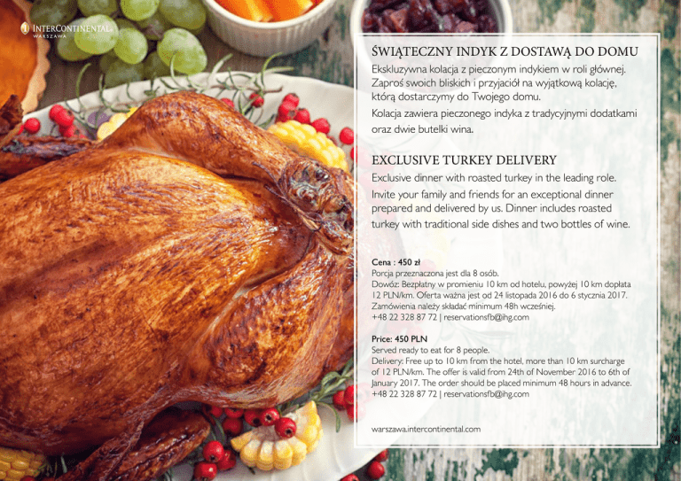 ŚWIĄTECZNY INDYK Z DOSTAWĄ DO DOMU Ekskluzywna kolacja z pieczonym indykiem w roli głównej. Zaproś swoich bliskich i przyjaciół na wyjątkową kolację, którą dostarczymy do Twojego domu. Kolacja zawiera pieczonego indyka z tradycyjnymi dodatkami oraz dwie butelki wina. EXCLUSIVE TURKEY DELIVERY Exclusive dinner with roasted turkey in the leading role. Invite your family and friends for an exceptional dinner prepared and delivered by us. Dinner includes roasted turkey with traditional side dishes and two bottles of wine. Cena : 450 zł Porcja przeznaczona jest dla 8 osób. Dowóz: Bezpłatny w promieniu 10 km od hotelu, powyżej 10 km dopłata 12 PLN/km. Oferta ważna jest od 24 listopada 2016 do 6 stycznia 2017. Zamówienia należy składać minimum 48h wcześniej. +48 22 328 87 72 | [email protected] Price: 450 PLN Served ready to eat for 8 people. Delivery: Free up to 10 km from the hotel, more than 10 km surcharge of 12 PLN/km. The offer is valid from 24th of November 2016 to 6th of January 2017. The order should be placed minimum 48 hours in advance. +48 22 328 87 72 | [email protected] warszawa.intercontinental.com