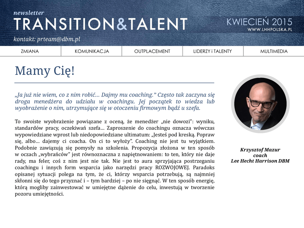 KWIECIEŃ 2015 ZMIANA KOMUNIKACJA OUTPLACEMENT LIDERZY i TALENTY MULTIMEDIA Mamy Cię! „Ja już nie wiem, co z nim robić… Dajmy mu coaching.” Często tak zaczyna się droga menedżera do udziału w coachingu. Jej początek to wiedza lub wyobrażenie o nim, utrzymujące się w otoczeniu firmowym bądź u szefa. To swoiste wyobrażenie powiązane z oceną, że menedżer „nie dowozi”: wyniku, standardów pracy, oczekiwań szefa… Zaproszenie do coachingu oznacza wówczas wypowiedziane wprost lub niedopowiedziane ultimatum: „Jesteś pod kreską. Popraw się, albo… dajemy ci coacha. On ci to wyłoży”. Coaching nie jest tu wyjątkiem. Podobnie zawiązują się pomysły na szkolenia. Propozycja złożona w ten sposób w oczach „wybrańców” jest równoznaczna z napiętnowaniem: to ten, który nie daje rady, ma feler, coś z nim jest nie tak. Nie jest to aura sprzyjająca postrzeganiu coachingu i innych form wsparcia jako narzędzi pracy ROZWOJOWEJ. Paradoks opisanej sytuacji polega na tym, że ci, którzy wsparcia potrzebują, są najmniej skłonni się do tego przyznać i – tym bardziej – po nie sięgnąć. W ten sposób energię, którą mogliby zainwestować w umiejętne dążenie do celu, inwestują w tworzenie pozoru umiejętności. Krzysztof Mazur coach Lee Hecht Harrison DBM Jesteś Talentem, ale cicho sza… Renata Tadeusiak Dyrektor TTX Institute Wyobraź sobie, że któregoś dnia otwierasz pocztę firmową i znajdujesz maila z działu HR: „Witaj Drogi Pracowniku! Ruszamy z nowym programem Akademia Rozwoju Osobistego i zapraszamy Cię na pierwsze zajęcia, które odbędą się w dniu... Gratulujemy!“. Jesteś zaskoczony - może ktoś pomylił adres, bo Marek z reklamacji ma podobny i często wpadają ci maile skierowane do niego? Myślisz: zapytam szefa, może to jednak nie pomyłka, może on wie coś więcej. Szef zajęty, ale w końcu znajduje chwilę pomiędzy spotkaniami. Mówi, że słyszał o nowej inicjatywie HR, że gratuluje Ci zaproszenia. Czemu Ty? No przecież jesteś ambitny i zawsze chciałeś się rozwijać, więc korzystaj. W kuchni, podczas lunchu, mówisz o projekcie kolegom, ale okazuje się, że oni maila nie dostali. Ale już słyszeli od innych, że Akademia rusza i też chcieliby skorzystać z tych fajnych szkoleń i okazji do wyjazdów. Program Akademii faktycznie ciekawy, jeździsz na warsztaty, sporo się uczysz, ale nie bardzo wiesz, jak wykorzystać tę wiedzę w codziennej pracy. Nie skarżysz się jednak, w końcu „zawsze chciałeś się rozwijać“... W zespole atmosfera słaba, ciągle Cię nie ma, inni podpytują, co robisz na „tych wyjazdach“ i czemu oni w tym czasie mają więcej pracy. W końcu z lekką ulgą jedziesz na ostatnie warsztaty. Idziesz do szefa podziękować. Tylko dalej zastanawiasz się nad tym, czy rok temu ten mail z zaproszeniem do programu nie był przypadkiem pomyłką. Może powinien go dostać Marek z działu reklamacji...“ Z „utajnianiem“ programów talentowych spotykamy się coraz częściej. Za tym pomysłem kryją się zwykle obawy o rozbudzenie nadmiernych roszczeń uczestników, o pytania o zasady naboru od tych, którzy się „nie załapali“ i o ogólna niechęć przełożonych do jakiegokolwiek angażowania się w projekt. Strategia ta przynosi najczęściej skutki odwrotne do oczekiwań związanych z istotą programów talentowych. I przeczy ich fundamentalnej idei. Czyż stawia się bowiem światło pod korcem? Zatrudnijmy dla odmiany dojrzalszych Uprzedzenia wobec dojrzalszych kandydatów sięgają okresu transformacji ustrojowej. Powstające wtedy firmy, szczególnie te zagraniczne, sięgały po kadry młode, nieskażone pracą epoki socjalizmu. Mimo upływu ćwierćwiecza coś z tego myślenia nadal przetrwało… Dodatkowo dystans do seniorów wypływa z wydawałoby się racjonalnych obaw dotyczących stanu zdrowia, motywacji, gotowości uczenia się, elastyczności, zdolności do współpracy z młodszymi. Towarzysząc osobom z tej grupy wiekowej w przechodzeniu przez zmiany zawodowe widzę, jak rzeczywistość odbiega od rozpowszechnionych wyobrażeń. Zacznijmy od kwestii zdrowotnych - tu same statystyki wykorzystania zwolnień nie potwierdzają obaw pracodawców (raport ZUS/Absencje chorobowe/2013). Jasnym potwierdzeniem motywacji tej grupy jest wytrwałość w poszukiwaniu pracy, pomimo niesprzyjającej im aury. Słuszności podejrzenia o brak elastyczności zaprzeczają nie zawsze łatwe decyzje o dostosowaniu własnych oczekiwań do aktualnych możliwości rynkowych, także w kwestiach płacowych. Podejmowane kursy, szkolenia, studia oraz przypadki zdobywania zupełnie nowych kwalifikacji zaprzeczają teorii, że tej grupie brakuje chęci do rozwoju. Czy w świetle powyższych faktów zmiana nastawienia pracodawców rzeczywiście musi być dopiero „wyegzekwowana” przez zmieniającą się strukturę wiekową pracowników? Wydaje się, że często brakuje jedynie gotowości przełamania stereotypu i odejścia od nawykowego myślenia wynikającego z historii i uprzedzeń. Przecież zasadność opisanych wątpliwości łatwo da się zweryfikować, podejmując więcej decyzji rekrutacyjnych na korzyść dojrzalszych kandydatów. Używając przekory, można by poprosić pracodawców, aby uczciwie przyjrzeli się swojej elastyczności i zdolności uczenia się w zakresie doboru pracowników ze względu na wiek. Niech ta krótka refleksja stanie się impulsem do większego wykorzystywania potencjału osób bardziej zawodowo i życiowo doświadczonych, z korzyścią dla firm. Jacek Zimnicki konsultant kariery Lee Hecht Harrison DBM MEDIA FLASH „Obca ocena pracownika obdarzona ryzykiem” Gazeta Prawna K. Topolska 2015 02 11 Podanie przyczyny zwolnienia pracownika, gdy oficjalnie rozwiązanie umowy następuje z przyczyn leżących po stronie firmy, prowadzi do swego rodzaju paradoksu. W wypowiedzeniu umowy o pracę firma określa, że rozwiązuje ją z przyczyn nie