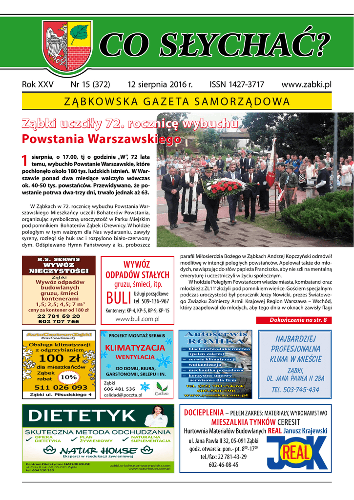 Rok XXV Nr 15 (372) 12 sierpnia 2016 r. ISSN 1427-3717 www.zabki.pl Z ą b k o w s k a G a z e ta S a m o rz ą d o wa Ząbki uczciły 72. rocznicę wybuchu Powstania Warszawskiego 1 sierpnia, o 17.00, tj o godzinie „W”, 72 lata temu, wybuchło Powstanie Warszawskie, które pochłonęło około 180 tys. ludzkich istnień. W Warszawie ponad dwa miesiące walczyło wówczas ok. 40-50 tys. powstańców. Przewidywano, że powstanie potrwa dwa-trzy dni, trwało jednak aż 63. W Ząbkach w 72. rocznicę wybuchu Powstania Warszawskiego Mieszkańcy uczcili Bohaterów Powstania, organizując symboliczną uroczystość w Parku Miejskim pod pomnikiem Bohaterów Ząbek i Drewnicy. W hołdzie poległym w tym ważnym dla Nas wydarzeniu, zawyły syreny, rozległ się huk rac i rozpylono biało-czerwony dym. Odśpiewano Hymn Państwowy a ks. proboszcz Wywóz odpadów budowlanych gruzu, śmieci kontenerami 1,5; 2,5; 4,5; 7 m3 ceny za kontener od 180 zł WYWÓZ ODPADÓW STAŁYCH gruzu, śmieci, itp. BULI Usługi porządkowe tel. 509-136-967 Kontenery: KP-4, KP-5, KP-9, KP-15 parafii Miłosierdzia Bożego w Ząbkach Andrzej Kopczyński odmówił modlitwę w intencji poległych powstańców. Apelował także do młodych, nawiązując do słów papieża Franciszka, aby nie szli na mentalną emeryturę i uczestniczyli w życiu społecznym. W hołdzie Poległym Powstańcom władze miasta, kombatanci oraz młodzież z ZL11’ złożyli pod pomnikiem wieńce. Gościem specjalnym podczas uroczystości był porucznik Jerzy Nowicki, prezes Światowego Związku Żołnierzy Armii Krajowej Region Warszawa – Wschód, który zaapelował do młodych, aby tego dnia w oknach zawisły flagi www.buli.com.pl PROJEKT MONTAŻ SERWIS KLIMATYZACJA Dokończenie na str. 8 Autoserwis ROMIKA – blacharstwo-lakiernictwo WENTYLACJA DO DOMU, BIURA, GARSTONOMII, SKLEPU I IN. Ząbki 6 06 481 53 6 [email protected] Najbardziej profesjonalna klima w mieście Ząbki, ul. Jana Pawła II 28A www.romika.com.pl tel. 503-745-434 Docieplenia – pełen zakres: materiały, wykonawstwo Mieszalnia tynków Ceresit Hurtownia Materiałów Budowlanych Real Janusz Krajewski ul. Jana Pawła II 32, 05-091 Ząbki godz. otwarcia: pon.- pt. 800-1700 tel./fax: 22 781-43-29 602-46-08-45 CO SŁYCHAĆ Społeczeństwo Pożegnanie ks. Edwarda Kowary www.zabki.pl Z ogromnym żalem żegnamy naszą długoletnią Koleżankę Marię Matusiak Na ręce Rodziny składamy wyrazy głębokiego współczucia z powodu odejścia dobrego, ciepłego i życzliwego Człowieka. koleżanki, koledzy i pracownicy Ośrodka Pomocy Społecznej oraz Urzędu Miasta Ząbki K ażdy kapłan z bólem serca przyjmuje wiadomość o przeniesieniu go na inną parafię. Ból ten jest tym większy, im dłużej trwa łączność kapłana z miejscem jego posługiwania. W niedzielę, 7 sierpnia, na mszy świętej, o godz. 10.00, po 16 latach pracy, z parafią św. Trójcy w Ząbkach pożegnał się ksiądz prałat Edward Kowara, wieloletni proboszcz kościoła przy ulicy Piłsudskiego. Dokończenie – na str. 9 Podziękowanie W imieniu mieszkańców oraz własnym, składam serdeczne podziękowania dla Władz Miasta Ząbki, za niezwykle szybką reakcję na złożony przeze mnie wniosek, dotyczący uskoku na połączeniu ul. 3-go Maja z ul. Piłsudskiego. Uskok powstał w miejscu połączenia dwóch różnych nawierzchni, tj. asfaltu oraz kostki i stwarzał zagrożenie dla użytkowników tych dróg. Pracownicy Urzędu Miasta podjęli działania zmierzające do zniwelowania nierówności i zakończyli prace w zadeklarowanym przez Pana Burmistrza terminie. Z wyrazami szacunku Krzysztof Kacprzak GABINET LEKARSKI ANDRZEJ KACZOREK Ząbki ul. Niepodległości 1A – internista – specjalista med. rodzinnej i medycyny pracy – badania profilaktyczne pracowników (wstępne, okresowe, kontrolne) – badania dla celów sanitarno-epidemiologicznych – badania kierowców wszystkich kategorii – EKG, spirometria (bad. układu oddechowego) – drobne zabiegi (zastrzyki) Gabinet czynny codziennie tylko po uzgodnieniu wizyty telefonicznie w godz. 800–2000 tel. 603 927 323 www.lekarzzabki.pl CO SŁYCHAĆ? Wydawca: Urząd Miasta w Ząbkach Redaktor naczelny: Mirosław Oleksiak e-mail: [email protected], tel. 694 759 987 Redakcja: ul. Wojska Polskiego 10, Ząbki, tel. 22 5109 793 Druk: Drukarnia Rajgraf, ul. Mazowiecka 50B, 05-120 Legionowo, tel. 22 784 86 58 Redakcja nie odpowiada za treść ogłoszeń i reklam. Nakład 6000 egz. 2 DYŻURY REDAKCYJNE: red. Mirosław Oleksiak Urząd Miasta pok. nr 28 poniedziałki godz. 16.00–18.00 piątki godz. 8.00–10.00 www.zabki.pl Zapowiedzi CO SŁYCHAĆ 3 CO SŁYCHAĆ Inwest ycje mie jskie Będą przebudowywane kolejne drogi U rząd Miasta ogłosił postępowania przetargowe na budowę i przebudowę 8 dróg. Co prawda nie były one przewidziane do przebudowy w 2016 roku, ale uzyskane oszczędności pozwoliły na ich realizację. – W pierwotnym budżecie te drogi nie były zaplanowane, ale podczas głosowania nad budżetem zapewniałem, że w takcie roku budżetowego uda nam się zaoszczędzić środki, które przeznaczymy na realizację inwestycji. I tak właśnie się stało. Przebudowy doczekały się w końcu ulice prostopadłe do ul. Warszawskiej. To są bardzo małe uliczki, a jednocześnie znajdują się w najstarszej części Ząbek – informuje burmistrz Robert Perkowski. Na swą kolej równie długo czekała ul. Kościuszki. Obecnie realizowana jest ul. Gajową i Krucza, a wcześniej Kosynierów. Przebudowa ul. Kościuszki pozwoli „zamknąć” ten kwartał miasta. Ostateczna decyzja zapadła też odnośnie ul. Małej. Sprawę na pewno przyspieszył fakt, że mieszkańcy jakiś czas temu wpłacili wkład partycypacyjny na realizację tej drogi. Od wielu lat postulowano dokończenie krótkiego fragmentu ul. Jesiennej, prowadzącej do bramy cmentarza parafialnego. – Choć corocznie przebudowujemy średnio po kilkanaście dróg, to potrzeby w tym zakresie 