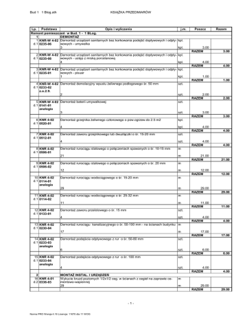 Bud 1 1 Blog.ath KSIĄŻKA PRZEDMIARÓW Lp. Podstawa Opis i wyliczenia j.m. Remont pomieszczeń w Bud. 1 - 1 BLog. 1 DEMONTAŻ 1 KNR-W 4-02 Demontaż urządzeń sanitarnych bez korkowania podejść dopływowych i odpły- kpl. d.1 0235-06 wowych - umywalka 3 kpl. 2 KNR-W 4-02 Demontaż urządzeń sanitarnych bez korkowania podejść dopływowych i odpły- kpl. d.1 0235-08 wowych - ustęp z miską porcelanową 4 kpl. 3 KNR-W 4-02 Demontaż urządzeń sanitarnych bez korkowania podejść dopływowych i odpły- kpl. d.1 0235-01 wowych - pisuar 1 kpl. 4 KNR-W 4-02 Demontaż demolacyjny wpustu żeliwnego podłogowego śr. 50 mm d.1 0233-02 z.o.2.9. 2 szt. 5 KNR-W 4-02 Demontaż baterii umywalkowej d.1 0141-01 analogia 3 szt. 6 KNR 4-02 d.1 0520-01 Demontaż grzejnika żeliwnego członowego o pow.ogrzew.do 2.5 m2 kpl. 4 kpl. 7 KNR 4-02 d.1 0512-01 Demontaż zaworu grzejnikowego lub dwuzłączki o śr. 15-20 mm szt. 4 szt. 8 KNR 4-02 d.1 0506-01 Demontaż rurociągu stalowego o połączeniach spawanych o śr. 10-15 mm m 21 m 9 KNR 4-02 d.1 0506-02 Demontaż rurociągu stalowego o połączeniach spawanych o śr. 20 mm m 12 m 10 KNR 4-02 d.1 0114-01 analogia Demontaż rurociągu wodociągowego o śr. 15-20 mm m 29 m 11 KNR 4-02 d.1 0114-02 Demontaż rurociągu wodociągowego o śr. 25-32 mm m 11 m 12 KNR 4-02 d.1 0133-01 Demontaż zaworu przelotowego o śr. 15 mm szt. 4 szt. 13 KNR 4-02 d.1 0230-04 Demontaż rurociągu kanalizacyjnego o śr. 50-100 mm - na ścianach budynku m 17 m 14 KNR 4-02 d.1 0233-03 analogia Demontaż podejścia odpływowego z rur o śr. 50-80 mm szt. 6 szt. 15 KNR 4-02 d.1 0233-04 analogia Demontaż podejścia odpływowego z rur o śr. 100 mm szt. 4 szt. 2 16 KNR 4-01 d.2 0336-03 MONTAŻ INSTAL. I URZĄDZEŃ Wykucie bruzd poziomych 1/2x1/2 ceg. w ścianach z cegieł na zaprawie cementowo-wapiennej 29 szt. -1Norma PRO Wersja 4.16 Licencja: 11670 dla 11 WOG szt. Poszcz Razem 3.00 RAZEM 3.00 4.00 RAZEM 4.00 1.00 RAZEM 1.00 2.00 RAZEM 2.00 3.00 RAZEM 3.00 4.00 RAZEM 4.00 4.00 RAZEM 4.00 21.00 RAZEM 21.00 12.00 RAZEM 12.00 29.00 RAZEM 29.00 11.00 RAZEM 11.00 4.00 RAZEM 4.00 17.00 RAZEM 17.00 6.00 RAZEM 6.00 4.00 RAZEM 4.00 29.00 RAZEM 29.00 m m Bud 1 1 Blog.ath Lp. Podstawa 17 KNR 4-01 d.2 0339-01 18 KNR 4-01 d.2 0208-03 KSIĄŻKA PRZEDMIARÓW Opis i wyliczenia Wykucie bruzd pionowych 1/4x1/2 ceg. w ścianach z cegieł na zaprawie cementowo-wapiennej 17 j.m. m Przebicie otworów o pow.do 0.05 m2 w elementach z betonu żwirowego o grub.do 30 cm 8 szt. 19 KNR-W 2-15 Rurociągi z tworzyw sztucznych (PP, ) o śr. zewnętrznej 32 mm o połączed.2 0112-03 niach zgrzewanych, na ścianach w budynkach niemieszkalnych 12 m szt. m m 20 KNR-W 2-15 Rurociągi z tworzyw sztucznych (PP) o śr. zewnętrznej 25 mm o połączeniach m d.2 0112-02 zgrzewanych, na ścianach w budynkach niemieszkalnych 42 m 21 KNR-W 2-15 Dodatki za podejścia dopływowe w rurociągach z tworzyw sztucznych do , ba- szt. d.2 0116-08 terii, płuczek o połączeniu elastycznym metalowym o śr. zewnętrznej 20 mm 14 szt. 22 KNR-W 2-15 Dodatki za podejścia dopływowe w rurociągach z tworzyw sztucznych do pisu- szt. d.2 0116-06 arów o połączeniu sztywnym o śr. zewnętrznej 20 mm 4 szt. 23 KNR-W 2-15 Zawory przelotowe i zwrotne instalacji wodociągowych z rur z tworzyw sztucz- szt. d.2 0132-02 nych o śr. nominalnej 20 mm 6 szt. 24 KNR-W 2-15 Zawory przelotowe i zwrotne instalacji wodociągowych z rur z tworzyw sztucz- szt. d.2 0132-03 nych o śr. nominalnej 25 mm 2 szt. 25 KNR-W 2-15 Zawory czerpalne kulowe z końcówką na wąż o śr. nominalnej 15 mm d.2 0135-01 2 szt. 26 KNR-W 2-15 Próba szczelności instalacji wodociągowych z rur z tworzyw sztucznych w bud.2 0127-03 dynkach niemieszkalnych (rurociąg o śr. do 63 mm) 54 m szt. m 27 KNR 0-34 d.2 0101-07 Izolacja rurociągów śr.28-48 mm otulinami Thermaflex FRZ - jednowarstwowy- m mi gr.13 mm (J) 54 m 28 KNR 4-01 d.2 0326-01 Zamurowanie bruzd o szer.1/2 ceg. z przewodami instalacyjnymi w ścianach z m cegieł 46 m 29 KNR 4-01 d.2 0206-02 Zabetonowanie otworów w stropach i ścianach o pow.do 0.1 m2 przy głębok. ponad 10 cm 8 szt. 30 KNR 4-02 d.2 0237-04 Przeczyszczenie podejsc odpływowych o śr. 100 mm szt. 2 szt. 31 KNR 2-15 d.2 0205-04 Montaż rurociągów z PCW o śr. 110 mm na ścianach z łączeniem metodą wciskową 23 m 32 KNR-W 2-15 Czyszczaki z PVC kanalizacyjne o śr. 110 mm o połączeniach wciskowych d.2 0222-02 2 szt. m szt. szt. 33 KNR 2-15 d.2 0205-02 Montaż rurociągów z PCW o śr. 50 mm na ścianach z łączeniem metodą wcis- m kową 21 m 34 KNR 2-15 d.2 0208-03 Dodatek za wykonanie podejść odpływowych z rur i kształtek z nieplastyfikowanego PCW o śr. 50 mm 8 -2Norma PRO Wersja 4.16 Licencja: 11670 dla 11 WOG szt. szt. Poszcz Razem 17.00 RAZEM 17.00 8.00 RAZEM 8.00 12.00 RAZEM 12.00 42.00 RAZEM 42.00 14.00 RAZEM 14.00 4.00 RAZEM 4.00 6.00 RAZEM 6.00 2.00 RAZEM 2.00 2.00 RAZEM 2.00 54.00 RAZEM 54.00 54.00 RAZEM 54.00 46.00 RAZEM 46.00 8.00 RAZEM 8.00 2.00 RAZEM 2.00 23.00 RAZEM 23.00 2.00 RAZEM 2.00 21.00 RAZEM 21.00 8.00 RAZEM 8.00 Bud 1 1 Blog.ath Lp. Podstawa 35 KNR 2-15 d.2 0208-05 KSIĄŻKA PRZEDMIARÓW Opis i wyliczenia Dodatek za wykonanie podejść odpływowych z rur i kształtek z nieplastyfikowanego PCW o śr. 110 mm 4 j.m. szt. szt. 36 KNR-W 2-15 Wpusty ściekowe z tworzywa sztucznego o śr. 50 mm d.2 0218-01 2 szt. 37 KNR 2-15 d.2 0221-02 Montaż umywalek pojedyńczych porcelanowych z syfonem gruszkowym szt. 1 szt. szt. 38 KNR-W 2-15 Postument porcelanowy do umywalek d.2 0230-05 1 kpl. 39 KNR-W 2-15 Baterie umywalkowe jednouchwytowe z dwoma zaworami o śr. nominalnej 15 d.2 0137-03 mm UWAGA: Bateria z podwyższoną wylewką 3 szt. kpl. szt. 40 KNR-W 2-15 Zlewozmywak jednokomorowy z blachy nierdzewnej montowany na ścianie na szt. d.2 0229-05 typowych uchwytach. Zlewozmywak gospodarczy 600x450 analogia 1 szt. 41 KNR 2-15 d.2 0115-01 Baterie zmywakowe ścienne o śr.nom. 15 mm szt. 1 szt. 42 KNR 2-15 d.2 0221-02 analogia Mon