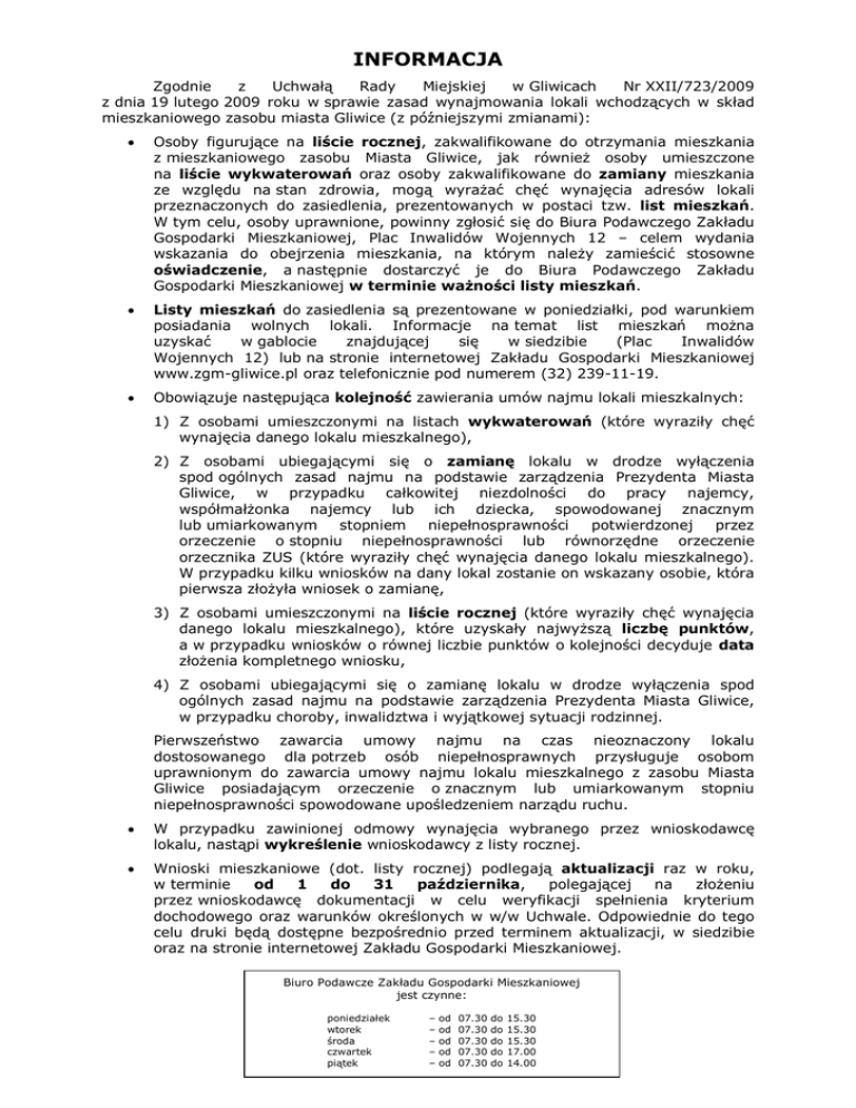 INFORMACJA Zgodnie z Uchwałą Rady Miejskiej w Gliwicach Nr XXII/723/2009 z dnia 19 lutego 2009 roku w sprawie zasad wynajmowania lokali wchodzących w skład mieszkaniowego zasobu miasta Gliwice (z późniejszymi zmianami): Osoby figurujące na liście rocznej, zakwalifikowane do otrzymania mieszkania z mieszkaniowego zasobu Miasta Gliwice, jak również osoby umieszczone na liście wykwaterowań oraz osoby zakwalifikowane do zamiany mieszkania ze względu na stan zdrowia, mogą wyrażać chęć wynajęcia adresów lokali przeznaczonych do zasiedlenia, prezentowanych w postaci tzw. list mieszkań. W tym celu, osoby uprawnione, powinny zgłosić się do Biura Podawczego Zakładu Gospodarki Mieszkaniowej, Plac Inwalidów Wojennych 12 – celem wydania wskazania do obejrzenia mieszkania, na którym należy zamieścić stosowne oświadczenie, a następnie dostarczyć je do Biura Podawczego Zakładu Gospodarki Mieszkaniowej w terminie ważności listy mieszkań. Listy mieszkań do zasiedlenia są prezentowane w poniedziałki, pod warunkiem posiadania wolnych lokali. Informacje na temat list mieszkań można uzyskać w gablocie znajdującej się w siedzibie (Plac Inwalidów Wojennych 12) lub na stronie internetowej Zakładu Gospodarki Mieszkaniowej www.zgm-gliwice.pl oraz telefonicznie pod numerem (32) 239-11-19. Obowiązuje następująca kolejność zawierania umów najmu lokali mieszkalnych: 1) Z osobami umieszczonymi na listach wykwaterowań (które wyraziły chęć wynajęcia danego lokalu mieszkalnego), 2) Z osobami ubiegającymi się o zamianę lokalu w drodze wyłączenia spod ogólnych zasad najmu na podstawie zarządzenia Prezydenta Miasta Gliwice, w przypadku całkowitej niezdolności do pracy najemcy, współmałżonka najemcy lub ich dziecka, spowodowanej znacznym lub umiarkowanym stopniem niepełnosprawności potwierdzonej przez orzeczenie o stopniu niepełnosprawności lub równorzędne orzeczenie orzecznika ZUS (które wyraziły chęć wynajęcia danego lokalu mieszkalnego). W przypadku kilku wniosków na dany lokal zostanie on wskazany osobie, która pierwsza złożyła wniosek o zamianę, 3) Z osobami umieszczonymi na liście rocznej (które wyraziły chęć wynajęcia danego lokalu mieszkalnego), które uzyskały najwyższą liczbę punktów, a w przypadku wniosków o równej liczbie punktów o kolejności decyduje data złożenia kompletnego wniosku, 4) Z osobami ubiegającymi się o zamianę lokalu w drodze wyłączenia spod ogólnych zasad najmu na podstawie zarządzenia Prezydenta Miasta Gliwice, w przypadku choroby, inwalidztwa i wyjątkowej sytuacji rodzinnej. Pierwszeństwo zawarcia umowy najmu na czas nieoznaczony lokalu dostosowanego dla potrzeb osób niepełnosprawnych przysługuje osobom uprawnionym do zawarcia umowy najmu lokalu mieszkalnego z zasobu Miasta Gliwice posiadającym orzeczenie o znacznym lub umiarkowanym stopniu niepełnosprawności spowodowane upośledzeniem narządu ruchu. W przypadku zawinionej odmowy wynajęcia wybranego przez wnioskodawcę lokalu, nastąpi wykreślenie wnioskodawcy z listy rocznej. Wnioski mieszkaniowe (dot. listy rocznej) podlegają aktualizacji raz w roku, w terminie od 1 do 31 października, polegającej na złożeniu przez wnioskodawcę dokumentacji w celu weryfikacji spełnienia kryterium dochodowego oraz warunków określonych w w/w Uchwale. Odpowiednie do tego celu druki będą dostępne bezpośrednio przed terminem aktualizacji, w siedzibie oraz na stronie internetowej Zakładu Gospodarki Mieszkaniowej. Biuro Podawcze Zakładu Gospodarki Mieszkaniowej jest czynne: poniedziałek wtorek środa czwartek piątek – – – – – od od od od od 07.30 07.30 07.30 07.30 07.30 do do do do do 15.30 15.30 15.30 17.00 14.00