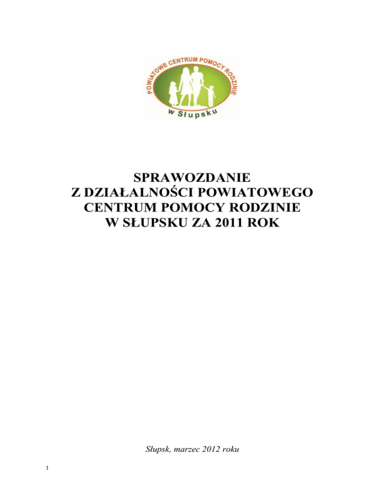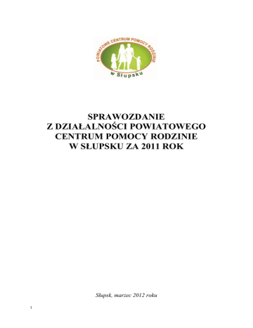 SPRAWOZDANIE Z DZIAŁALNOŚCI POWIATOWEGO CENTRUM POMOCY RODZINIE W SŁUPSKU ZA 2011 ROK Słupsk, marzec 2012 roku 1 Podstawy prawne funkcjonowania jednostki i realizowane zadania Powiatowe Centrum Pomocy Rodzinie w Słupsku zostało powołane uchwałą Nr III/14/98 Rady Powiatu Słupskiego z dnia 29 grudnia 1998 r. i rozpoczęło swoją działalność z dniem 1 stycznia 1999 r. Centrum jest jednostką organizacyjną powiatu słupskiego, prowadzoną w formie jednostki budżetowej powiatu, utworzoną w celu wykonywania zadań powiatu z zakresu pomocy społecznej, podporządkowaną bezpośrednio Zarządowi Powiatu, wchodzącą w skład powiatowej administracji zespolonej. Centrum obejmuje swoim działaniem obszar powiatu słupskiego. Podstawą gospodarki finansowej Centrum jest roczny plan finansowy, sporządzany na rok budżetowy zgodnie z obowiązującą procedurą budżetową. Do zadań z zakresu pomocy społecznej realizowanych przez Powiatowe Centrum Pomocy Rodzinie należy m.in.: 1. opracowanie i realizacja powiatowej strategii rozwiązywania problemów społecznych, ze szczególnym uwzględnieniem programów pomocy społecznej, wspierania osób niepełnosprawnych i innych, których celem jest integracja osób i rodzin z grup szczególnego ryzyka; 2. prowadzenie specjalistycznego poradnictwa; 3. organizowanie opieki w rodzinach zastępczych, udzielanie pomocy pieniężnej na częściowe pokrycie kosztów utrzymania umieszczonych w nich dzieci oraz wypłacanie wynagrodzenia z tytułu pozostawania w gotowości przyjęci dziecka albo świadczonej opieki i wychowania niespokrewnionym z dzieckiem lub częściowo zawodowym rodzinom zastępczym; 4. zapewnienie pozbawionym opieki opieki i wychowania rodziców, w dzieciom całkowicie szczególności przez organizowanie i prowadzenie placówek opiekuńczo-wychowawczych; 5. pokrywanie kosztów utrzymania dzieci z terenu powiatu, umieszczonych w całodobowych placówkach opiekuńczo-wychowawczych i w rodzinach zastępczych na terenie innych powiatów; 6. przyznawanie pomocy pieniężnej na usamodzielnienie oraz na kontynuowanie nauki, a także pomoc w integracji ze środowiskiem osobom opuszczającym całodobowe placówki opiekuńczo-wychowawcze, domy pomocy społecznej dla 2 dzieci i młodzieży niepełnosprawnej intelektualnie, domy dla matek z małoletnimi dziećmi i kobiet w ciąży, rodziny zastępcze oraz schroniska dla nieletnich, zakłady poprawcze, specjalne ośrodki szkolno-wychowawcze, specjalne ośrodki wychowawcze, młodzieżowe ośrodki socjoterapii zapewniające całodobową opiekę lub młodzieżowe ośrodki wychowawcze; 7. nadzór nad działalnością domów pomocy społecznej z terenu powiatu; 8. prowadzenie ośrodka interwencji kryzysowej; 9. udzielanie informacji o prawach i uprawnieniach; 10. szkolenie i doskonalenie zawodowe kadr pomocy społecznej z terenu powiatu; 11. doradztwo metodyczne dla kierowników i pracowników jednostek organizacyjnych pomocy społecznej z terenu powiatu; 12. podejmowanie innych działań wynikających z rozeznanych potrzeb. Do zadań realizowanych przez Powiatowe Centrum Pomocy Rodzinie w Słupsku z zakresu rehabilitacji społecznej określonych w ustawie z dnia 27 sierpnia 1997 r. o rehabilitacji zawodowej i społecznej oraz zatrudnianiu osób niepełnosprawnych należy: 1. opracowywanie i realizacja, zgodnych z powiatową strategią dotyczącą rozwiązywania problemów społecznych, powiatowych programów działań na rzecz osób niepełnosprawnych; 2. współpraca z instytucjami administracji rządowej i samorządowej w opracowywaniu i realizacji ww. programów; 3. podejmowanie działań zmierzających do ograniczania skutków niepełnosprawności; 4. współpraca z organizacjami pozarządowymi i fundacjami działającymi na rzecz osób niepełnosprawnych w zakresie rehabilitacji społecznej i zawodowej; 5. dofinansowanie: a) uczestnictwa osób niepełnosprawnych i ich opiekunów w turnusach rehabilitacyjnych; b) sportu, kultury i turystyki osób niepełnosprawnych; c) zaopatrzenia w sprzęt rehabilitacyjny, przedmioty ortopedyczne i środki pomocnicze przyznawane osobom niepełnosprawnym na podstawie odrębnych przepisów; d) likwidacji barier architektonicznych, w komunikowaniu się i technicznych, w związku z indywidualnymi potrzebami osób niepełnosprawnych. 3 Realizując ww. zadania Powiatowe Centrum Pomocy Rodzinie współdziałało z innymi jednostkami pomocy społecznej, z organami rządowej administracji ogólnej, organami samorządów terytorialnych, sądami właściwymi w sprawach rodzinnych i nieletnich, organizacjami społecznymi i organizacjami pozarządowymi. Struktura organizacyjna i obsada kadrowa PCPR Struktura organizacyjna Powiatowego Centrum Pomocy Rodzinie w Słupsku, zakres działania poszczególnych komórek organizacyjnych Centrum w roku 2011 regulował Statut Powiatowego Centrum Pomocy Rodzinie w Słupsku uchwalony przez Radę Powiatu Słupskiego Uchwałą Nr XXIV/175/2008 z dnia 28 października 2008 r. oraz Regulamin Organizacyjny Powiatowego Centrum Pomocy Rodzinie uchwalony Uchwałą Zarządu Powiatu Słupskiego Nr 222/2008 z dnia 9 października 2008 r. Na mocy ww. dokumentów w skład Centrum wchodziły następujące komórki organizacyjne i samodzielne stanowiska pracy: Zespół ds. Pomocy Instytucjonalnej, Zespół ds. Rozwiązywania Problemów Wybranych Grup Społecznych, Zespół Finansowo – Księgowy, Zespół ds. Rehabilitacji Osób Niepełnosprawnych, Sekcja Organizacyjno – Administracyjna, Radca Prawny. Na dzień 31 grudnia 2011 w jednostce zatrudnionych było 14 pracowników w tym: 3 na stanowiskach kierowniczych urzędniczych, 3 na stanowiskach urzędniczych i 8 na stanowiskach pomocniczych i obsługi. Było 6 stanowisk merytorycznych realizujących zadania jednostki pomocy społecznej (pracownicy socjalni). Pracownicy Powiatowego Centrum Pomocy Rodzinie w Słupsku posiadają kwalifikacje wymagane obowiązującymi w tym zakresie przepisami pra