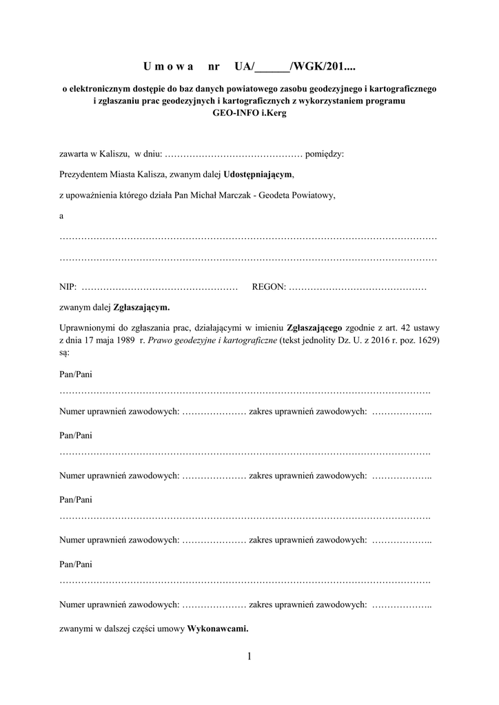 Umowa nr UA/______/WGK/201.... o elektronicznym dostępie do baz danych powiatowego zasobu geodezyjnego i kartograficznego i zgłaszaniu prac geodezyjnych i kartograficznych z wykorzystaniem programu GEO-INFO i.Kerg zawarta w Kaliszu, w dniu: ……………………………………… pomiędzy: Prezydentem Miasta Kalisza, zwanym dalej Udostępniającym, z upoważnienia którego działa Pan Michał Marczak - Geodeta Powiatowy, a …………………………………………………………………………………………………………… …………………………………………………………………………………………………………… NIP: …………………………………………… REGON: ……………………………………… zwanym dalej Zgłaszającym. Uprawnionymi do zgłaszania prac, działającymi w imieniu Zgłaszającego zgodnie z art. 42 ustawy z dnia 17 maja 1989 r. Prawo geodezyjne i kartograficzne (tekst jednolity Dz. U. z 2016 r. poz. 1629) są: Pan/Pani …………………………………………………………………………………………………………. Numer uprawnień zawodowych: ………………… zakres uprawnień zawodowych: ……………….. Pan/Pani …………………………………………………………………………………………………………. Numer uprawnień zawodowych: ………………… zakres uprawnień zawodowych: ……………….. Pan/Pani …………………………………………………………………………………………………………. Numer uprawnień zawodowych: ………………… zakres uprawnień zawodowych: ……………….. Pan/Pani …………………………………………………………………………………………………………. Numer uprawnień zawodowych: ………………… zakres uprawnień zawodowych: ……………….. zwanymi w dalszej części umowy Wykonawcami. 1 Strony zawarły umowę o następującej treści: §1 Przedmiotem niniejszej umowy jest umożliwienie zgodnie z art. 12 ustawy Prawo Geodezyjne i Kartograficzne zgłaszania prac geodezyjnych i kartograficznych oraz udostępniania Wykonawcy, działającemu na rzecz Zgłaszającego, danych z powiatowego zasobu geodezyjnego i kartograficznego w mieście Kaliszu, niezbędnych do wykonania prac zgłoszonych, drogą elektroniczną za pośrednictwem modułu GEO-INFO i.Kerg. §2 Wykonawca, działający na rzecz Zgłaszającego, oświadcza, że zobowiązuje się wykorzystywać dostęp do serwisu wyłącznie na użytek wykonywanych przez siebie i na rzecz Zgłaszającego prac geodezyjnych, zgodnie z ustawą Prawo geodezyjne i kartograficzne. Zakres uprawnień do wykorzystania udostępnianych materiałów określony jest w licencji, o której mowa w art. 40c ustawy Prawo geodezyjne i kartograficzne. Zgłaszający przyjmuje do wiadomości, że wszelka jego aktywność jest rejestrowana i archiwizowana przez system. §3 1. Wykonawcy, działającemu na rzecz Zgłaszającego, zostanie przydzielony login i hasło aktywowane przez administratora systemu. Wykonawca ma możliwość zmiany hasła. Udostępnienie hasła innym osobom jest zabronione, trzykrotne wprowadzenie błędnego hasła powoduje blokadę dostępu do systemu. 2. Udostępniający dołoży należytej staranności w celu zapewnienia Wykonawcy, działającemu na rzecz Zgłaszającego, stałego dostępu do systemu. 3. Korzystanie z systemu GEO-INFO i.Kerg jest bezpłatne. 4. Udostępniający nie gwarantuje kompletności materiałów dostępnych on-line. Celem uzupełnienia brakującej dokumentacji niezbędny jest bezpośredni kontakt z pracownikiem PODGiK w Wydziale Geodezji i Kartografii w Urzędzie Miejskim w Kaliszu, obsługującym państwowy zasób geodezyjny i kartograficzny (ul. Główny Rynek 20 (ratusz) - p. 56, tel.: 62-7654362, fax 62-7654307, e-mail: [email protected] lub [email protected]). §4 Wypełnienie i zatwierdzenie formularza zgłoszenia pracy geodezyjnej w systemie przez Wykonawcę działającego na rzecz Zgłaszającego, jest równoznaczne ze zgłoszeniem jej w Powiatowym Ośrodku Dokumentacji Geodezyjnej i Kartograficznej w Kaliszu i pociąga za sobą zobowiązania finansowe Zgłaszającego w stosunku do Miasta Kalisza, wynikające z art.40a ust.1 ustawy Prawo geodezyjne i kartograficzne zwane opłatami. Udostępnienie materiałów zasobu następuje po dokonaniu opłaty: - w systemie płatności elektronicznej PAY BY NET lub - przelewem, a następnie przesłaniu potwierdzenia zapłaty do PODGiK, celem odblokowania danych przez pracownika PODGiK. §5 1. Udostępniający nie ponosi odpowiedzialności za przerwy w działaniu usługi, spowodowane przyczynami nieleżącymi po jego stronie np. przerwy w dostawie energii elektrycznej, nieprawidłowe działanie sieci internetowej, zamierzone przerwy w działaniu systemu. 2. Poprzez zamierzone przerwy w działaniu systemu rozumie się wszelkie działania mające na celu modernizację lub usunięcie wad i usterek w pracy systemu oraz jego aktualizację i konserwację. §6 1. Umowa zostaje zawarta na czas nieokreślony, z możliwością jej rozwiązania: 1) za uprzednim miesięcznym okresem wypowiedzenia, 2) w każdym czasie za porozumieniem stron. 2 2. Udostępniający ma prawo rozwiązać umowę w trybie natychmiastowym w przypadku naruszenia przez Wykonawcę lub Zgłaszającego postanowień niniejszej umowy lub odmowy opłat wynikających z aktywności Wykonawcy bądź Zgłaszającego w systemie. 3. Umowa traci moc z dniem: 1) zakończenia prowadzenia przez Zgłaszającego działalności gospodarczej w dziedzinie geodezji i kartografii 2) wycofania się Urzędu Miejskiego w Kaliszu z użytkowania systemu GEO-INFO i.Kerg. §7 Zgłaszający powiadomi Udostępniającego o wszelkich zmianach dotyczących Zgłaszającego lub Wykonawcy, działającego w jego imieniu, mających związek z trybem zgłaszania prac geo