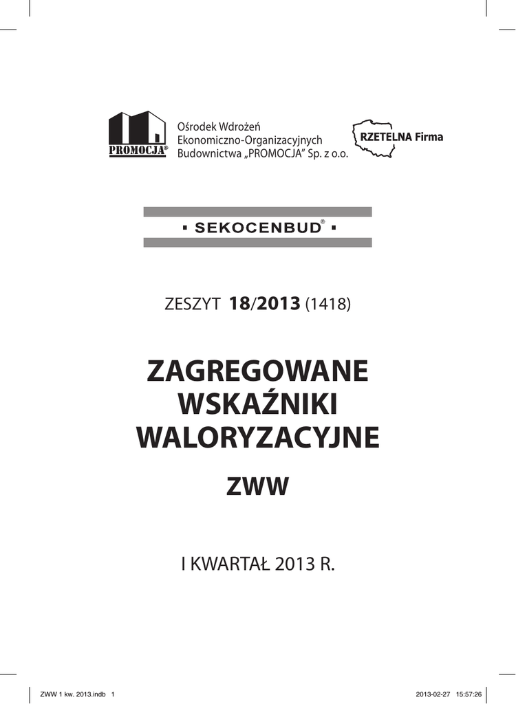Ośrodek Wdrożeń Ekonomiczno-Organizacyjnych Budownictwa „PROMOCJA” Sp. z o.o. ZESZYT 18/2013 (1418) ZAGREGOWANE WSKAŹNIKI WALORYZACYJNE ZWW I KWARTAŁ 2013 R. ZWW 1 kw. 2013.indb 1 2013-02-27 15:57:26 SPIS TREŚCI Wprowadzenie ............................................................................................................................................... 7 Rozdział I. Prognozy zmian cen w budownictwie 1. Wprowadzenie ..................................................................................................................................... 17 2. Założenia metodologiczne .................................................................................................................. 17 3. Sposób prezentacji prognoz ................................................................................................................ 17 4. Merytoryczny zakres prognoz .............................................................................................................. 18 5. Prognozy zmian cen czynników produkcji budowlanej ........................................................................ 19 5.1. Prognoza zmian stawek robocizny kosztorysowej netto .......................................................... 19 5.2. Prognoza zmian stawek robocizny kosztorysowej brutto ......................................................... 20 5.3. Prognoza zmian cen materiałów budowlanych ....................................................................... 21 5.4. Prognoza zmian cen materiałów instalacyjnych ...................................................................... 22 5.5. Prognoza zmian cen materiałów elektrycznych ...................................................................... 23 5.6. Prognoza zmian cen materiałów zużywanych w budownictwie ogółem ................................. 24 5.7. Prognoza zmian cen pracy sprzętu budowlanego .................................................................... 25 6. Prognozy zmian cen dla grup obiektów ................................................................................................ 26 6.1. Prognoza zmian cen obiektów budownictwa mieszkaniowego wielorodzinnego.................... 26 6.2. Prognoza zmian cen obiektów budownictwa mieszkaniowego jednorodzinnego ................... 27 6.3. Prognoza zmian cen obiektów użyteczności publicznej ........................................................... 28 6.4. Prognoza zmian cen obiektów produkcyjnych, usługowych i magazynowych ......................... 29 6.5. Prognoza zmian cen dróg kołowych......................................................................................... 30 6.6. Prognoza zmian cen mostów i wiaduktów............................................................................... 31 6.7. Prognoza zmian cen przyłączy i sieci gazowych ....................................................................... 32 6.8. Prognoza zmian cen przyłączy i sieci ciepłowniczych ............................................................... 33 6.9. Prognoza zmian cen przyłączy i sieci wodociągowych ............................................................. 34 6.10. Prognoza zmian cen przyłączy i sieci kanalizacyjnych.............................................................. 35 6.11. Prognoza zmian cen linii energetycznych ................................................................................ 36 Rozdział II. Informacja o zmianach cen czynników produkcji budowlanej Tablica 1 Zmiany stawek robocizny kosztorysowej ................................................................................37 Tablica 2 Zmiany cen materiałów budowlanych wg grup ......................................................................38 Tablica 3 Zmiany cen materiałów instalacyjnych wg grup.....................................................................39 Tablica 4 Zmiany cen materiałów elektrycznych wg grup .....................................................................40 Tablica 5 Zmiany cen materiałów zużywanych w budownictwie ogółem i wg rodzajów.......................41 Tablica 6 Zmiany cen najmu i pracy sprzętu budowlanego wg grup .....................................................42 ZWW 1/2013 ZWW 1 kw. 2013.indb 3 3 2013-02-27 15:57:27 SPIS TREŚCI Rozdział III. Informacja o zmianach cen obiektów Tablica 7 obiekt 1110 (1122-201) Budynek mieszkalno-usługowy wielorodzinny ...........................44 Tablica 8 obiekt 1112 (1122-204) Budynek mieszkalny wielorodzinny (o oszczędnościowej technologii ścian osłonowych) IV-kondygnacyjny .......................46 Tablica 9 obiekt 1120 (1122-202) Budynek mieszkalny wielorodzinny IV-kondygnacyjny ...............48 Tablica 10 obiekt 1121 (1122-301) Budynek mieszkalny wielorodzinny V-kondygnacyjny ................50 Tablica 11 obiekt 1131 (1122-401) Budynek mieszkalny wielorodzinny XI-kondygnacyjny ...............52 Tablica 12 obiekt 1145 D (1122-406) Apartamentowiec mieszkalno-biurowo-usługowy XV-kondygnacyjny wersja w stanie deweloperskim ....................54 Tablica 13 obiekt 1151 (1110-301) Segment jednorodzinny budynku mieszkalnego szeregowego (skrajny) ................................................................56 Tablica 14 obiekt 1152 (1110-302) Segment jednorodzinny budynku mieszkalnego szeregowego (środkowy) ............................................................58 Tablica 15 obiekt 1153 (1110-101) Dom jednorodzinny wolno stojący dostosowany do potrzeb niepełnosprawnego ....................................................................60 Tablica 16 obiekt 1154 (1110-102) Dom jednorodzinny wolno stojący częściowo podpiwniczony .....62 Tablica 17 obiekt 1155 (1110-103) Dom jednorodzinny wolno stojący bez podpiwniczenia ..............64 Tablica 18 obiekt 1156 (1110-106) Dom jednorodzinny wolno stojący bez podpiwniczenia z pustaków trocinobetonowych ..................................................