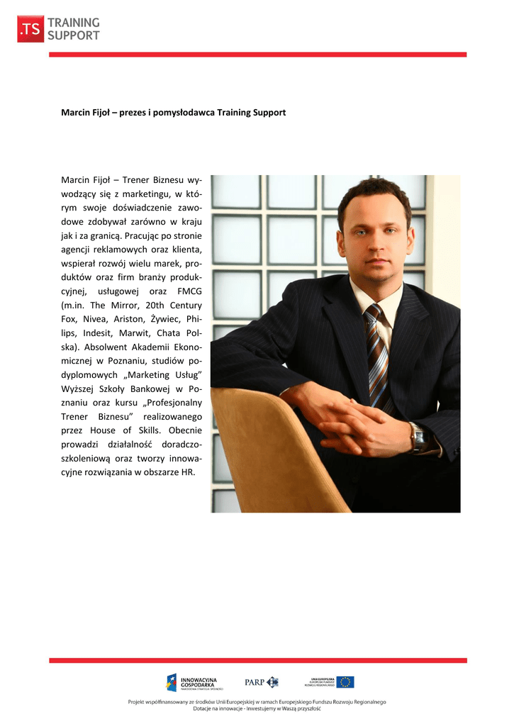 Marcin Fijoł – prezes i pomysłodawca Training Support Marcin Fijoł – Trener Biznesu wywodzący się z marketingu, w którym swoje doświadczenie zawodowe zdobywał zarówno w kraju jak i za granicą. Pracując po stronie agencji reklamowych oraz klienta, wspierał rozwój wielu marek, produktów oraz firm branży produkcyjnej, usługowej oraz FMCG (m.in. The Mirror, 20th Century Fox, Nivea, Ariston, Żywiec, Philips, Indesit, Marwit, Chata Polska). Absolwent Akademii Ekonomicznej w Poznaniu, studiów podyplomowych „Marketing Usług” Wyższej Szkoły Bankowej w Poznaniu oraz kursu „Profesjonalny Trener Biznesu” realizowanego przez House of Skills. Obecnie prowadzi działalność doradczoszkoleniową oraz tworzy innowacyjne rozwiązania w obszarze HR.