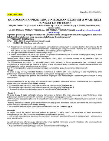 Pruszków 09. 03.2008 r. MZO/08/2009 OGŁOSZENIE O PRZETARGU NIEOGRANICZONYM O WARTOŚCI PONIŻEJ 133 000 EURO Miejski Zakład Oczyszczania w Pruszkowie, Sp. z o.o., ul. Stefana Bryły 6, 05-800 Pruszków, woj. mazowieckie, tel. 022 7582063, 7582067. 7586608, fax 022 7582063, 7582067, 7586608, e-mail: [email protected], www.mzo.pl. ogłasza przetarg nieograniczony na „Świadczenie usług telekomunikacyjnych w zakresie telefonii komórkowej oraz dostawę telefonów komórkowych” 1. PRZEDMIOT ZAMÓWIENIA CPV: 64.21.20.00-5 usługi telefonii komórkowej 32.25.00.00-0 telefony komórkowe 1.1. Przedmiotem zamówienia jest świadczenie usług telekomunikacyjnych w zakresie telefonii komórkowej dla 90 numerów abonenckich, dostawa 90 telefonów komórkowych z wyposażeniem i kartami SIM oraz dostawa 55 kart GPS o zakresie od 850 do 1900 MHZ wraz obsługą technologii GPRS 1.2. Usługa świadczona będzie na terenie całego kraju 1.3. Oferta Wykonawcy nie może być gorsza (na gorszych warunkach) niż aktualnie obowiązujące oferty w sieci Wykonawcy na dla firm i klientów biznesowych Stwierdzenie takiego faktu spowoduje odrzucenie oferty gdyż podpisanie umowy na jej zasadach było by niekorzystne dla Zamawiającego. 2.4. Zamawiający przyjmuje, że wszystkie opłaty stałe, zarówno z tytułu abonamentu, jak i aktywacji usługi wymienione w specyfikacji są zawarte w jednej równej dla danej grupy, miesięcznej opłacie abonamentowej nie podlegającej w trakcie trwania umowy wzrostowi. 2.5. W ramach przedmiotu zamówienia Zamawiający wyróżnia trzy grupy abonamentów telefonicznych: Grupa I W skład Grupy I będą wchodziły telefony komórkowe z kartami SIM i ich aktywacją w sieci Wykonawcy oraz jednakowym abonamentem dla 55 numerów spełniającym następujące warunki: - 25 minut na połączenia głosowe do wszystkich krajowych sieci komórkowych i stacjonarnych wliczonych w cenę abonamentu. Aparaty telefoniczne dla tej grupy abonamentów muszą spełnić minimalne warunki określone dla poszczególnych typów telefonów określonych w Tabeli poniżej: - 55 aparatów telefonicznych spełniających warunki określone dla Telefonu typ I - 31 aparatów telefonicznych spełniających warunki określone dla Telefonu typ II - 4 aparaty telefoniczne spełniające warunki określone dla Telefonu typ III. Grupa II W skład Grupy II będą wchodziły telefony komórkowe z kartami SIM i ich aktywacją w sieci Wykonawcy oraz jednakowym abonamentem dla 31 numerów spełniającym następujące warunki: - 200 minut na połączenia głosowe do wszystkich krajowych sieci komórkowych i stacjonarnych wliczonych w cenę abonamentu. Aparaty telefoniczne dla tej grupy abonamentów muszą spełnić minimalne warunki określone dla poszczególnych typów telefonów określonych w Tabeli poniżej: - 31 aparatów telefonicznych spełniające warunki określone dla Telefonu typ II. Grupa III W skład Grupy III będzie wchodził telefon komórkowy z kartą SIM i jej aktywacją w sieci Wykonawcy oraz abonamentem dla 4 numerów spełniającym następujące warunki: - 400 minut na połączenia głosowe do wszystkich krajowych sieci komórkowych i stacjonarnych wliczonych w cenę abonamentu. Aparat telefoniczny dla tej grupy abonamentów musi spełnić minimalne warunki określone dla poszczególnych typów telefonów określonych w Tabeli poniżej: - 4 aparaty telefoniczne spełniające warunki określone dla Telefonu typ III. 2.6. Dla wszystkich 90 abonamentów Wykonawca zapewni: - jedną i jednolitą (dla wszystkich numerów) stawkę za połączenia głosowe do wszystkich krajowych sieci komórkowych i stacjonarnych bez względu na porę dnia, - równą stawkę za wysłanie SMS-a do wszystkich krajowych sieci komórkowych, - równą stawkę za wysłanie MMS-a do wszystkich krajowych sieci komórkowych, - połączenia międzynarodowe taryfikowane zgodnie z obowiązującymi cenami w oferowanej Taryfie Wykonawcy. 2.7. Dla wszystkich 90 numerów wchodzących w skład Grupy I, II, III Wykonawca utworzy tzw. Biznes Grupę wewnątrz której połączenia (pomiędzy tymi numerami) będą przynajmniej czterokrotnie tańsze niż zwykłe połączenia głosowe (z numerami spoza tej grupy). Powyższe połączenia nie będą wliczane w pakiet bezpłatnych minut abonamentowych. Koszt minuty takiego połączenia jak i ewentualna miesięczna opłata za tą usługę jednakowa dla wszystkich 100 numerów. 2.8. W ramach miesięcznej opłaty abonamentowej dla każdego numeru Zamawiający wymaga: - brak opłaty za rozpoczęcie połączenia, - naliczania sekundowego od początku połączenia (1s/1s), - bezpłatnej poczty głosowej ( bezpłatne korzystanie i odsłuchiwanie), - aktywnych usług takich jak: oczekiwanie na połączenie, blokowanie połączeń, zawieszenie połączenia, identyfikację numeru dzwoniącego CLIP, blokadę prezentacji własnego numeru CLIR, SMS powiadamiający o próbie połączenia, połączenia z numerami alarmowymi, - aktywnej usługi transmisji danych GPRS, CSD i wiadomości MMS, - kumulacji niewykorzystanych w ramach abonamentu bezpłatnych minut przez cały okres trwania umowy; niewykorzystane minuty winne bezterminowo przechodzić na następne okresy, - usługi roamingu dla wszystkich aktywnych numerów. 2.9. Wykonawca w ramach świadczonej usługi ponadto zapewni: - bezpłatne drukowanie duplikatów faktur VAT na życzenie Zamawiającego, - bezpłatne wystawianie rachunków szczegółowych, - bezpłatnie udostępniony program do zarządzania interaktywnego wszystkimi numerami znajdującymi się na koncie wraz z usługą e-biling (biling w formie elektronicznej), - bezpłatną modyfikację danych w systemach związanych ze zmianą danych adresowych, - bezpłatne wystawianie duplikatów karty SIM, - bezpłatną zmianę numeru karty SIM w trakcie trwania umowy, - bezpłatną zmianę abonenta (cesja numeru), - bezpłatną możliwość kontroli bieżących kosztów przez użytkowników Abonenta zarówno 