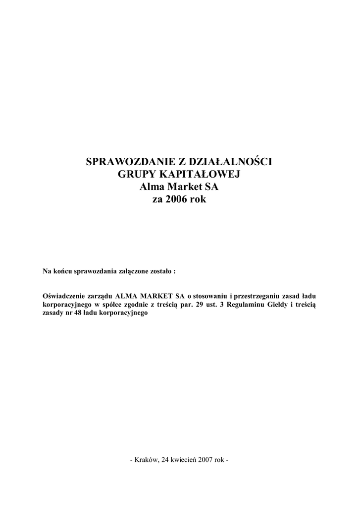 SPRAWOZDANIE Z DZIA ALNO CI GRUPY KAPITA OWEJ Alma Market SA za 2006 rok Na ko cu sprawozdania za czone zosta o : wiadczenie zarz du ALMA MARKET SA o stosowaniu i przestrzeganiu zasad adu korporacyjnego w spó ce zgodnie z tre ci par. 29 ust. 3 Regulaminu Gie dy i tre ci zasady nr 48 adu korporacyjnego - Kraków, 24 kwiecie 2007 rok - Sprawozdanie z dzia alno ci Grupy Kapita owej ALMA MARKET SA za 2006 rok SPIS TRE CI 1. ZASADY PRZYJ TE PRZY SPORZ DZANIU SKONSOLIDOWANEGO RAPORTU ROCZNEGO Z DZIA ALNO CI _________________________________________________________________________ 3 2. ZASADY SPORZ DZANIA ROCZNEGO SKONSOLIDOWANEGO SPRAWOZDANIA FINANSOWEGO I SPRAWOZDANIA Z DZIA ALNO CI GRUPY KAPITA OWEJ ________________________________ 3 3. PODSTAWOWE DANE O SPÓ KACH GRUPY KAPITA OWEJ _______________________________ 4 4. PREZENTACJA WYBRANYCH SKONSOLIDOWANYCH DANYCH FINANSOWYCH Z DZIA ALNO CI KONTYNUOWANEJ GRUPY KAPITA OWEJ Z OKRESU OSTATNICH 5 LAT____ 6 5. OMÓWIENIE PODSTAWOWYCH WIELKO CI EKONOMICZNO-FINANSOWYCH, UJAWNIONYCH W ROCZNYM SKONSOLIDOWANYM SPRAWOZDANIU FINANSOWYM_________________________ 7 6. OPIS ISTOTNYCH CZYNNIKÓW RYZYK I ZAGRO 7. DZIA ALNO ______________________________________ 9 GRUPY KAPITA OWEJ ALMA MARKET SA _______________________________ 14 8. UMOWY ZNACZ CE DLA DZIA ALNO CI GRUPY ORAZ INNE ZNACZ CE ZDARZENIA _____ 16 9. POWI ZANIA ORGANIZACYJNE I KAPITA OWE SPÓ EK GRUPY _________________________ 21 10. KREDYTY, PO YCZKI ORAZ POR CZENIA I GWARANCJE _______________________________ 22 11. INFORMACJE O WP YWACH Z EMISJI I ICH WYKORZYSTANIU, PROGNOZACH WYNIKÓW I ICH REALIZACJI, ZARZ DZANIU ZASOBAMI FINANSOWYMI ORAZ PERSPEKTYWACH ROZWOJU ______________________________________________________________________________________ 26 12. PRZYJ TE ZASADY ZARZ DZANIA, ORGANIZACJA GRUPY, AKCJONARIUSZE ORAZ POZOSTA E SPRAWY___________________________________________________________________ 30 -2- Sprawozdanie z dzia alno ci Grupy Kapita owej ALMA MARKET SA za 2006 rok 1. ZASADY PRZYJ TE PRZY SPORZ DZANIU SKONSOLIDOWANEGO RAPORTU ROCZNEGO Z DZIA ALNO CI Skonsolidowany raport roczny jest sporz dzany i publikowany w oparciu o przepisy Rozporz dzenia Ministra Finansów z dnia 19 pa dziernika 2005 roku w sprawie informacji bie cych i okresowych przekazywanych przez emitentów papierów warto ciowych (Dz.U. nr 209 poz. 1744). Na ca skonsolidowanego raportu rocznego sk adaj si : 1. Pismo prezesa zarz du. 2. Wybrane dane finansowe. 3. Roczne skonsolidowane sprawozdanie finansowe. 4. Roczne skonsolidowane sprawozdanie z dzia alno ci spó ki. 5. O wiadczenia zarz du podpisane przez wszystkich cz onków zarz du spó ki dotycz ce : - sporz dzonego rocznego skonsolidowanego sprawozdania finansowego i sprawozdania z dzia alno ci grupy kapita owej, - podmiotu uprawnionego do badania sprawozda finansowych oraz bieg ych rewidentów. 6. Opinia i raport podmiotu uprawnionego do badania sprawozda finansowych z badania rocznego skonsolidowanego sprawozdania finansowego. 2. ZASADY SPORZ DZANIA ROCZNEGO SKONSOLIDOWANEGO SPRAWOZDANIA FINANSOWEGO I SPRAWOZDANIA Z DZIA ALNO CI GRUPY KAPITA OWEJ 2.1. Zasady sporz dzania rocznego skonsolidowanego sprawozdania finansowego Pocz wszy od skonsolidowanych sprawozda finansowych za okresy sprawozdawcze rozpoczynaj ce si w 2005 r. grupa kapita owa ALMA MARKET SA sporz dza skonsolidowane sprawozdania finansowe zgodnie z Mi dzynarodowymi Standardami Sprawozdawczo ci Finansowej (MSSF) na podstawie Rozporz dzenia nr 1606/2002 Parlamentu Europejskiego i Rady z dnia 19 lipca 2002 r. w sprawie stosowania mi dzynarodowych standardów rachunkowo ci. W zwi zku z tym, e WZA ALMA MARKET SA, która jest spó dominuj grupy podj o uchwa o sporz dzaniu skonsolidowanych sprawozda finansowych przez jednostki wchodz ce w sk ad Grupy Kapita owej ALMA MARKET SA zgodnie z Mi dzynarodowymi Standardami Rachunkowo ci, spó ki grupy kapita owej w tym spó ka dominuj ca grupy, na podstawie ustawy z dnia 29 wrze nia 1994 r. o rachunkowo ci podj y równie decyzje o sporz dzaniu swoich sprawozda finansowych zgodnie z Mi dzynarodowymi Standardami Rachunkowo ci, pocz wszy od sprawozda finansowych za okresy sprawozdawcze rozpoczynaj ce si w 2005 r. Roczne skonsolidowane sprawozdanie finansowe zawiera: - skonsolidowany bilans, - skonsolidowany rachunek zysków i strat, - skonsolidowane zestawienie zmian w kapitale w asnym, - skonsolidowany rachunek przep ywów pieni nych, - noty obja niaj ce do rocznego skonsolidowanego sprawozdania finansowego, Zakres ujawnionych danych oraz porównywalnych danych finansowych w rocznym skonsolidowanym sprawozdaniu nansowym jest zgodny z Mi dzynarodowymi Standardami Sprawozdawczo ci Finansowej (MSSF). Roczne skonsolidowane sprawozdanie nansowe jest przedstawiane w polskich z otych, w zwi zku z tym, e oty polski jest podstawow walut , w której denominowane s transakcje (operacje gospodarcze) spó ki dominuj cej. Za sporz dzenie rocznego skonsolidowanego sprawozdania finansowego, odpowiedzialny jest zarz d spó ki dominuj cej. Skonsolidowane sprawozdania sporz dza si na dzie bilansowy ko cz cy si 31 grudnia danego roku. -3- Sprawozdanie z dzia alno ci Grupy Kapita owej ALMA MARKET SA za 2006 rok Zasady przyj te przy sporz dzaniu rocznego skonsolidowanego sprawozdania finansowego za 2006 rok zosta y opisane w notach obja niaj cych do tego sprawozdania. Roczne skonsolidowane sprawozdanie finansowe podlega badaniu przez bieg ego rewidenta, celem wyra enia przez niego pisemnej opinii oraz sporz dzenia raportu o tym, czy skonsolidowane sprawozdanie finansowe jest prawid owe oraz rzetelnie i jasno przedstawia sytuacj maj tkow i finansow grupy, jak te wynik finansowy. Rada Nadzorcza spó ki dominuj cej jest uprawnionym organem do wyboru bieg ego rewidenta do przeprowadzenia badania rocznego skonsolidowanego sprawozdania finansowego Alma Market SA. Skonsolidowane sprawozdanie finansowe podlega zatwierdzeniu przez Walne Zgromadzenie Akcjonariuszy spó ki dominuj cej, nie pó niej