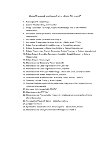 Wykaz Organizacji znajdujących się w „Mapie Aktywności” 1. Fundacja AMF Nasza Droga 2. Ludowy Klub Sportowy „Ostrowianka” 3. Okręg Mazowiecki Polskiego Związku Wędkarskiego koło nr 64 w Ostrowi Mazowieckiej 4. Ostrowskie Stowarzyszenie na Rzecz Bezpieczeństwa Miasta i Powiatu w Ostrowi Mazowieckiej 5. Ostrowskie Stowarzyszenie Razem-Więcej 6. Ostrowskie Towarzystwo Inicjatyw Kulturalno Oświatowych OTIKO 7. Polski Czerwony Krzyż Oddział Rejonowy w Ostrowi Mazowieckiej 8. Polskie Stowarzyszenie Diabetyków Oddział w Ostrowi Mazowieckiej 9. Polskie Towarzystwo Oświaty Zdrowotnej Oddział Terenowy w Ostrowi Mazowieckiej 10. Polski Związek Emerytów, Rencistów i Inwalidów Oddział Rejonowy w Ostrowi Mazowieckiej 11. Polski Związek Niewidomych 12. Stowarzyszenie Bezpieczny Powiat Ostrowski 13. Stowarzyszenie Osób Niepełnosprawnych „Iskierka” 14. Stowarzyszenie Osób Niepełnosprawnych „Przystań” 15. Stowarzyszenie Promujące Abstynencję i Zdrowy Styl Życia „Zacznij Od Nowa” 16. Stowarzyszenie Rodzin Abstynenckich „Rodzina” 17. Stowarzyszenie Rodziców Dzieci Specjalnej Troski „Podaruj Uśmiech” 18. Światowy Związek Żołnierzy Armii Krajowej 19. Związek Kombatantów RP i Byłych Więźniów Politycznych Koło Miejsko-Gminne w Ostrowi Mazowieckiej 20. Ostrowski Klub Koszykówki „SOKÓŁ” 21. Klub Abstynenta „TANTAL” 22. Stowarzyszenie Przewoźników Krajowych i Międzynarodowych oraz Spedytorów Ziemi Ostrowskiej 23. Towarzystwo Przyjaciół Dzieci – oddział powiatowy 24. Związek Sybiraków 25. Spółdzielnia Socjalna Centrum Terapeutyczno – Opiekuńcze „Amelia” 26. Stowarzyszenie Emerytów i Rencistów Policyjnych, koło Nr 5. 1. Fundacja AMF Nasza Droga Pełna nazwa organizacji NR KRS 000015928 Organizacja posiada Status Organizacji Pożytku Publicznego Dane teleadresowe Ul. Biała 1 07-300 Ostrów Mazowiecka Tel 29 644 21 16 Fax 29 644 21 10 [email protected] WWW.amf.org.pl Osoby Barbara Bilwin-prezes reprezentujące organizację Główne obszary Przezwyciężanie trudnych sytuacji życiowych, działalność wspierająca działania (cele) - Pomoc społeczna, w tym pomoc rodzinom i osobom w trudnej sytuacji życiowej oraz wyrównywanie ich szans - Działalność na rzecz osób niepełnosprawnych Ochrona zdrowia - Ochrona i promocja zdrowia Nauka, kultura, ekologia - Nauka, szkolnictwo wyższe, edukacja, oświata i wychowanie Sport, turystyka, wypoczynek - Wspieranie i upowszechnianie kultury fizycznej i sportu - Turystyka i krajoznawstwo - Wypoczynek dzieci i młodzieży Dotychczasowe Swoje cele Fundacja realizuje poprzez działania w ramach trzech programów: Osiągnięcia i Program stypendialny "Daję, abyś i Ty dawał" Doświadczenia Program Wakacyjny "Lato czeka" Program Pomocy "Tu i teraz" Prowadzone działania Program Stypendialny - obejmuje swoim zakresem młodzież ze szkół średnich rekrutowaną spośród absolwentów gimnazjów. Brana pod uwagę jest nie tylko sytuacja materialna, ale również wyniki w nauce oraz zainteresowania kandydatów. Oprócz pomocy materialnej najważniejsze jest długofalowe umacnianie osobowości poprzez: systematyczne comiesięczne spotkania z młodzieżą, praca rozpoznawcza wychowawców, poznawanie środowiska domowego, częste kontakty ze szkołami, rozmowy z nauczycielami i stypendystami, pomoc zdrowotna, opieka lekarska i stomatologiczna, warsztaty z psychologiem, cykle spotkań z wybitnymi ludźmi nauki, kultury i sztuki, udział w ważnych wydarzeniach kulturalnych, poznawanie historii i kultury najbliższego regionu, zwiedzanie ojczystego kraju oraz w miarę możliwości krajów sąsiednich, zachęcanie młodzieży do działania na rzecz innych i najbliższego otoczenia. Program Wakacyjny "Lato czeka" - realizowany jest z myślą o dzieciach pochodzących z rodzin dotkniętych problemami zdowotnymi, finansowymi lub społecznymi. Do tej pory na kolonie organizowane przez Fundację wyjechało ponad 1500 dzieci. Program Pomocy "Tu i teraz" - obejmuje wiele różnych działań. Niektóre mają charakter systematyczny, jak np. dożywianie dzieci w szkołach czy współpraca z ośrodkami zajmującymi się dziećmi niepełnosprawnymi. Niektóre działania dotyczą sytuacji, których nie można przewidzieć. Pomagamy w miarę możliwości, w przypadkach indywidualnych, jak również staramy się wspierać szkoły, organizować spektakle i koncerty oraz rozwijać plastyczne zainteresowania młodych ludzi. 2. Ludowy Klub Sportowy „Ostrowianka” Pełna nazwa organizacji NR KRS 0000264728 Organizacja posiada Status Organizacji Pożytku Publicznego Dane teleadresowe Ul. Warchalskiego 3 07-300 Ostrów Mazowiecka Tel. 696 165 357 e-mail: [email protected] Osoby Bartłomiej Pieńkowski - Prezes reprezentujące Remigiusz Wasil – V-ce prezes organizację Jerzy Bauer – V-ce prezes Zygmunt Wojtaś - Sekretarz Główne obszary Celem działania klubu jest dbanie o rozwój szeroko rozumianej kultury fizycznej działania (cele) na terenie miasta, powiatu ostrowskiego oraz woj. mazowieckiego. Dotychczasowe Zawodnicy klubu wielokrotnie stawali na podium imprez rangi wojewódzkiej i Osiągnięcia i krajowej. Głównie były to dyscypliny indywidualne – lekkoatletyka i ciężarowcy. Doświadczenia Klub działa na terenie miasta od 1924 r. więc działacze mają już wielokrotne doświadczenie w pracy z młodzieżą oraz samorządem i organizacjami pozarządowymi. 3. Pełna nazwa Okręg Mazowiecki Polskiego Związku Wędkarskiego Koło nr 64 w Ostrowi Mazowieckiej organizacji Dane teleadresowe Ul. Partyzantów 7 07-300 Ostrów Mazowiecka Adres do korespondencji Borowy Waldemar Ul Partyzantów 3/12 07-300 Ostrów Mazowiecka Tel 606 139 109 e-mail: [email protected] WWW.pzw64.ompzw.pl Osoby Waldemar Borowy – Prezes Koła reprezentujące Mirosław Gromek – V-ce Prezes Koła organizację Włodzimierz Kamieniecki – Skarbnik Koła Grażyna Galas – Sekretarz Koła Zygmunt Podbielski – Kapi