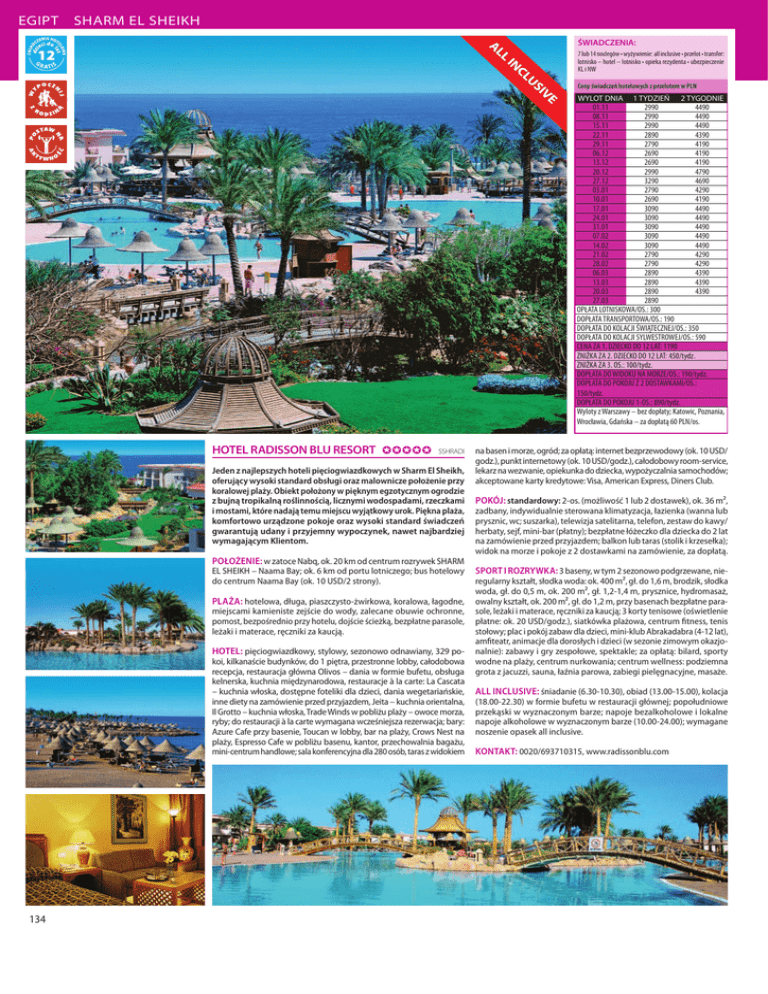 EGIPT SHARM EL SHEIKH ŚWIADCZENIA: 12 7 lub 14 noclegów • wyżywienie: all inclusive • przelot • transfer: lotnisko – hotel – lotnisko • opieka rezydenta • ubezpieczenie KL i NW Ceny świadczeń hotelowych z przelotem w PLN WYLOT DNIA 1 TYDZIEŃ 2 TYGODNIE 01.11 2990 4490 08.11 2990 4490 15.11 2990 4490 22.11 2890 4390 29.11 2790 4190 06.12 2690 4190 13.12 2690 4190 20.12 2990 4790 27.12 3290 4690 03.01 2790 4290 10.01 2690 4190 17.01 3090 4490 24.01 3090 4490 31.01 3090 4490 07.02 3090 4490 14.02 3090 4490 21.02 2790 4290 28.02 2790 4290 06.03 2890 4390 13.03 2890 4390 20.03 2890 4390 27.03 2890 OPŁATA LOTNISKOWA/OS.: 300 DOPŁATA TRANSPORTOWA/OS.: 190 DOPŁATA DO KOLACJI ŚWIĄTECZNEJ/OS.: 350 DOPŁATA DO KOLACJI SYLWESTROWEJ/OS.: 590 CENA ZA 1. DZIECKO DO 12 LAT: 1190 ZNIŻKA ZA 2. DZIECKO DO 12 LAT: 450/tydz. ZNIŻKA ZA 3. OS.: 100/tydz. DOPŁATA DO WIDOKU NA MORZE/OS.: 190/tydz. DOPŁATA DO POKOJU Z 2 DOSTAWKAMI/OS.: 150/tydz. DOPŁATA DO POKOJU 1-OS.: 890/tydz. Wyloty z Warszawy – bez dopłaty; Katowic, Poznania, Wrocławia, Gdańska – za dopłatą 60 PLN/os. HOTEL RADISSON BLU RESORT SSHRADI Jeden z najlepszych hoteli pięciogwiazdkowych w Sharm El Sheikh, oferujący wysoki standard obsługi oraz malownicze położenie przy koralowej plaży. Obiekt położony w pięknym egzotycznym ogrodzie z bujną tropikalną roślinnością, licznymi wodospadami, rzeczkami i mostami, które nadają temu miejscu wyjątkowy urok. Piękna plaża, komfortowo urządzone pokoje oraz wysoki standard świadczeń gwarantują udany i przyjemny wypoczynek, nawet najbardziej wymagającym Klientom. na basen i morze, ogród; za opłatą: internet bezprzewodowy (ok. 10 USD/ godz.), punkt internetowy (ok. 10 USD/godz.), całodobowy room-service, lekarz na wezwanie, opiekunka do dziecka, wypożyczalnia samochodów; akceptowane karty kredytowe: Visa, American Express, Diners Club. POKÓJ: standardowy: 2-os. (możliwość 1 lub 2 dostawek), ok. 36 m², zadbany, indywidualnie sterowana klimatyzacja, łazienka (wanna lub prysznic, wc; suszarka), telewizja satelitarna, telefon, zestaw do kawy/ herbaty, sejf, mini-bar (płatny); bezpłatne łóżeczko dla dziecka do 2 lat na zamówienie przed przyjazdem; balkon lub taras (stolik i krzesełka); widok na morze i pokoje z 2 dostawkami na zamówienie, za dopłatą. POŁOŻENIE: w zatoce Nabq, ok. 20 km od centrum rozrywek SHARM EL SHEIKH – Naama Bay; ok. 6 km od portu lotniczego; bus hotelowy do centrum Naama Bay (ok. 10 USD/2 strony). PLAŻA: hotelowa, długa, piaszczysto-żwirkowa, koralowa, łagodne, miejscami kamieniste zejście do wody, zalecane obuwie ochronne, pomost, bezpośrednio przy hotelu, dojście ścieżką, bezpłatne parasole, leżaki i materace, ręczniki za kaucją. HOTEL: pięciogwiazdkowy, stylowy, sezonowo odnawiany, 329 pokoi, kilkanaście budynków, do 1 piętra, przestronne lobby, całodobowa recepcja, restauracja główna Olivos – dania w formie bufetu, obsługa kelnerska, kuchnia międzynarodowa, restauracje à la carte: La Cascata – kuchnia włoska, dostępne foteliki dla dzieci, dania wegetariańskie, inne diety na zamówienie przed przyjazdem, Jeita – kuchnia orientalna, Il Grotto – kuchnia włoska, Trade Winds w pobliżu plaży – owoce morza, ryby; do restauracji à la carte wymagana wcześniejsza rezerwacja; bary: Azure Cafe przy basenie, Toucan w lobby, bar na plaży, Crows Nest na plaży, Espresso Cafe w pobliżu basenu, kantor, przechowalnia bagażu, mini-centrum handlowe; sala konferencyjna dla 280 osób, taras z widokiem 134 SPORT I ROZRYWKA: 3 baseny, w tym 2 sezonowo podgrzewane, nieregularny kształt, słodka woda: ok. 400 m², gł. do 1,6 m, brodzik, słodka woda, gł. do 0,5 m, ok. 200 m², gł. 1,2-1,4 m, prysznice, hydromasaż, owalny kształt, ok. 200 m², gł. do 1,2 m, przy basenach bezpłatne parasole, leżaki i materace, ręczniki za kaucją; 3 korty tenisowe (oświetlenie płatne: ok. 20 USD/godz.), siatkówka plażowa, centrum fitness, tenis stołowy; plac i pokój zabaw dla dzieci, mini-klub Abrakadabra (4-12 lat), amfiteatr, animacje dla dorosłych i dzieci (w sezonie zimowym okazjonalnie): zabawy i gry zespołowe, spektakle; za opłatą: bilard, sporty wodne na plaży, centrum nurkowania; centrum wellness: podziemna grota z jacuzzi, sauna, łaźnia parowa, zabiegi pielęgnacyjne, masaże. ALL INCLUSIVE: śniadanie (6.30-10.30), obiad (13.00-15.00), kolacja (18.00-22.30) w formie bufetu w restauracji głównej; popołudniowe przekąski w wyznaczonym barze; napoje bezalkoholowe i lokalne napoje alkoholowe w wyznaczonym barze (10.00-24.00); wymagane noszenie opasek all inclusive. KONTAKT: 0020/693710315, www.radissonblu.com